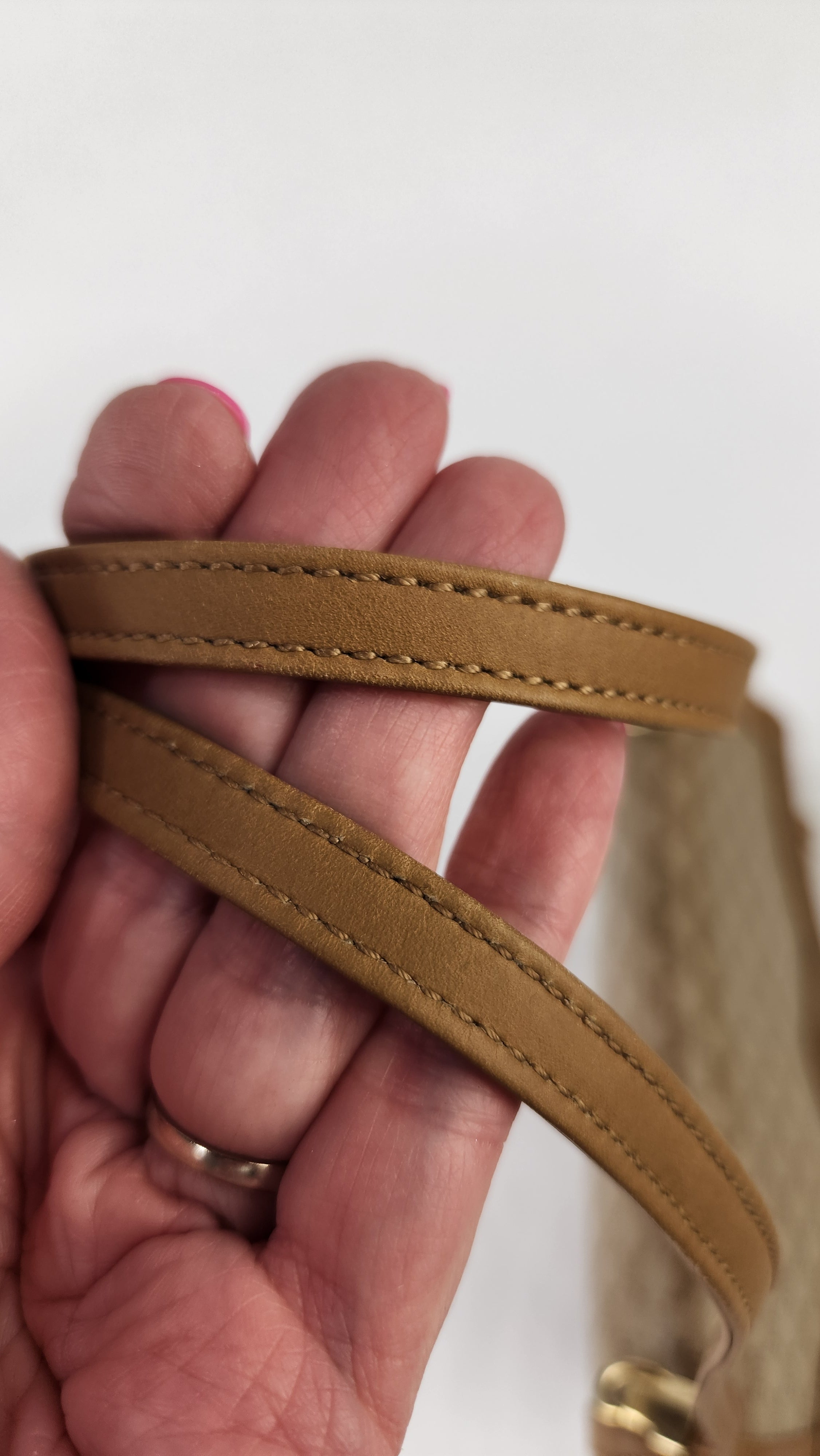 Condition details: In great condition; outside beige macadam pvc coated canvas is in great condition with some signs minor of wear. Leather trim is in great condition with some signs of wear and rubbing on corners. Leather strap is in great condition with some signs of wear and light rubbing and curling from storage. Gold toned hardware is in great condition with some signs of wear and rubbing and minor silvering in areas; magnetic closure and internal zipper work well. Inside is clean with some signs of wear, no foul smell.