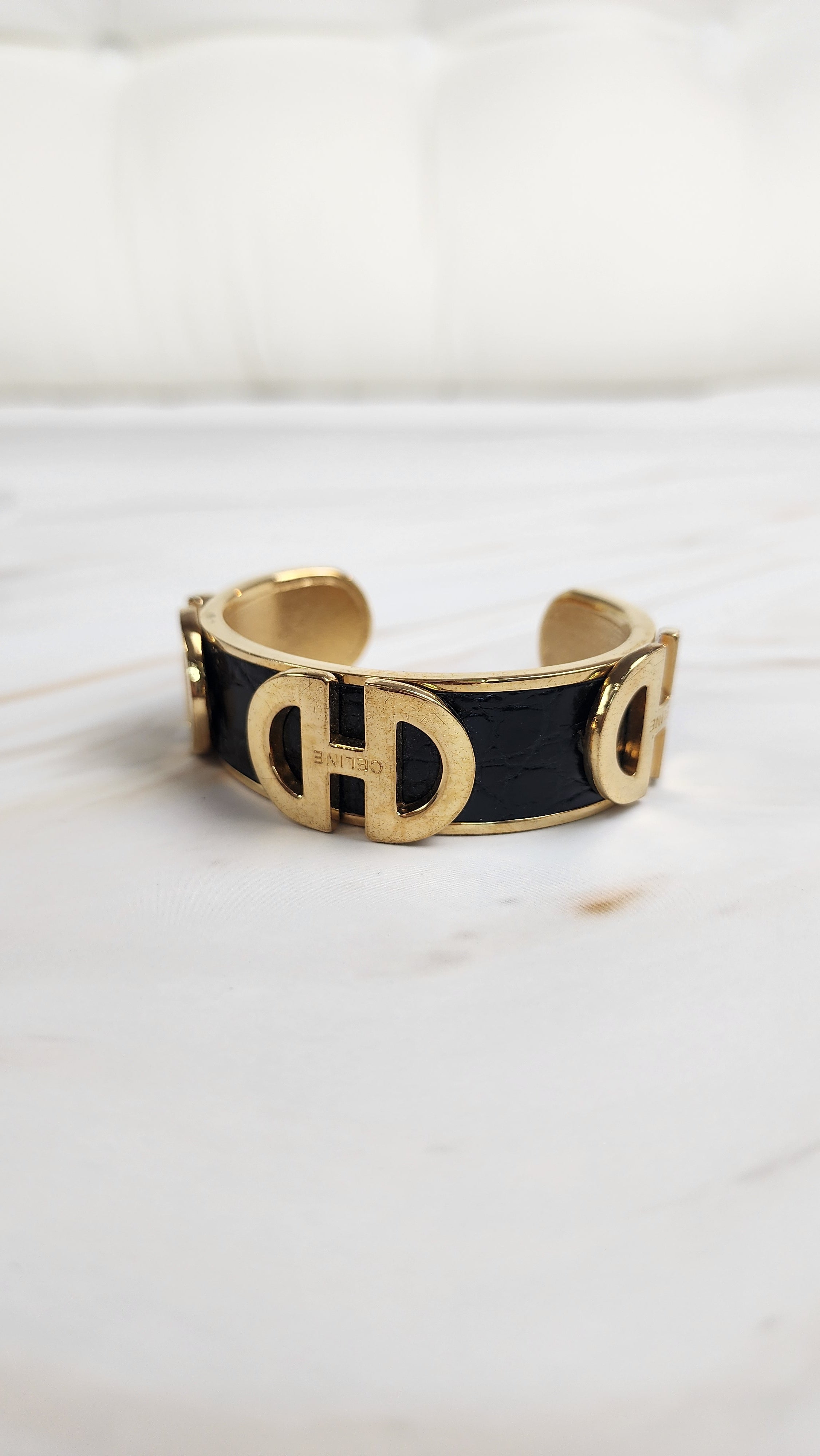Condition details: In great condition; black textured leather is in great condition with some signs of wear. Gold toned hardware is in great condition with some signs of wear throughout.