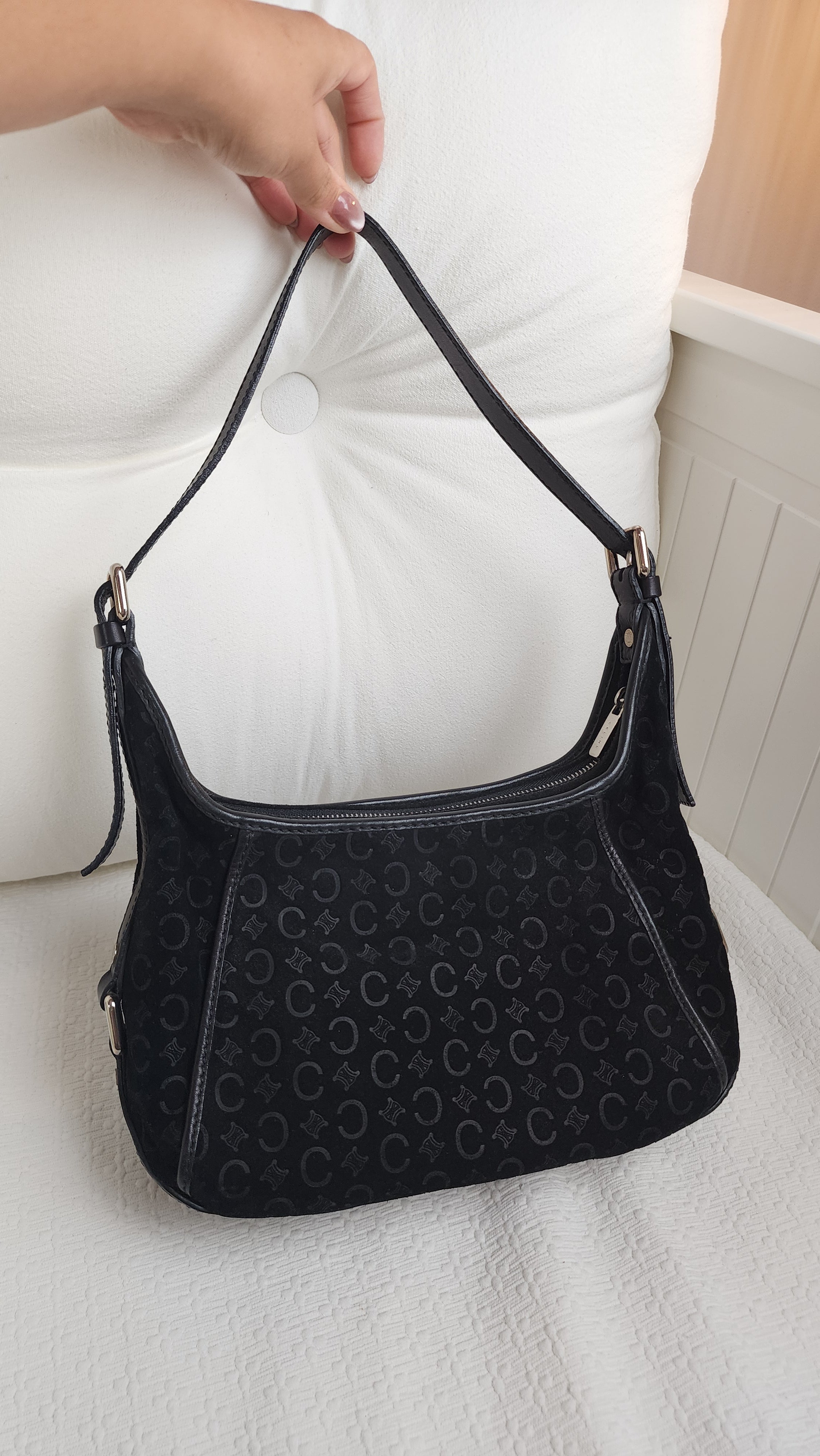 Condition details: This item is in great condition; black suede is in great condition with some signs of wear throughout. Black leather trim and shoulder strap are in great condition with some signs of wear. Corners are in great condition with some signs of wear. Silver toned hardware has some signs of wear, zipper works well. Inside is clean, no foul smell.