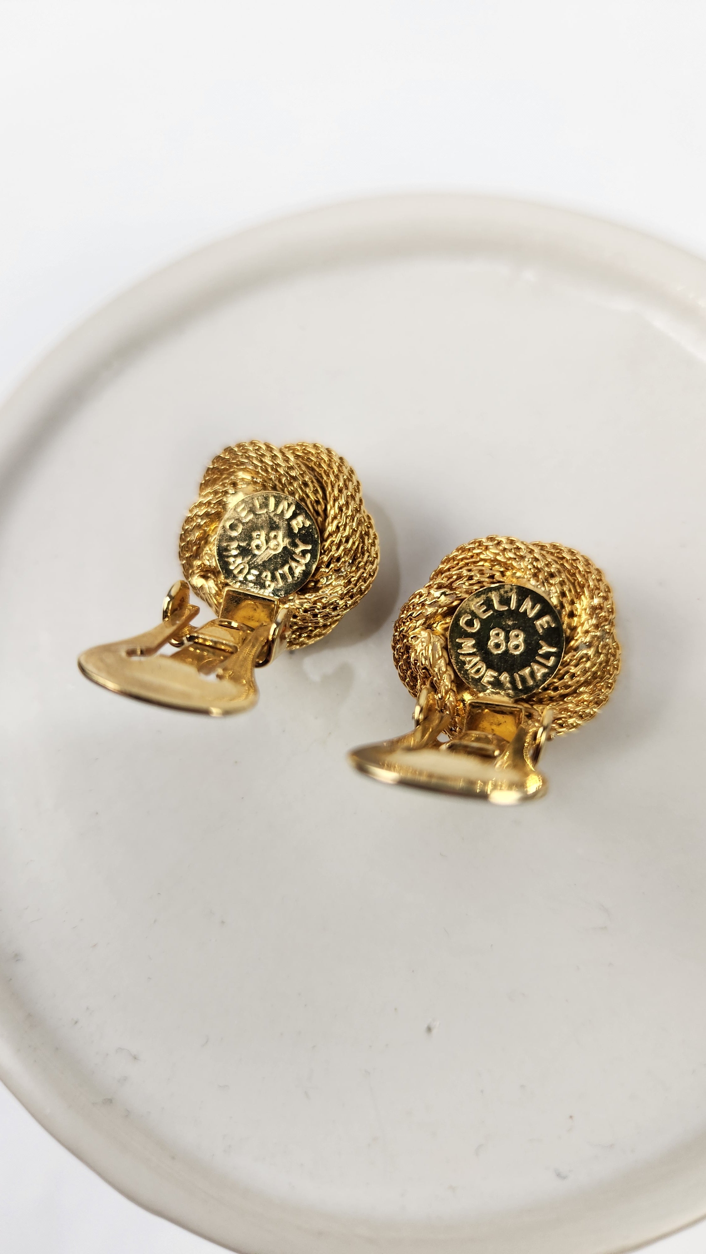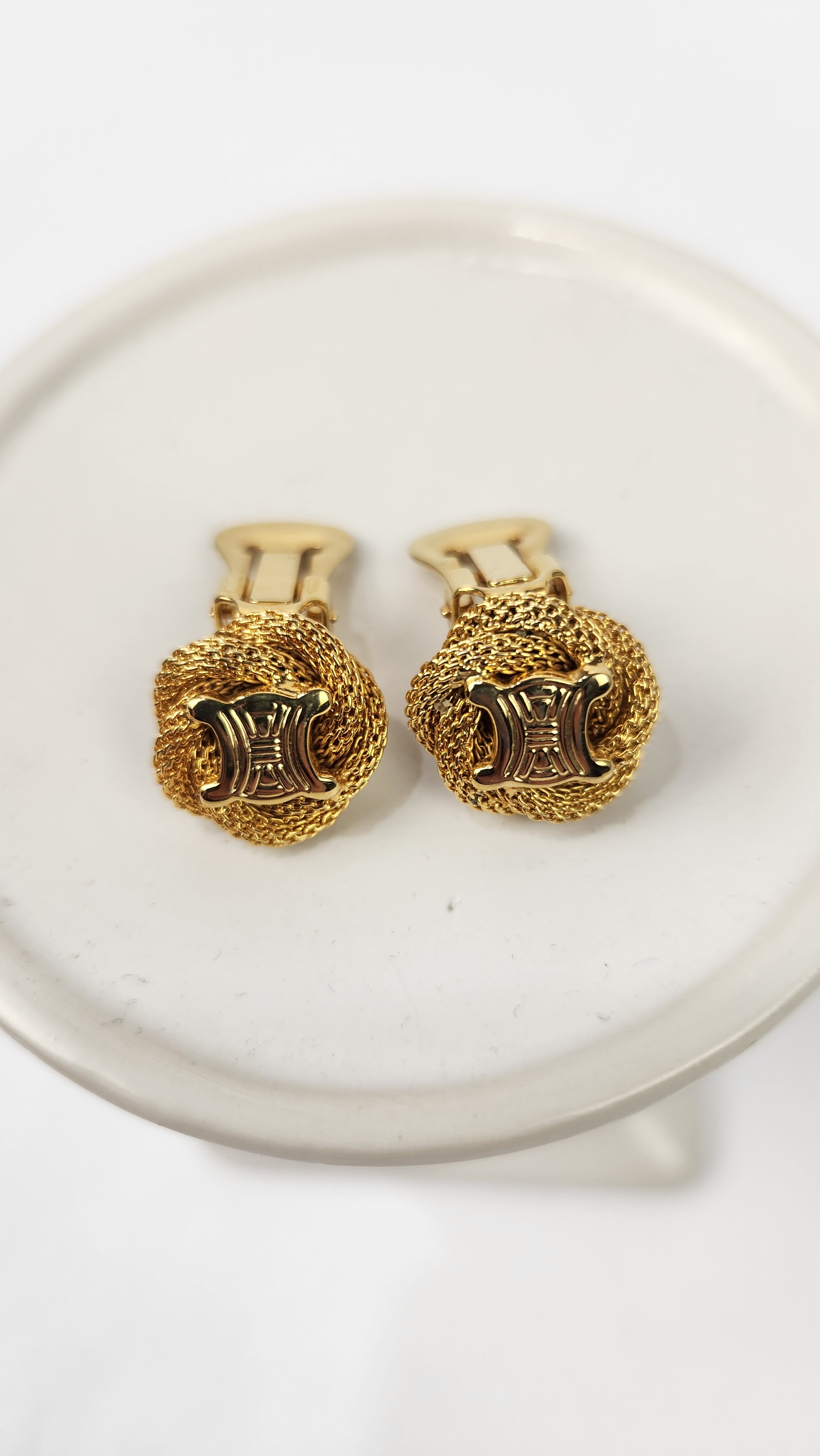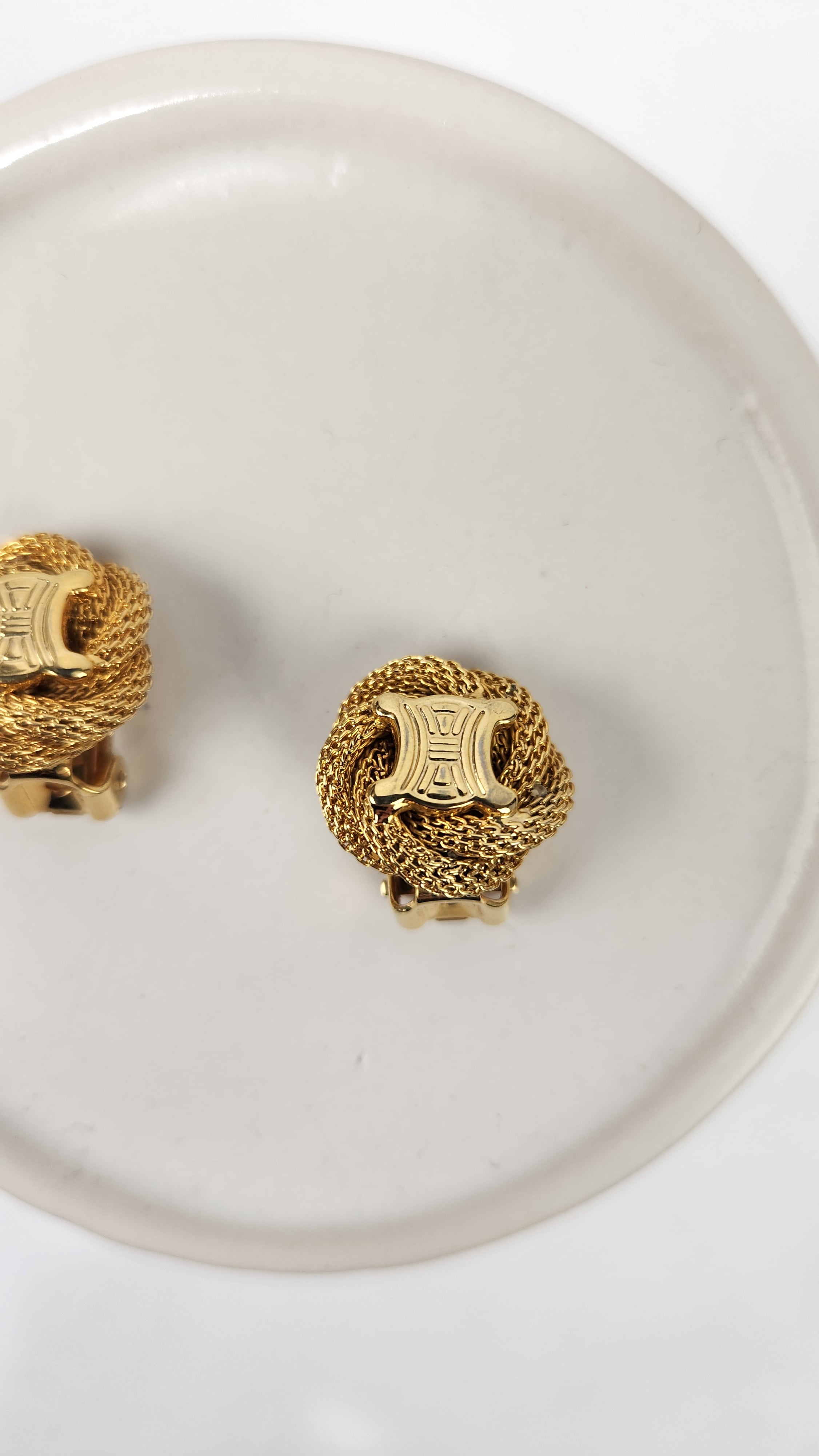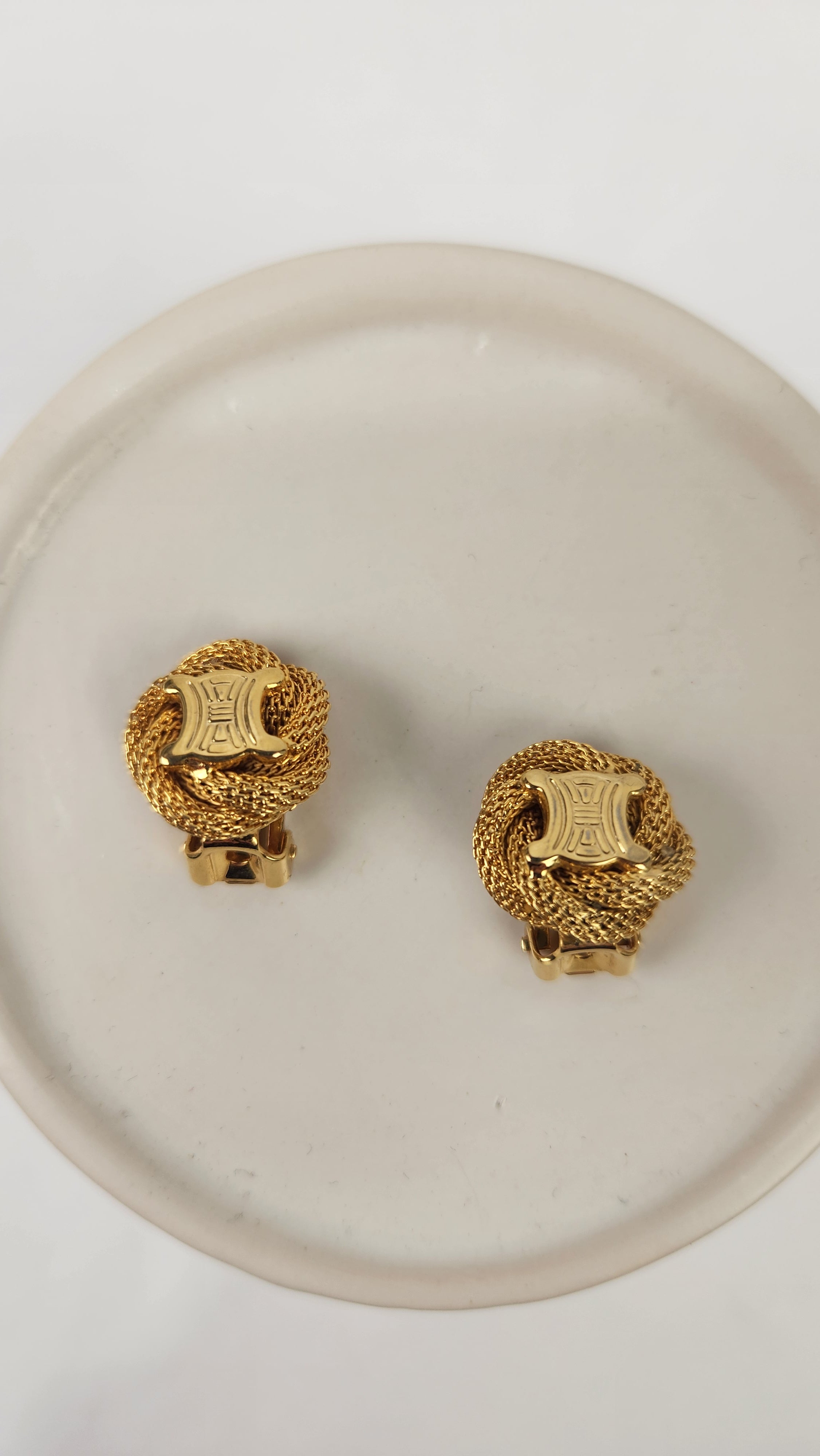 Condition details: Earrings are in great condition with a twisted rope pattern background with some signs of wear with Celine Triomphe logo in the center. Earrings are clip-ons and are tight and close well. Comes in an off market pouch and a Lusso & Lux box.