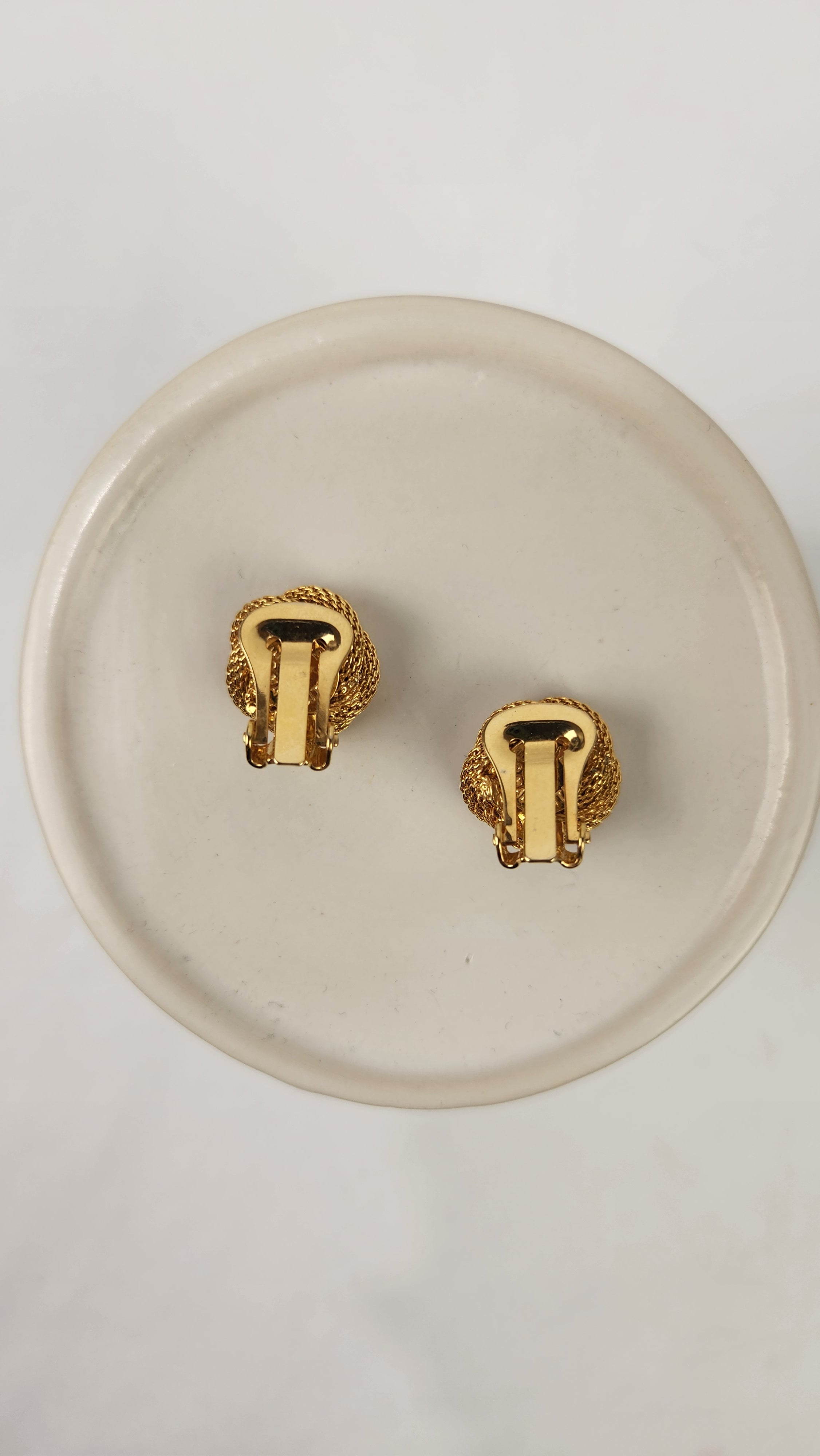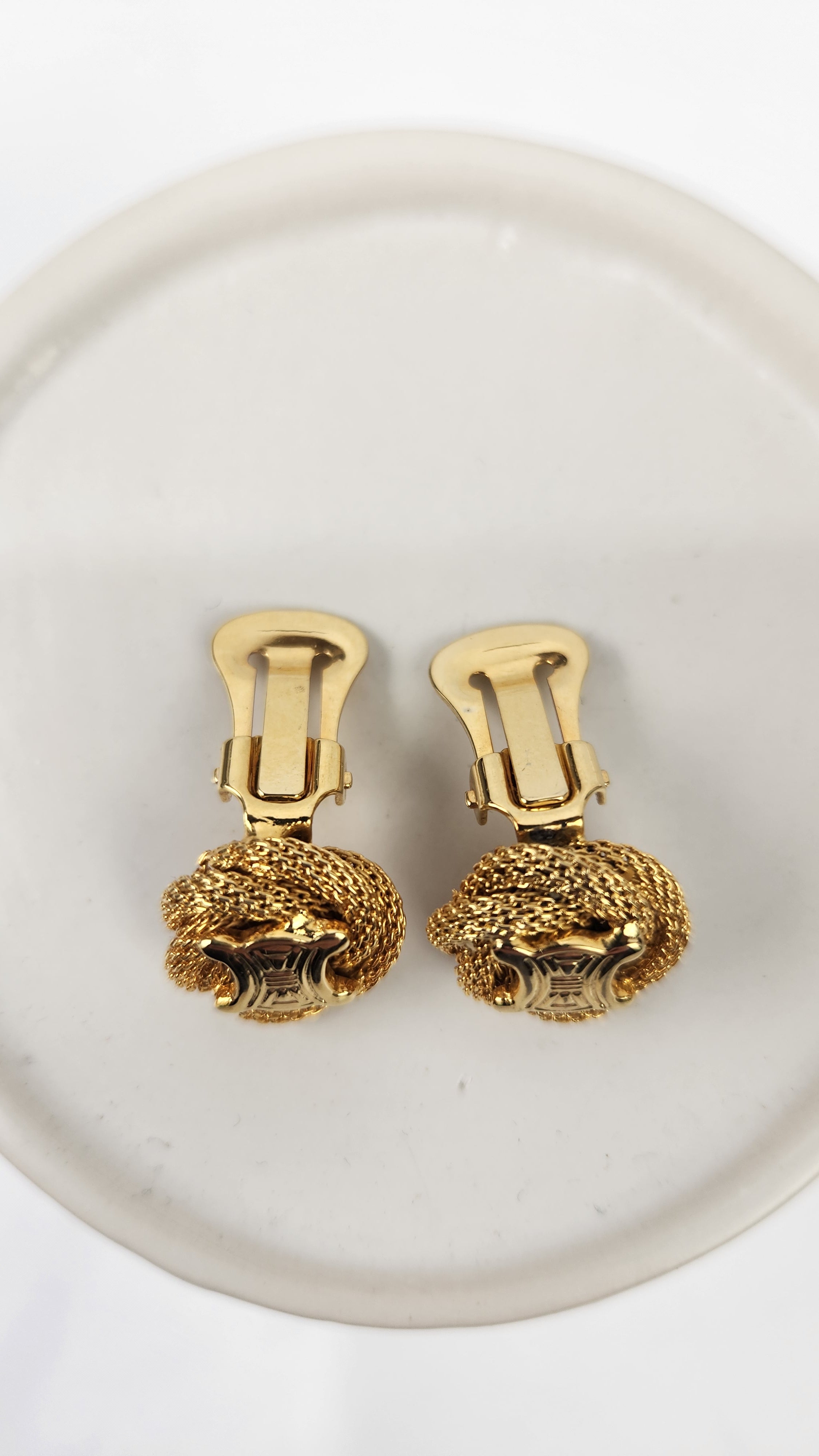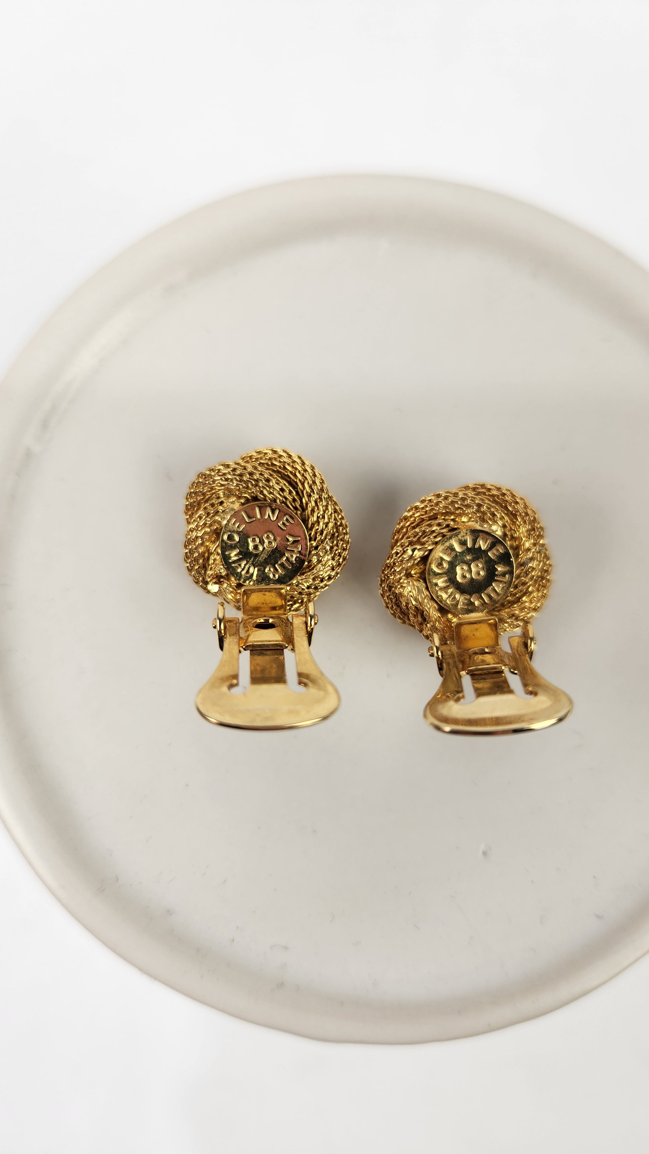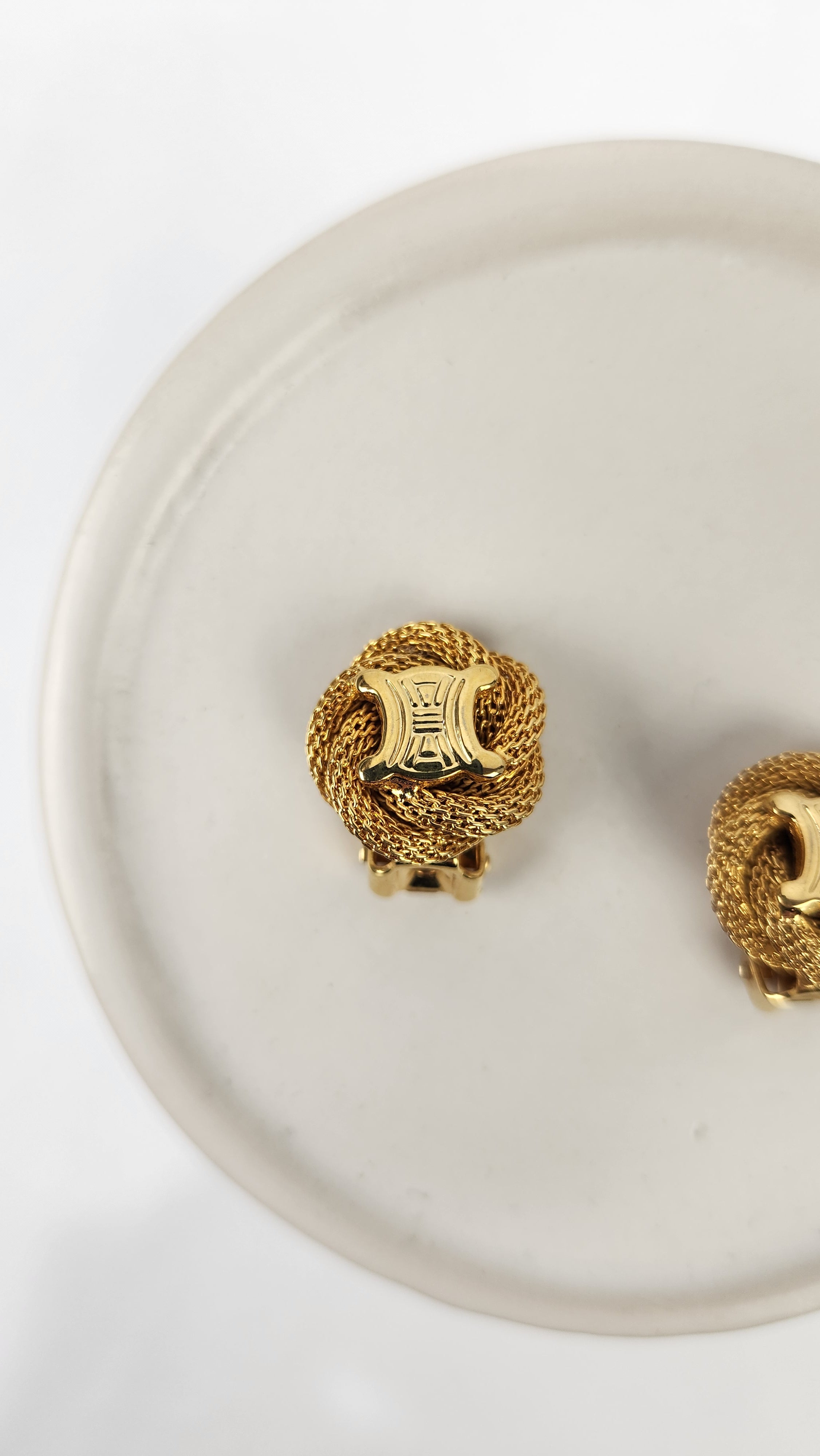 Condition details: Earrings are in great condition with a twisted rope pattern background with some signs of wear with Celine Triomphe logo in the center. Earrings are clip-ons and are tight and close well. Comes in an off market pouch and a Lusso & Lux box.