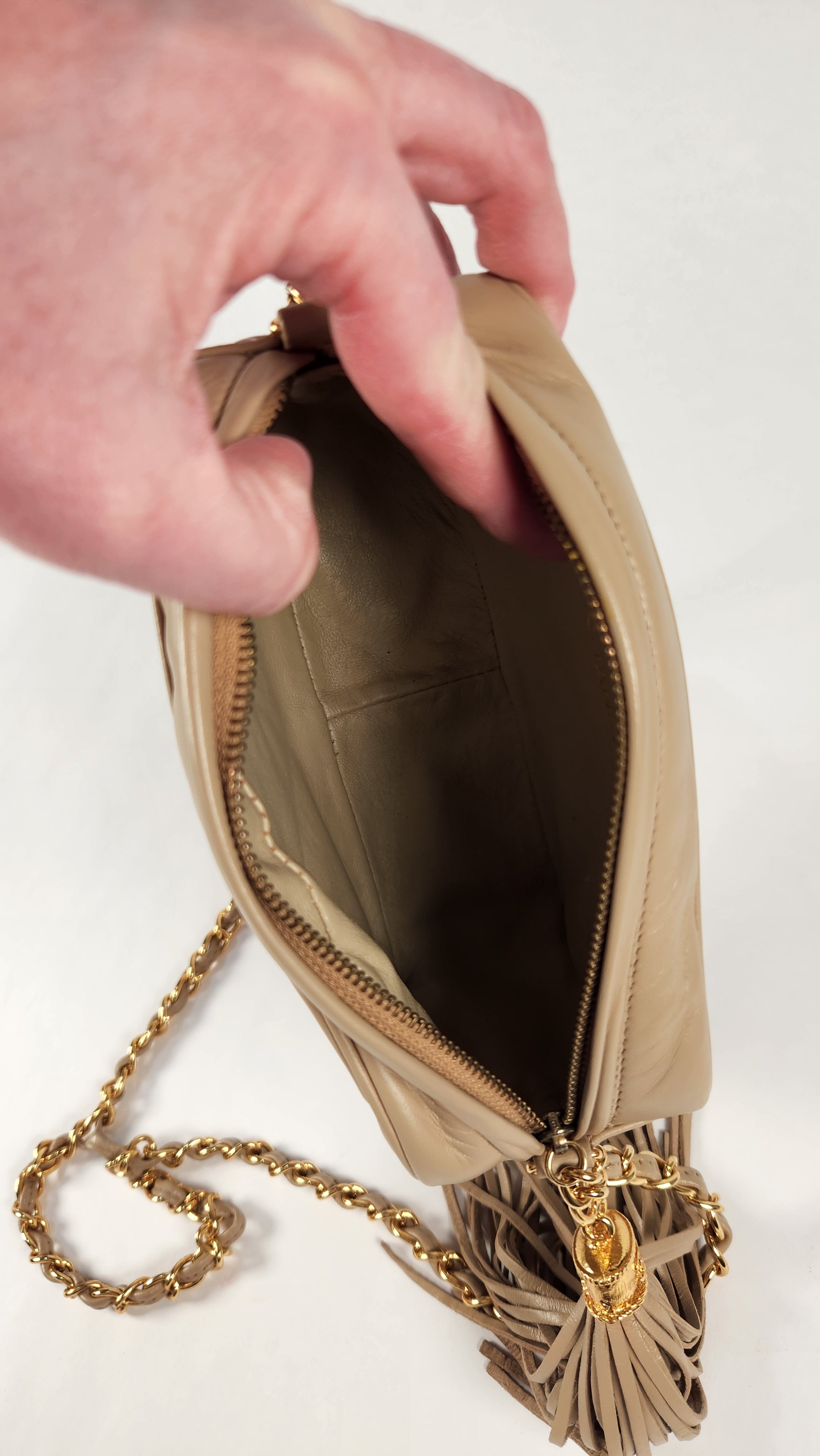 Condition details: This bag is in great, vintage condition as it has been fully restored. Outside leather is in excellent condition with some signs of wear. Hardware is a gold and in great condition and lovely and shiny. Leather straps with gold chain are in great condition with some signs of wear. Inside is clean, no foul smell. Comes with Authenticity Card.
