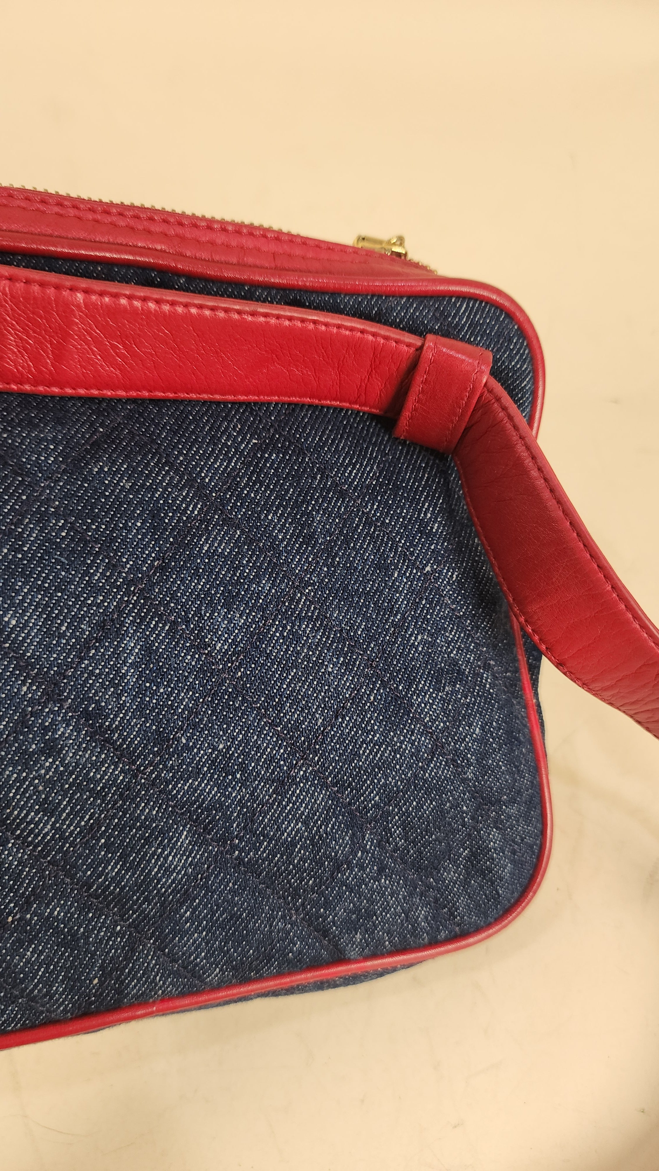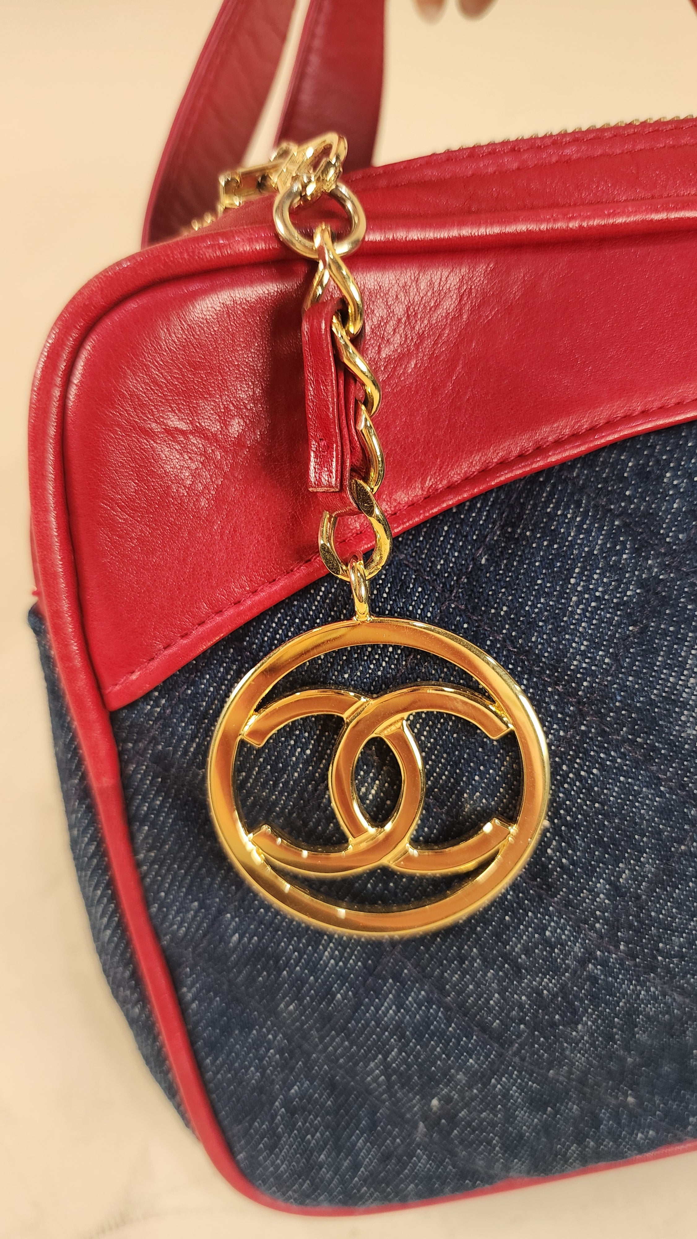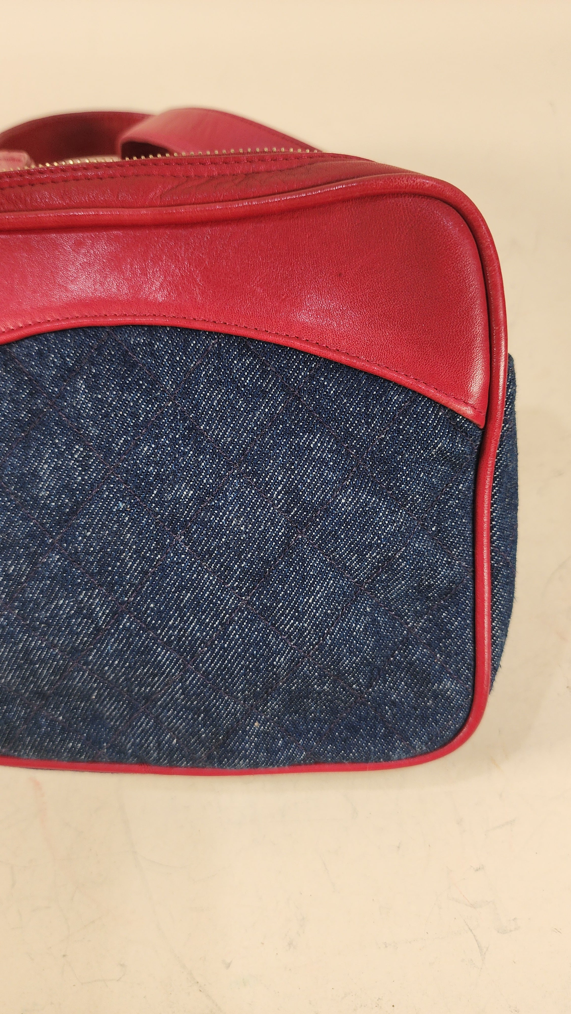 Condition details: This item is in great vintage condition; outside denim canvas fabric is in great condition with some sign of wear throughout. Red leather trim and edges are in great condition with some signs of wear and rubbing. Corners are in great condition with some signs of wear. Red leather belt is adjustable and in great condition with some signs of wear and creasing. Gold toned hardware is in great condition with some rubbing and signs of wear, zipper works well with gold toned CC zipper pull. Inside is clean, no foul smell. Serial number is in tact.