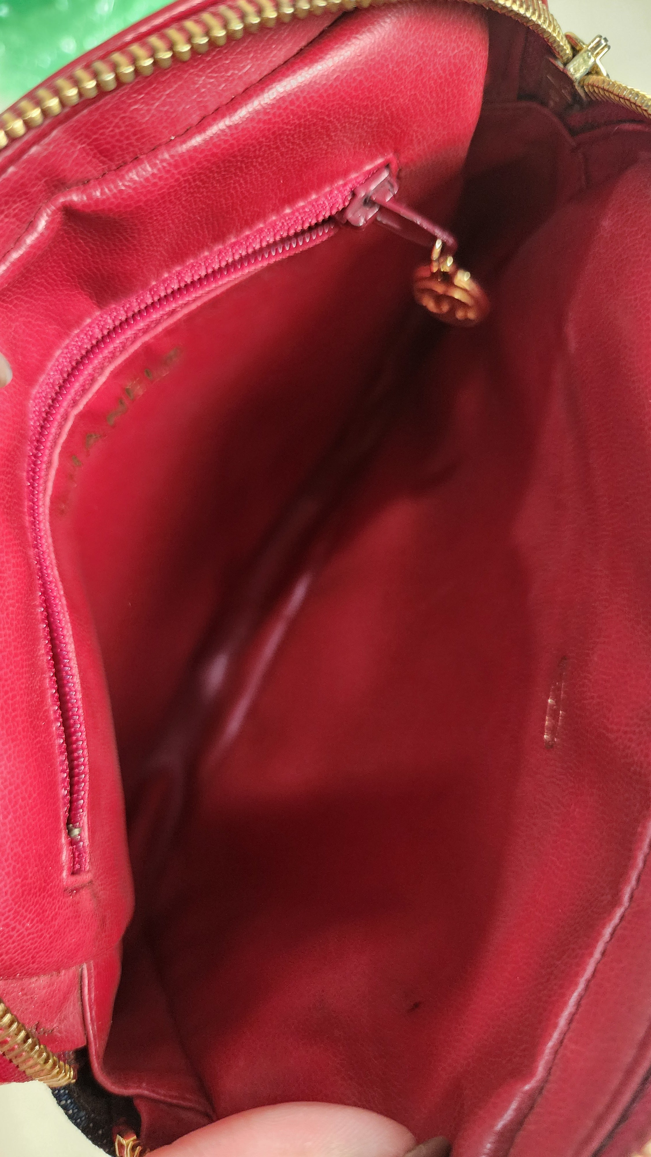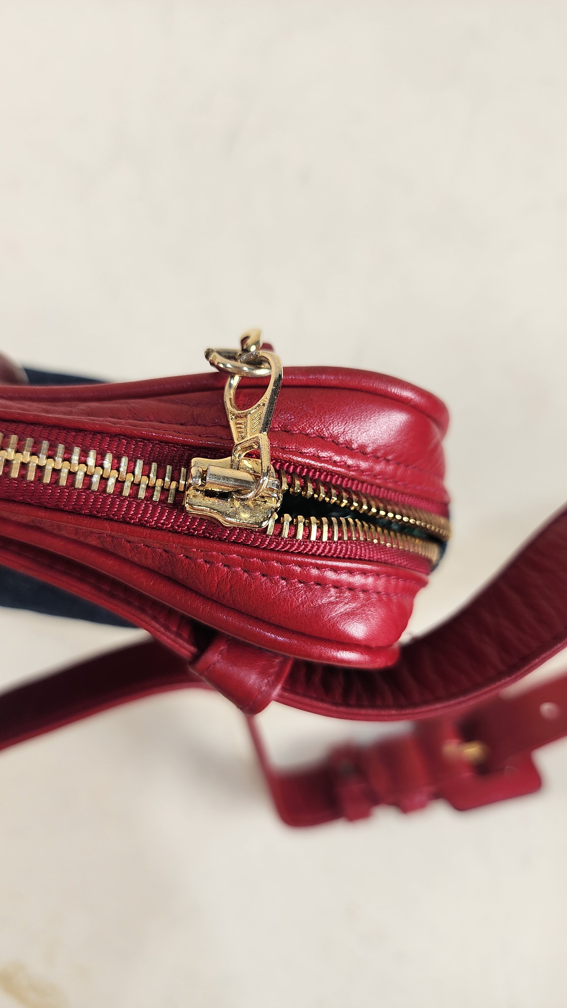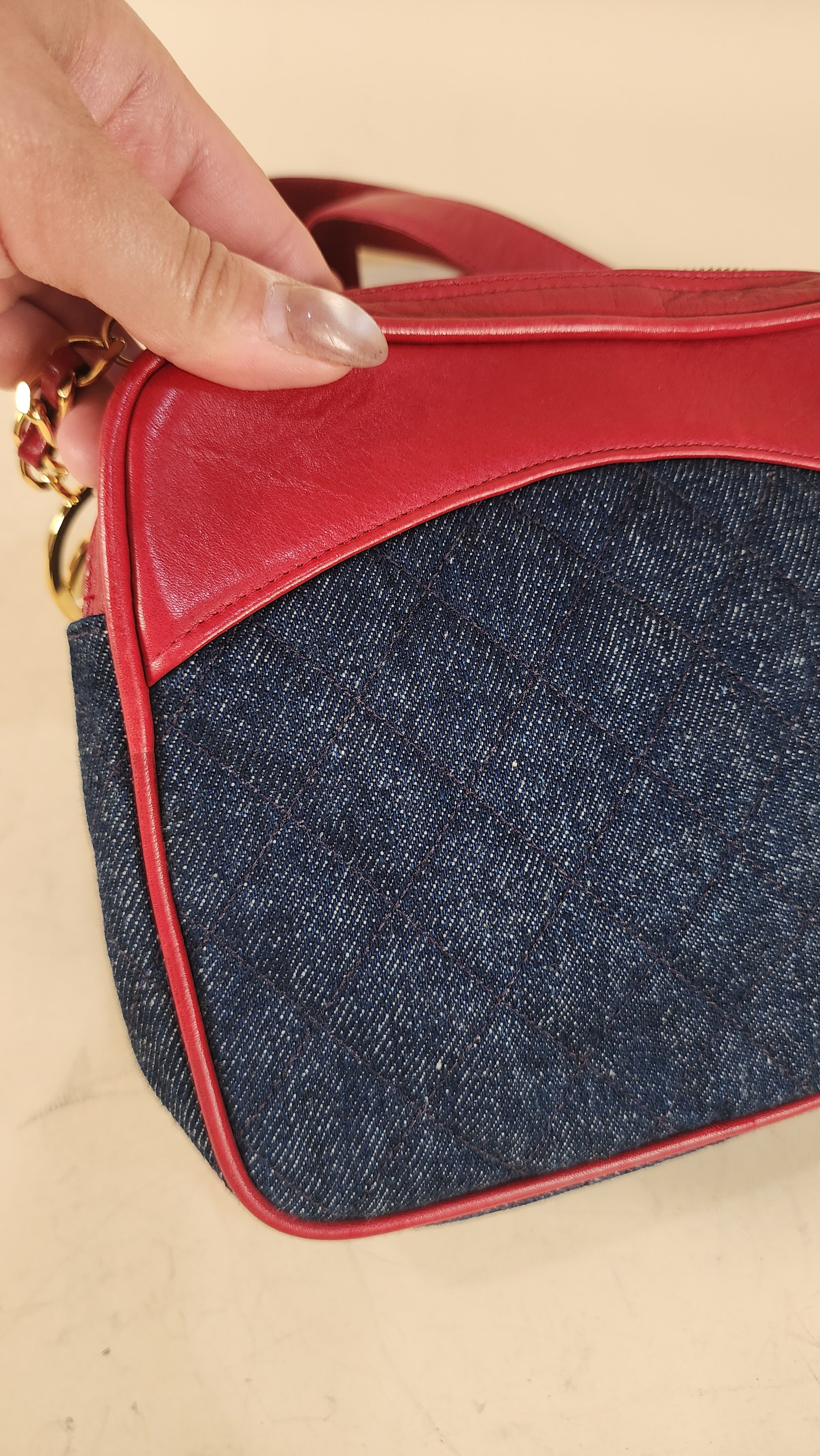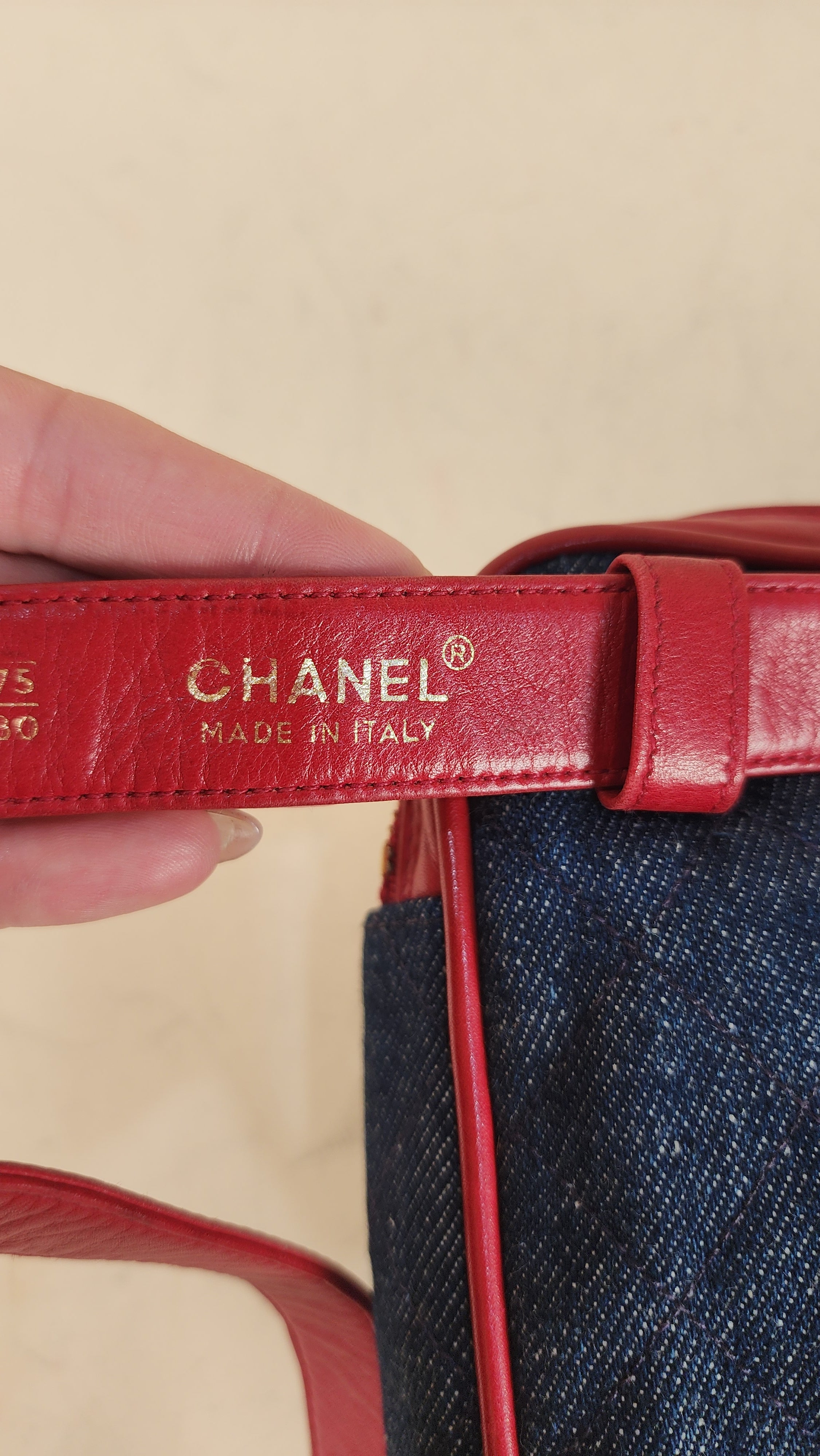 Condition details: This item is in great vintage condition; outside denim canvas fabric is in great condition with some sign of wear throughout. Red leather trim and edges are in great condition with some signs of wear and rubbing. Corners are in great condition with some signs of wear. Red leather belt is adjustable and in great condition with some signs of wear and creasing. Gold toned hardware is in great condition with some rubbing and signs of wear, zipper works well with gold toned CC zipper pull. Inside is clean, no foul smell. Serial number is in tact.
