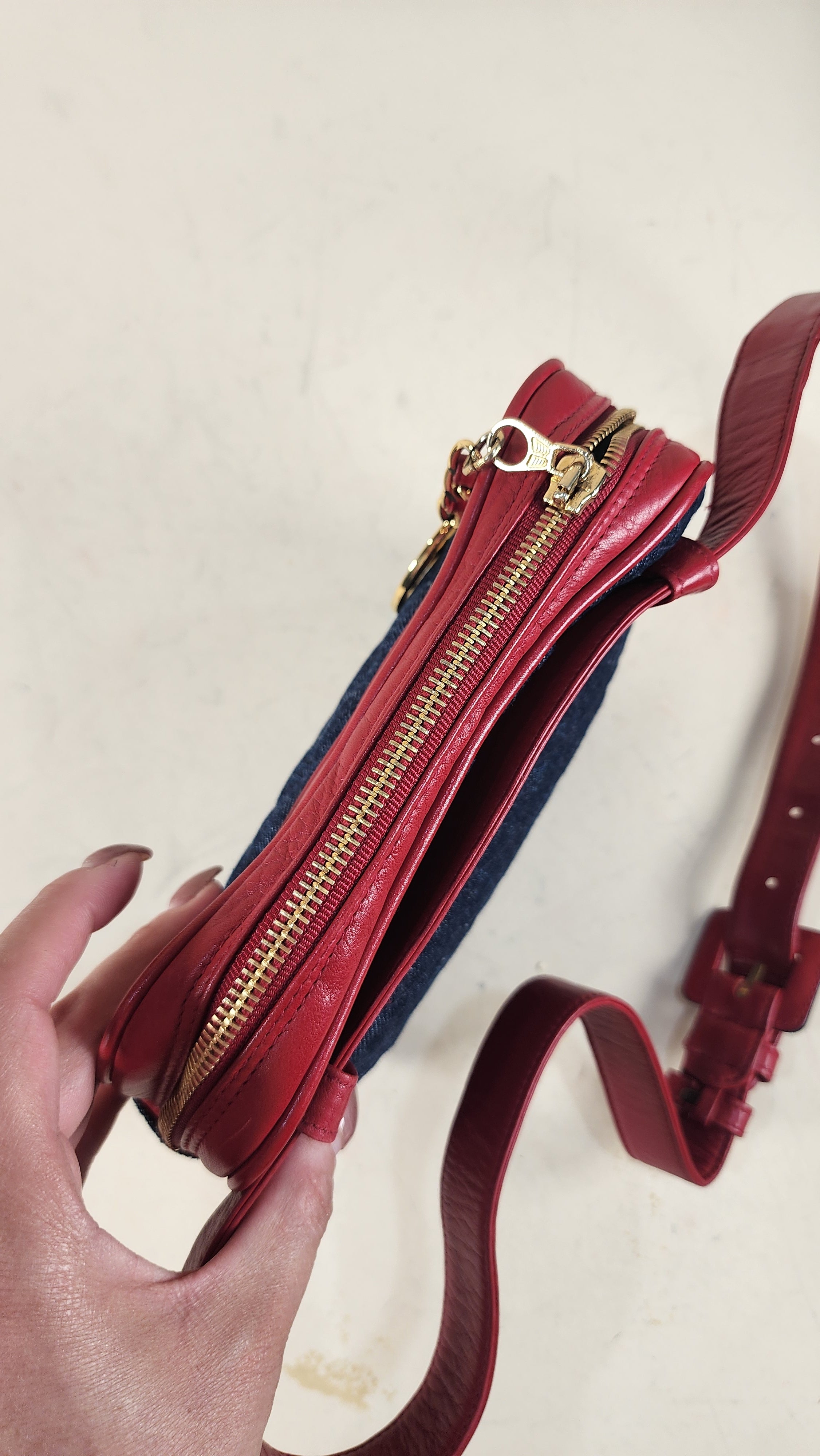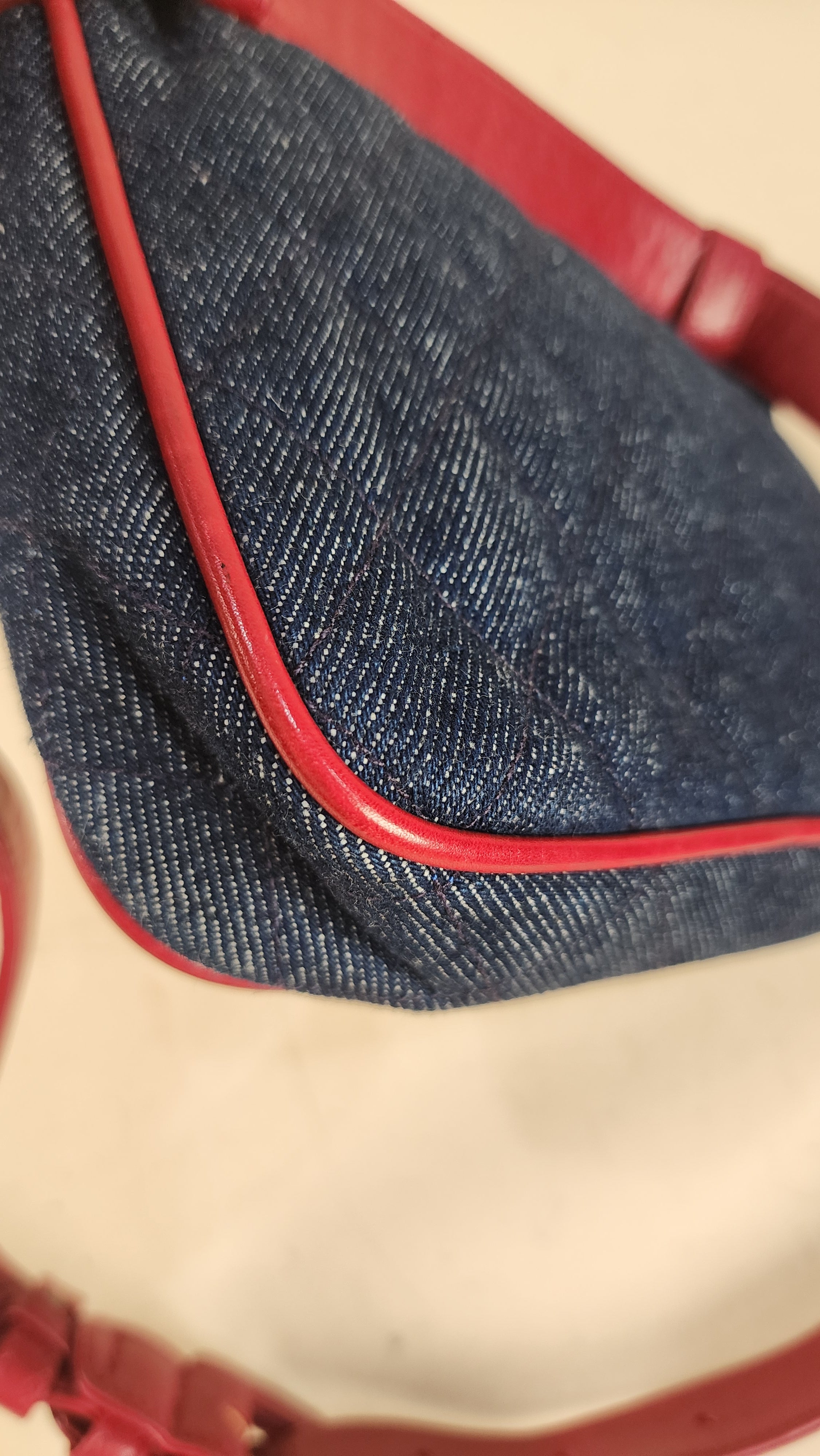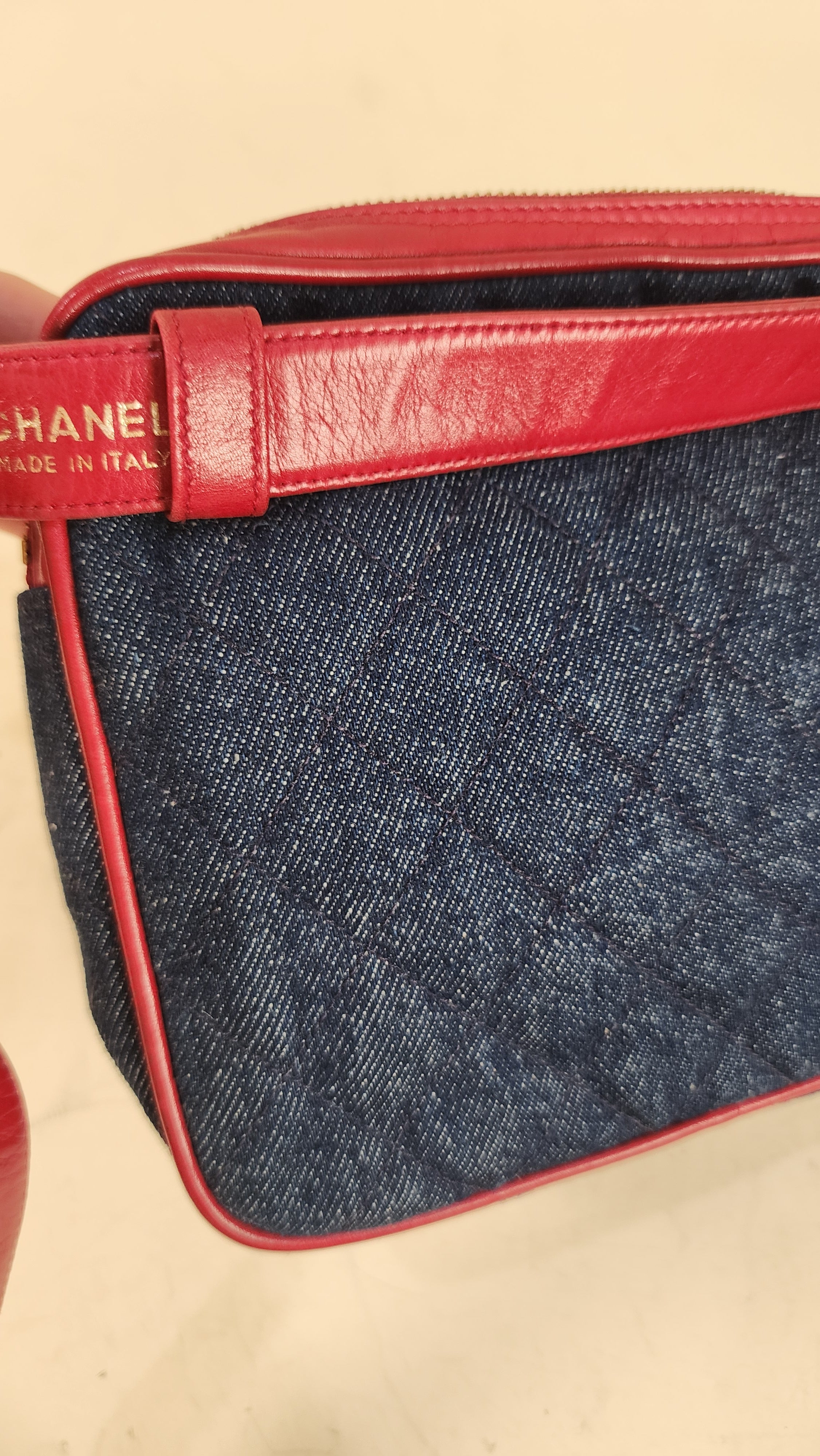 Chanel Denim & Red Leather Belt Bag. RARE FIND!