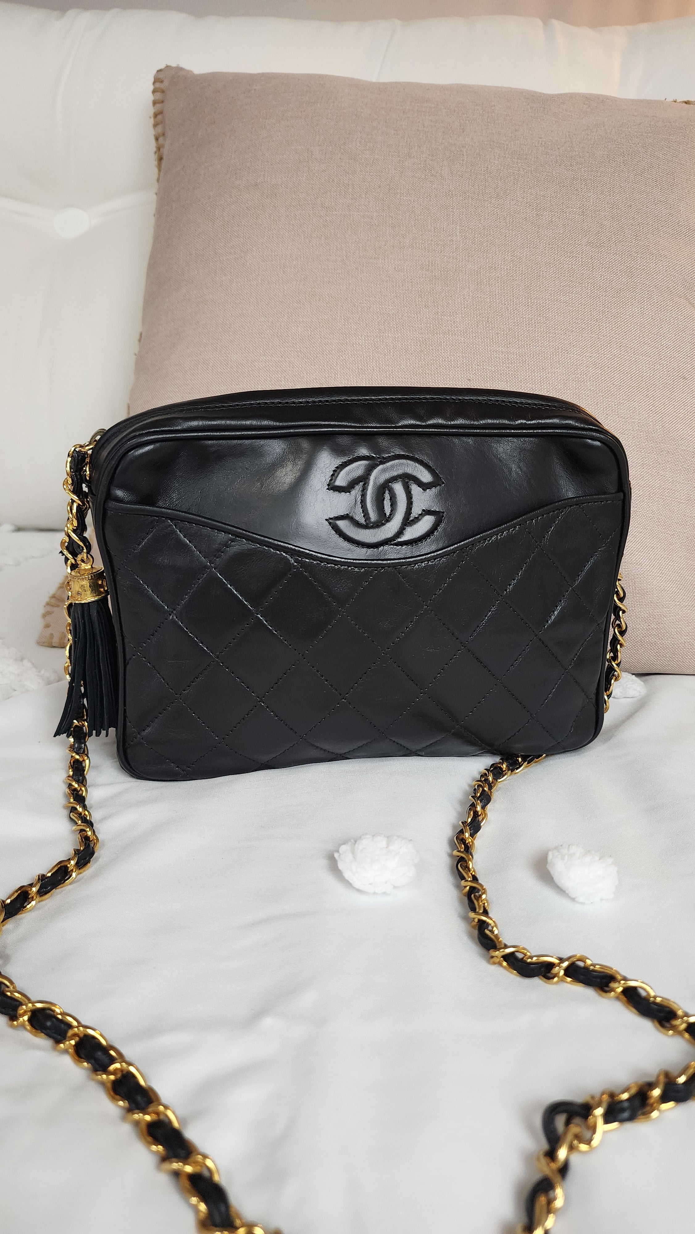 Condition details: This Chanel is in great vintage condition; outside leather is in great condition with some signs of wear. Corners are in excellent condition with some signs of wear. Gold tone chain and leather strap is in great condition with some signs of wear. Gold tone hardware is in great condition with some signs of wear, zippers work well; outside leather tassel zipper pull is in great condition. Inside is clean with some signs of wear, no foul smell. Serial number is in tact.