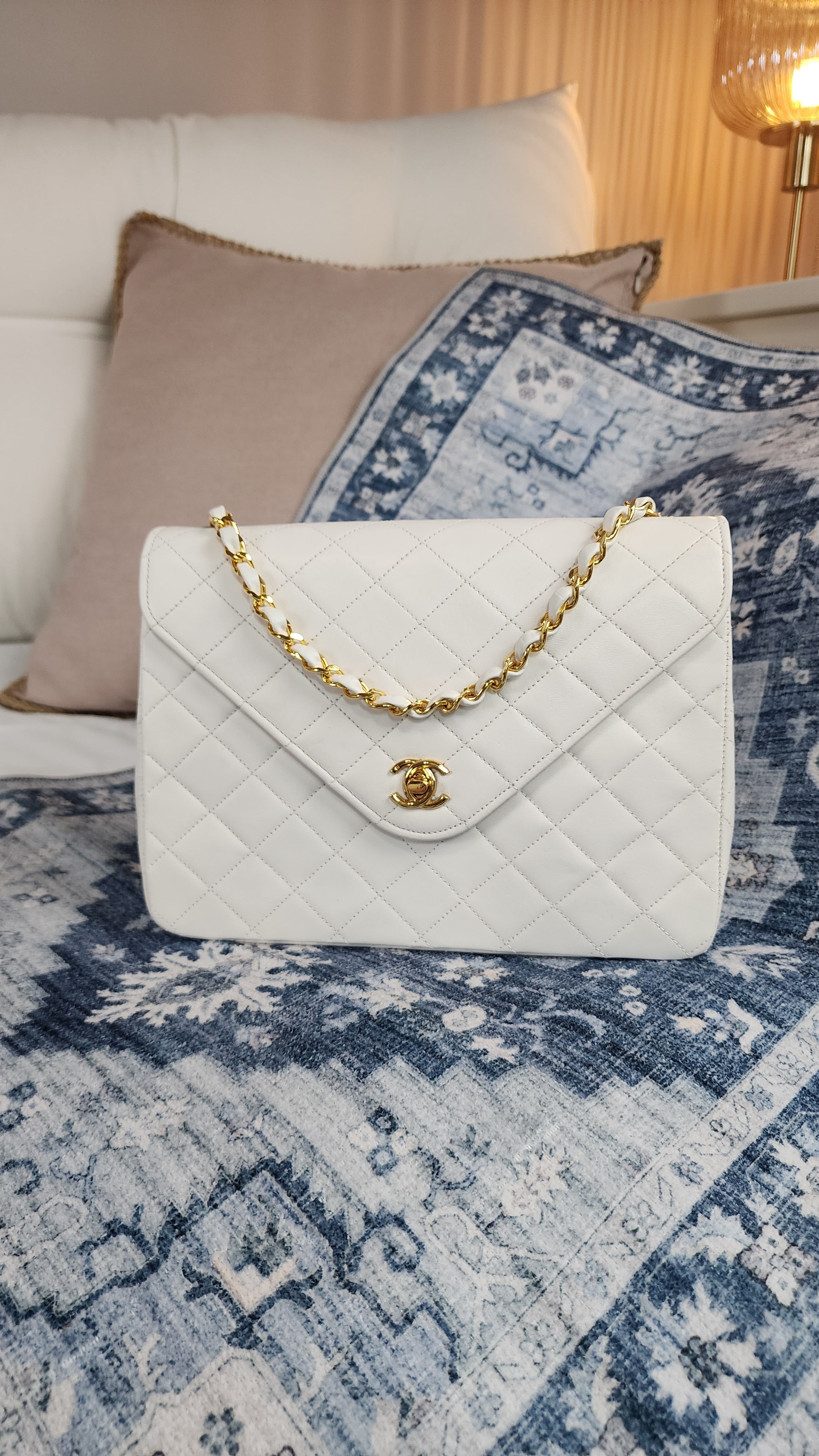 Condition details: This item is in great vintage condition. White leather is in great condition with some overall creasing but has a strong structure. Corners and edges are in great condition with some signs of wear. Gold 24 karat plated front CC turnlock is in great condition and still nice and shiny with no plate loss, internal zipper work well. Gold toned chain strap is in great condition. Inside is clean with some signs of wear, no foul smell. Serial number is partially in tact and has some signs of wear.