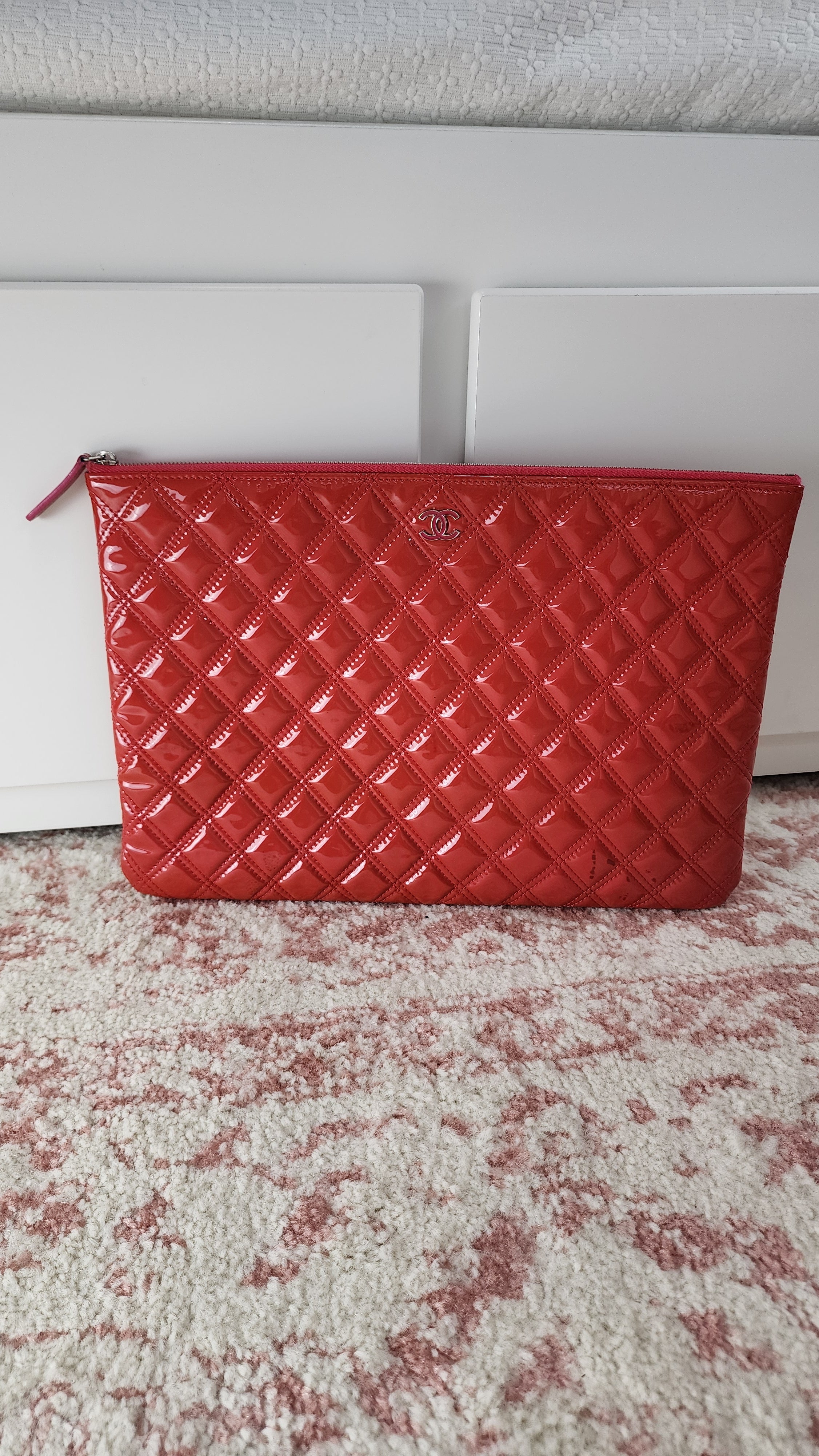 Condition details: This item is in great condition, outside quilted patent leather is in great condition with some signs of wear throughout and transfer marks in places on back and front, some are darker than others. Corners have some slight darkening and rubbing. Silver toned hardware is in great condition and still shiny with some signs of wear and rubbing, zipper works well. Inside is in great condition with some signs of wear, no foul smell. Serial number is in tact.