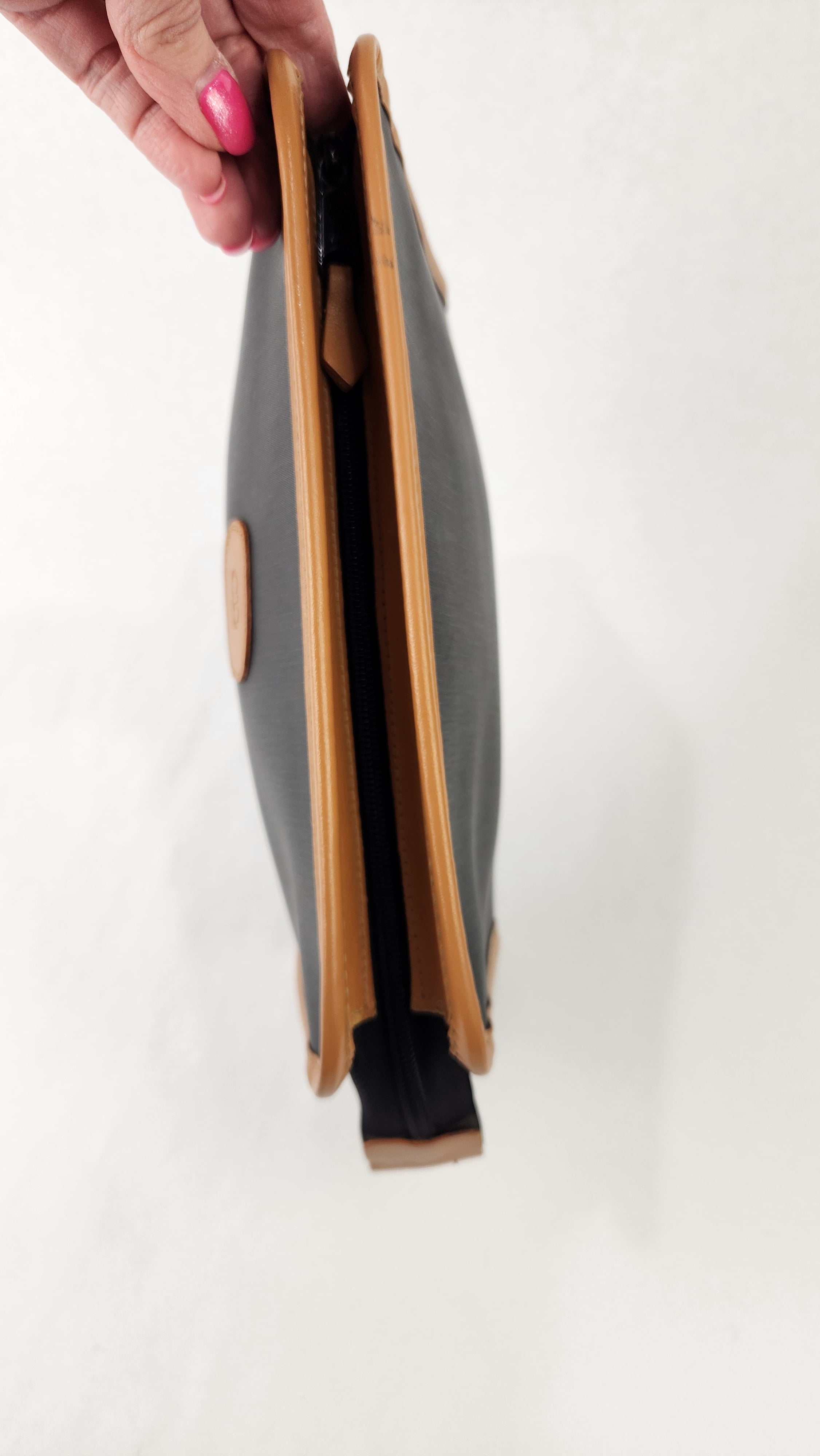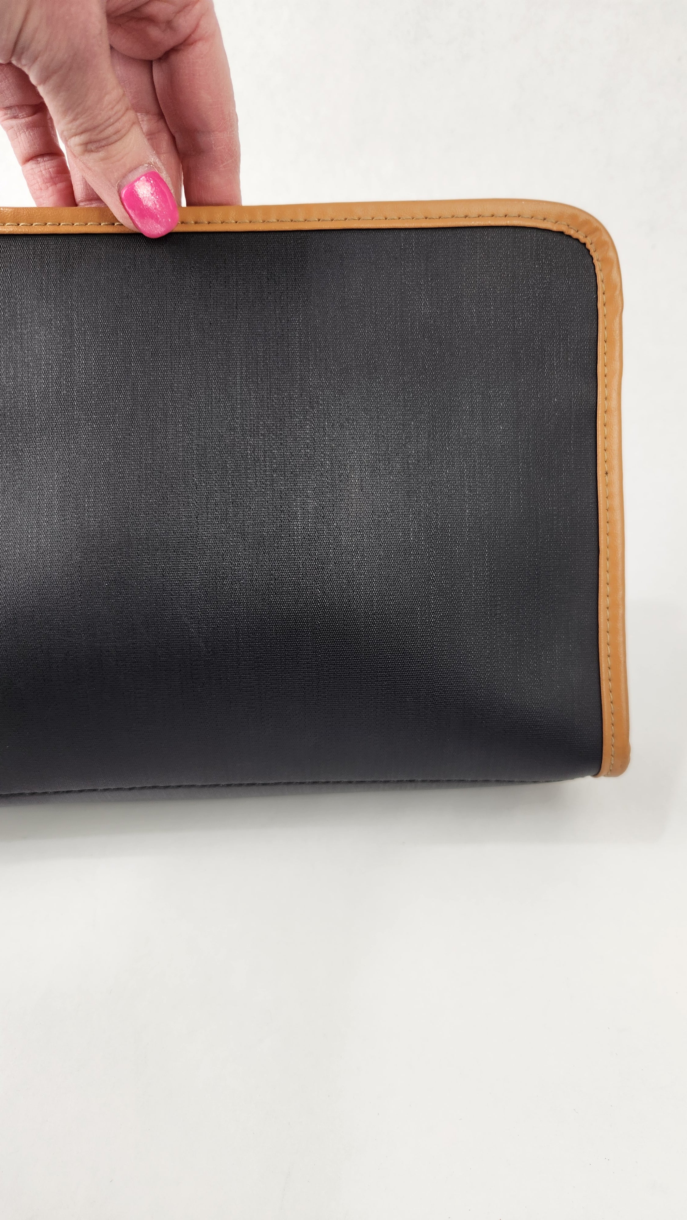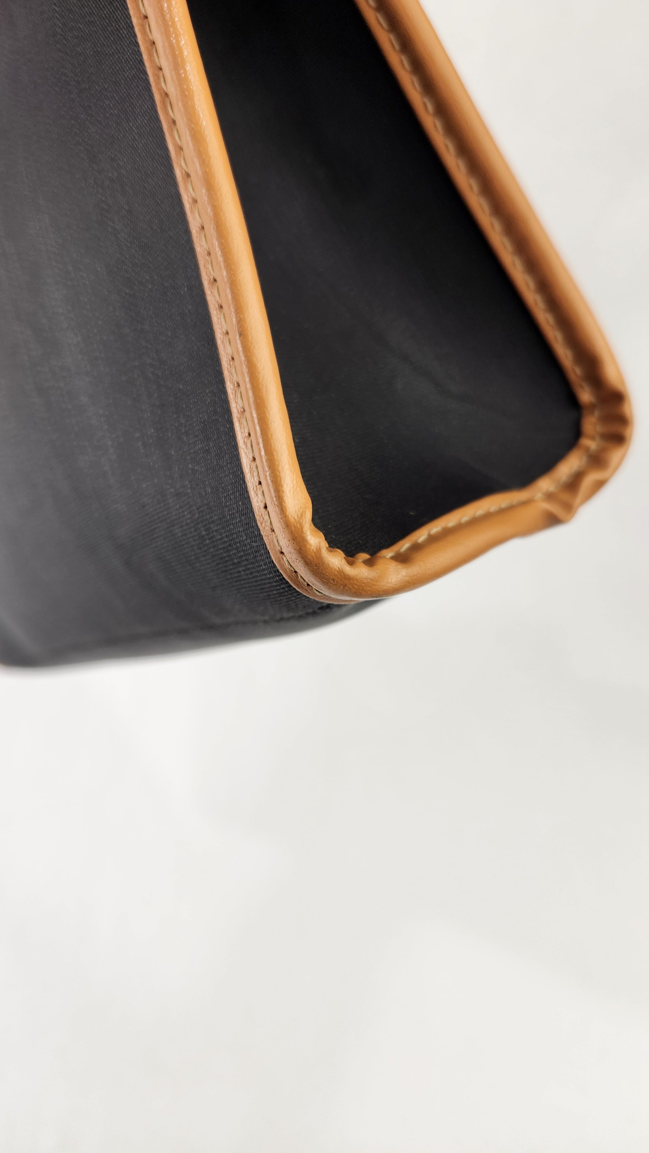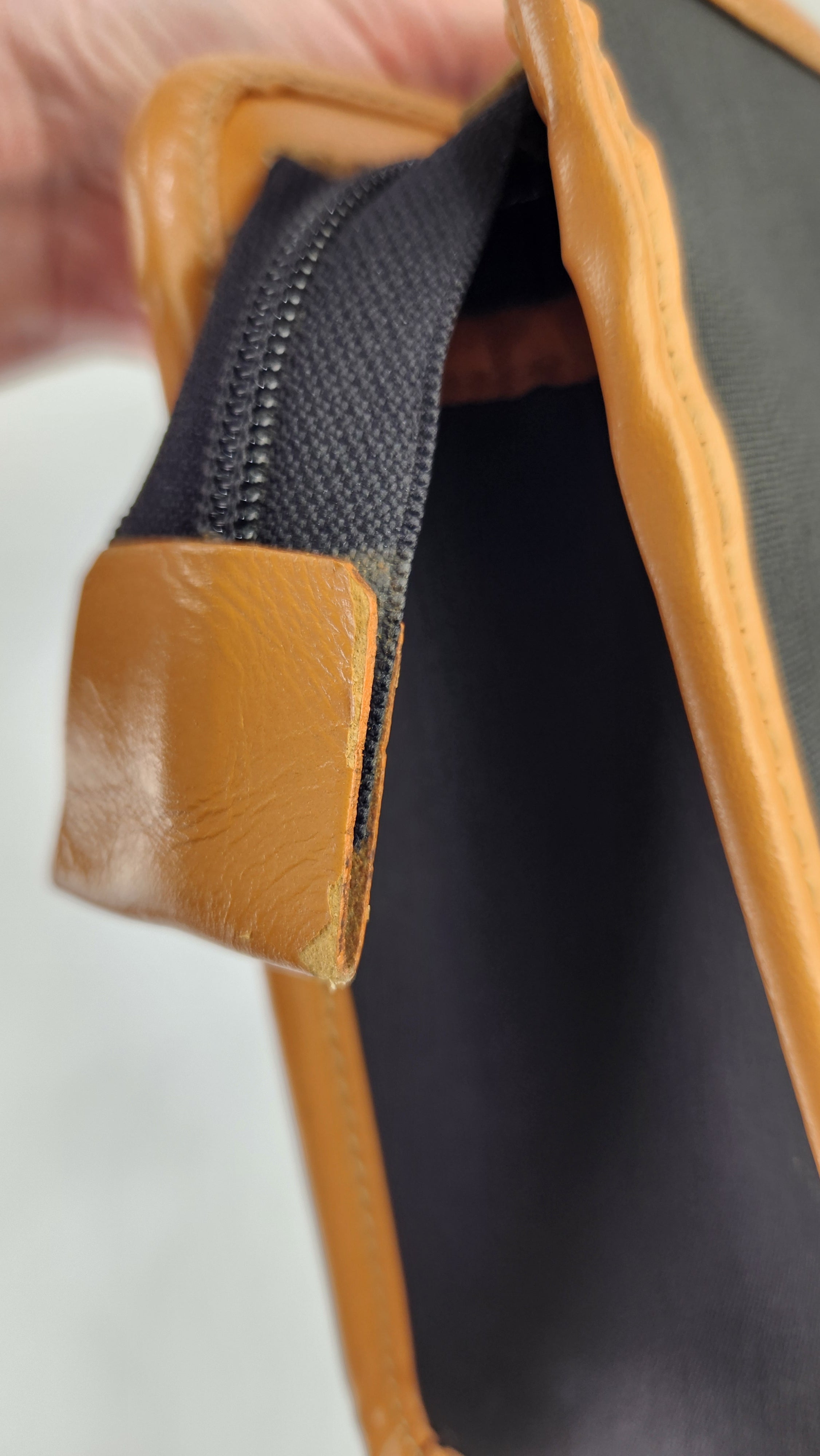 Condition details: In great condition, outside black nylon is in great condition with some signs of wear. Brown Leather trim and tabs are in great condition with some signs of wear. Corners and edges are in great condition with some rubbing and creasing; there is some peeling on the leather tab by the zipper. Hardware is in great condition with some signs of wear, zipper works well. Inside is clean with some wear, no foul smell.