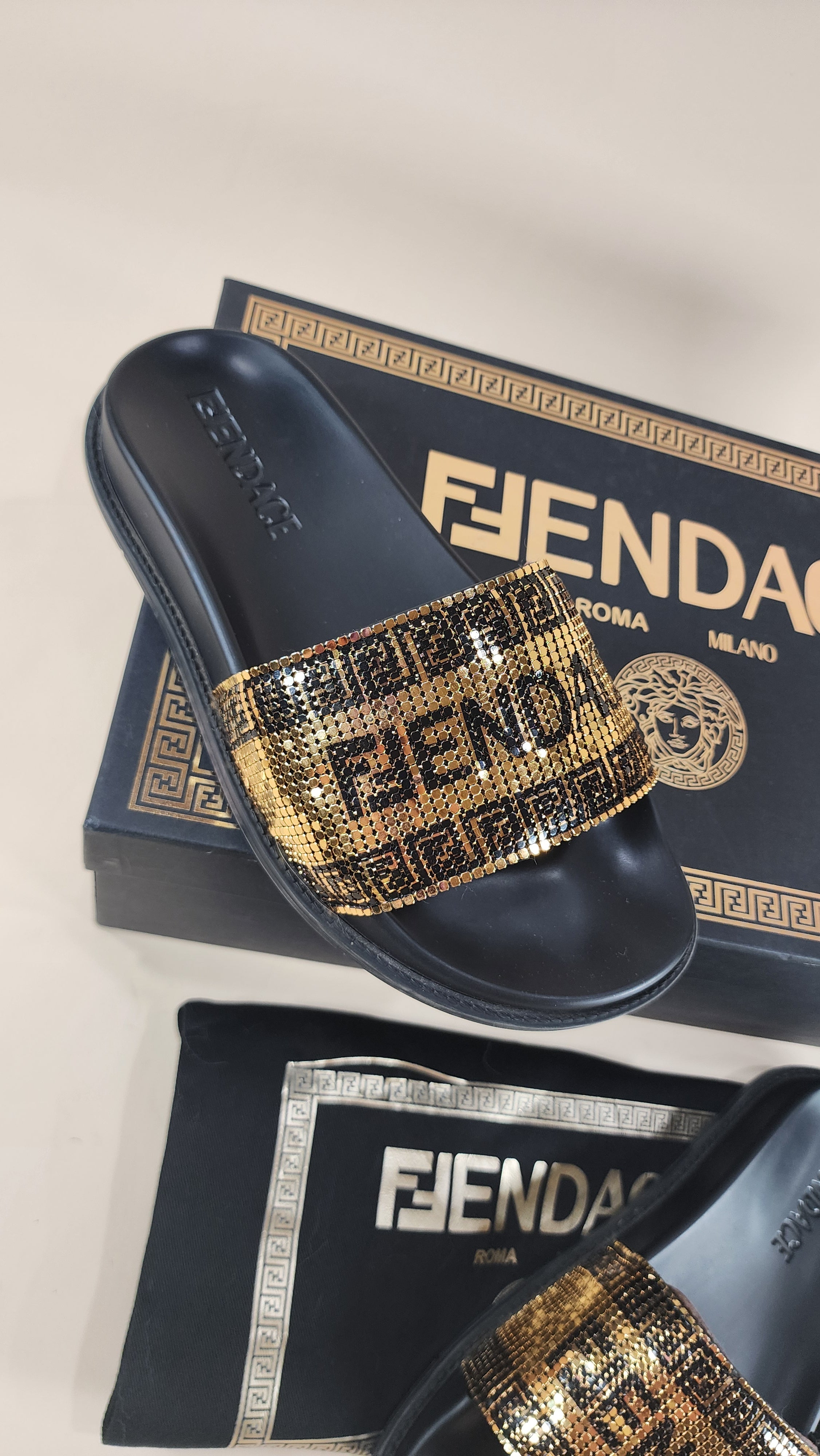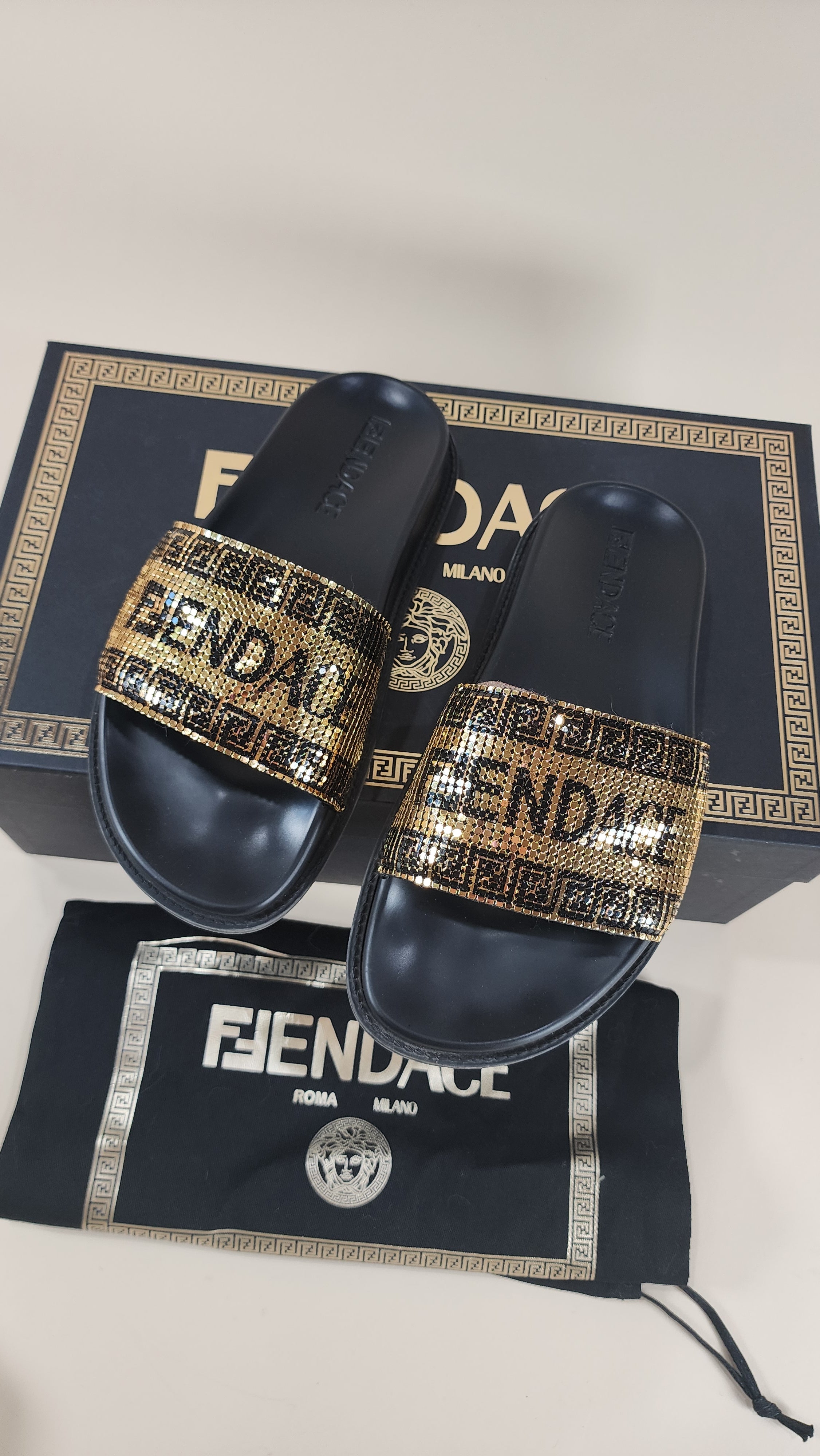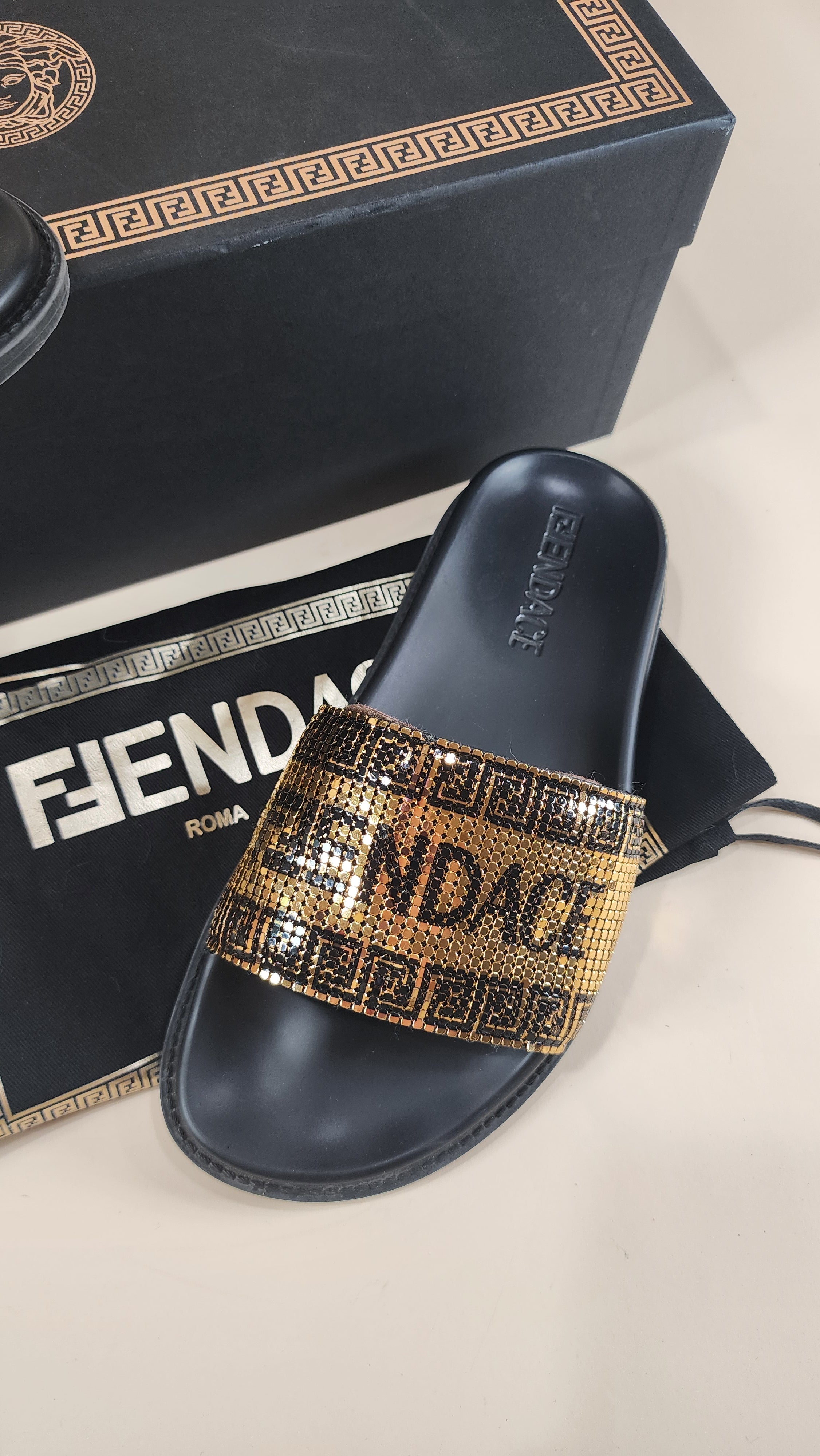 Fendace, Fendi and Versace Black Pool Slides with Gold Metal Mesh