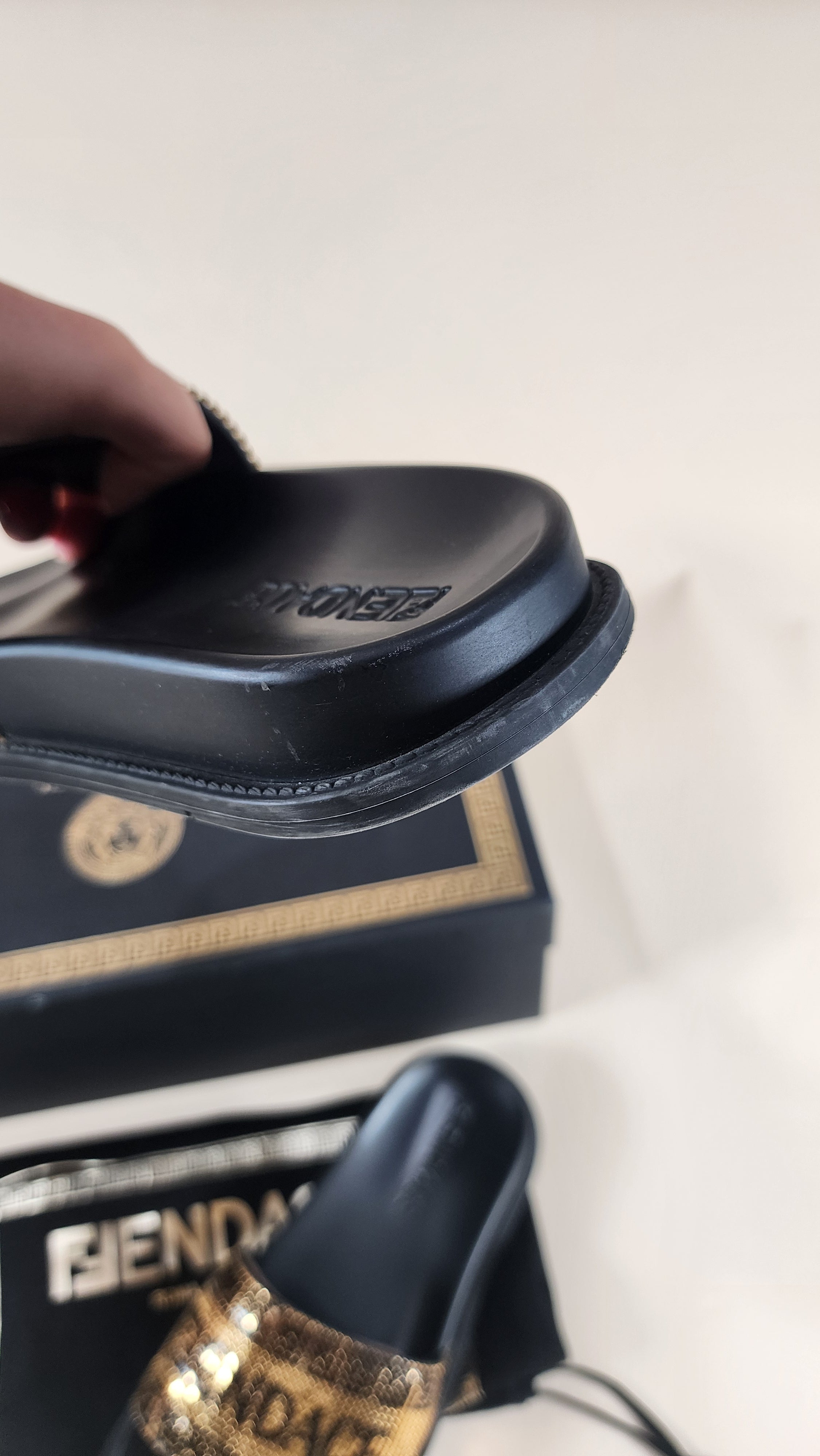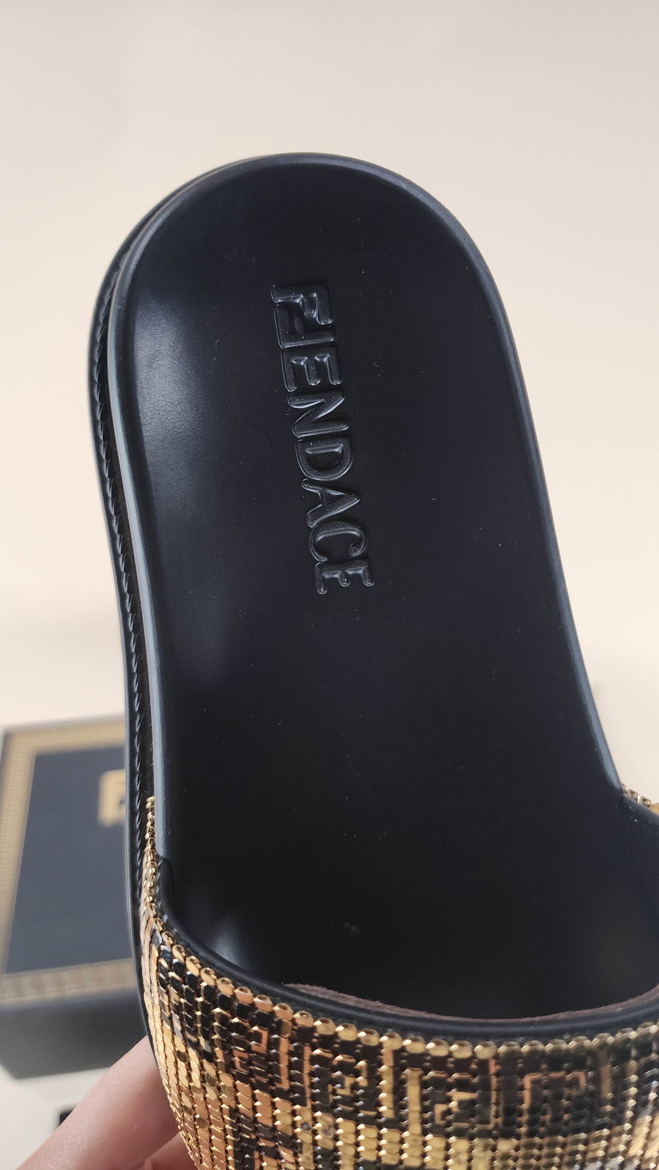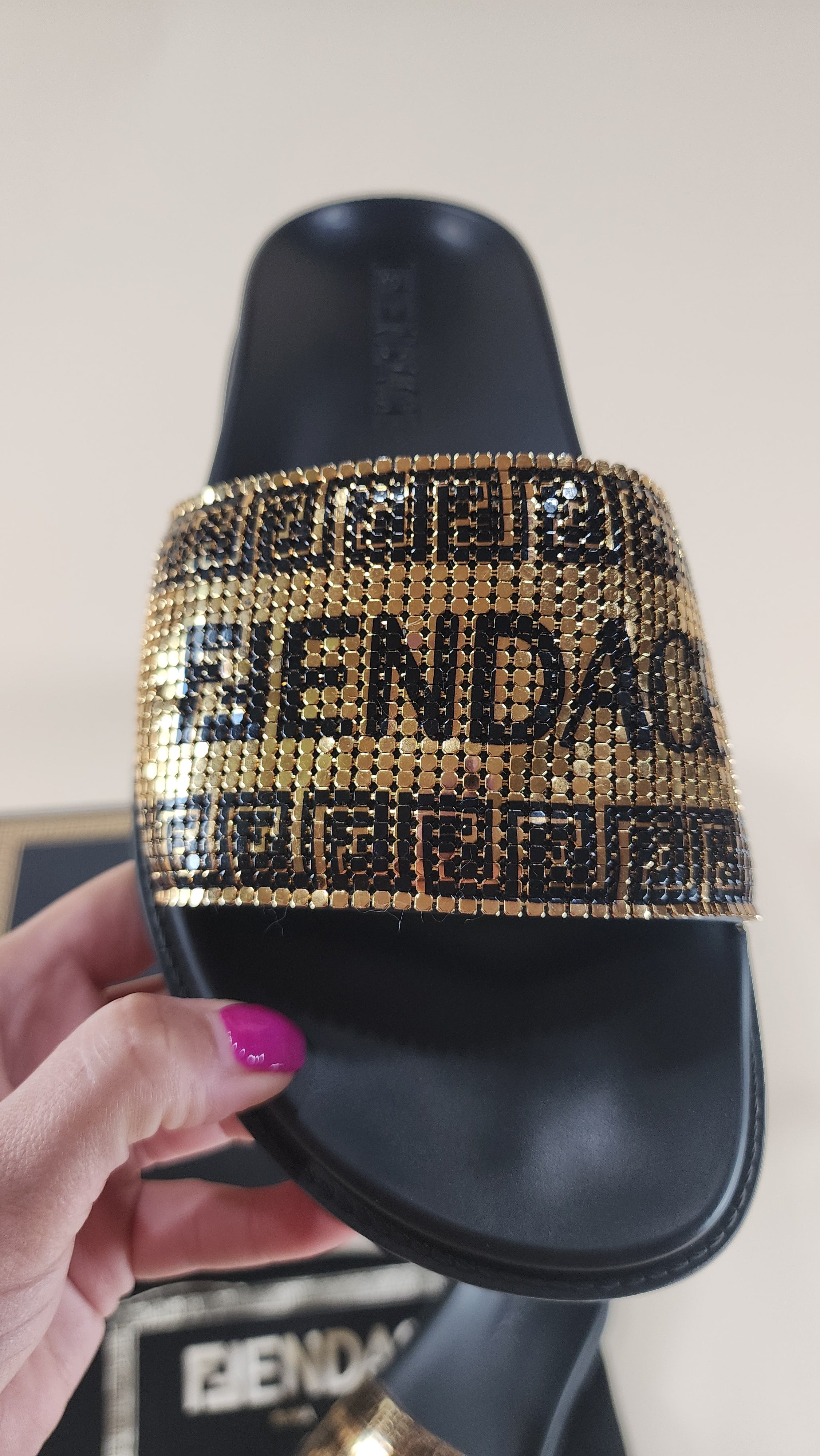 Fendace, Fendi and Versace Black Pool Slides with Gold Metal Mesh