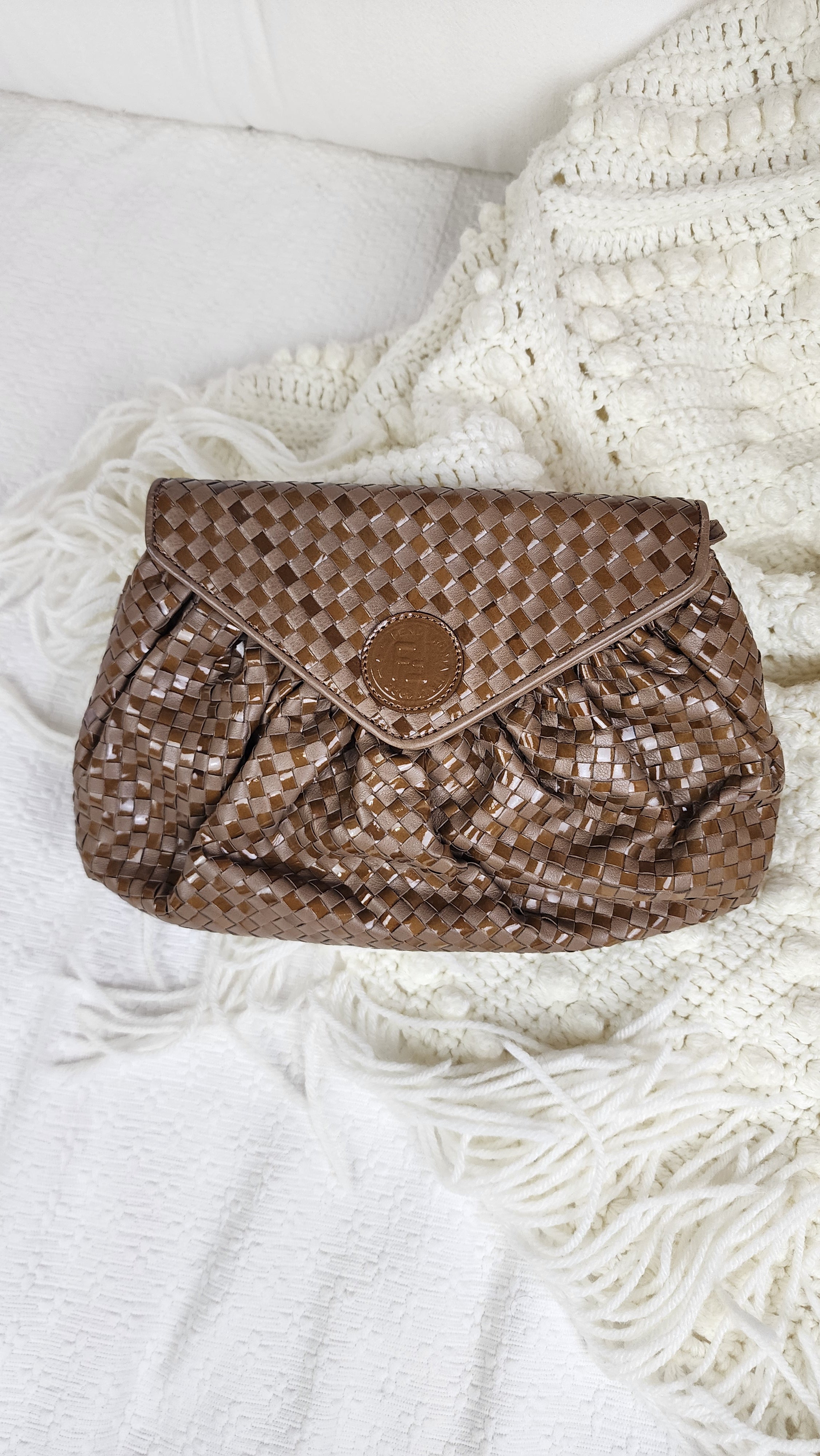 Condition details: In great condition; outside basket weave brown leather is in great condition with some signs of wear. Corners are in great condition with minor signs of rubbing. Adjustable leather shoulder strap is in great condition with some signs of wear and can be stored in bag and used as a clutch and is removable. Gold toned hardware is in great condition with minimal signs of wear, magnetic closure and zipper work well. Inside is clean with minimal signs of wear, no foul smell.