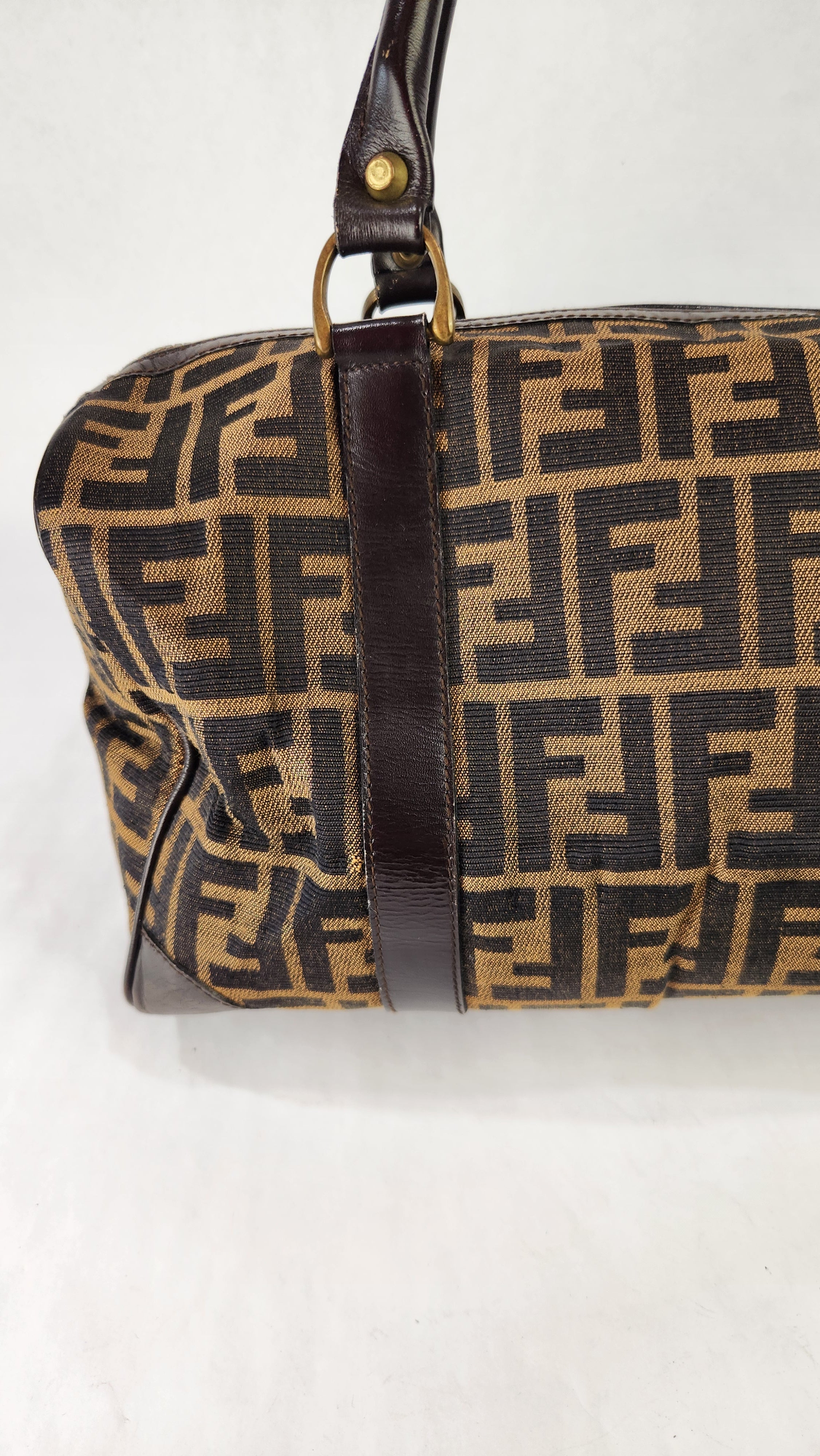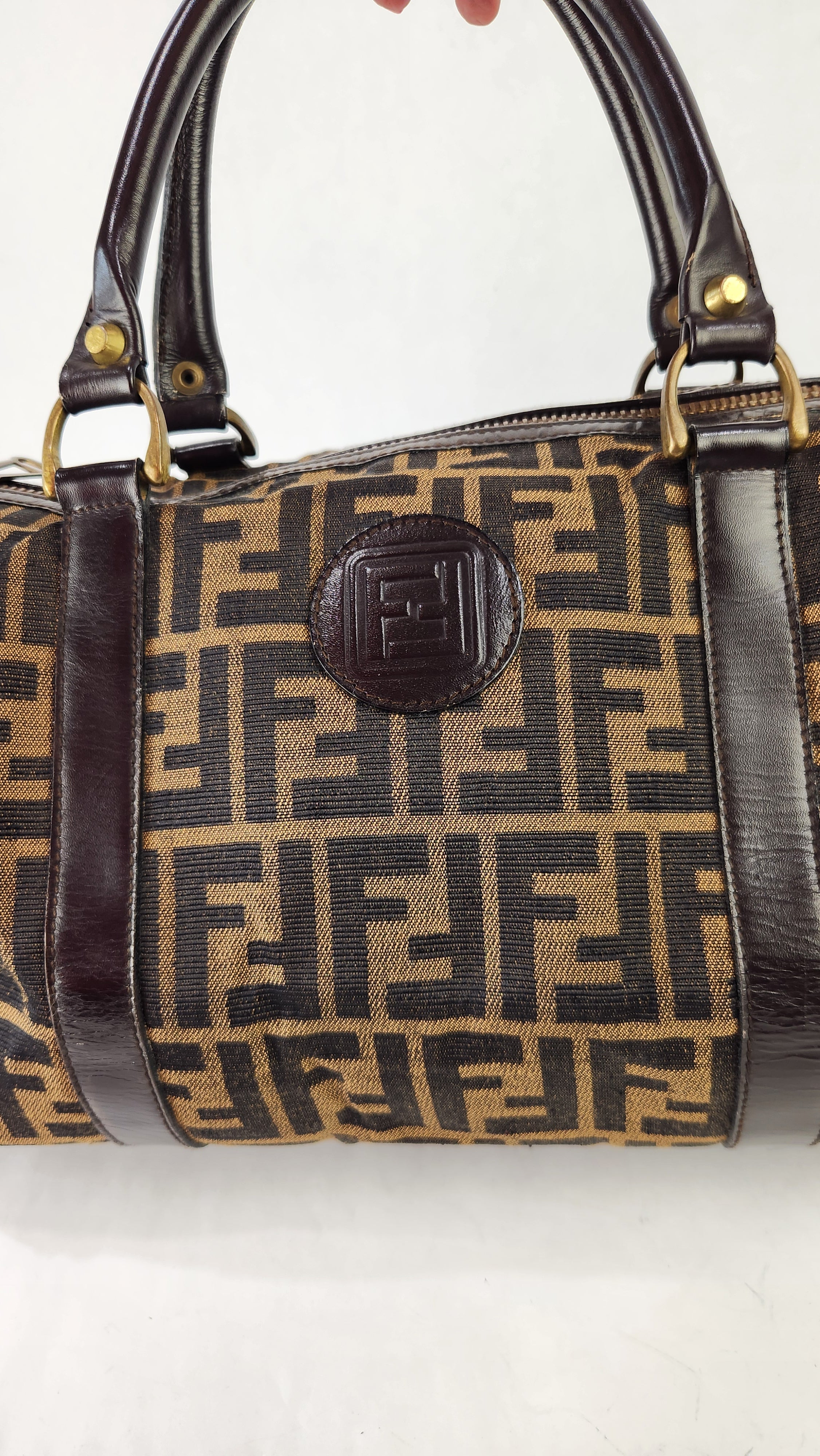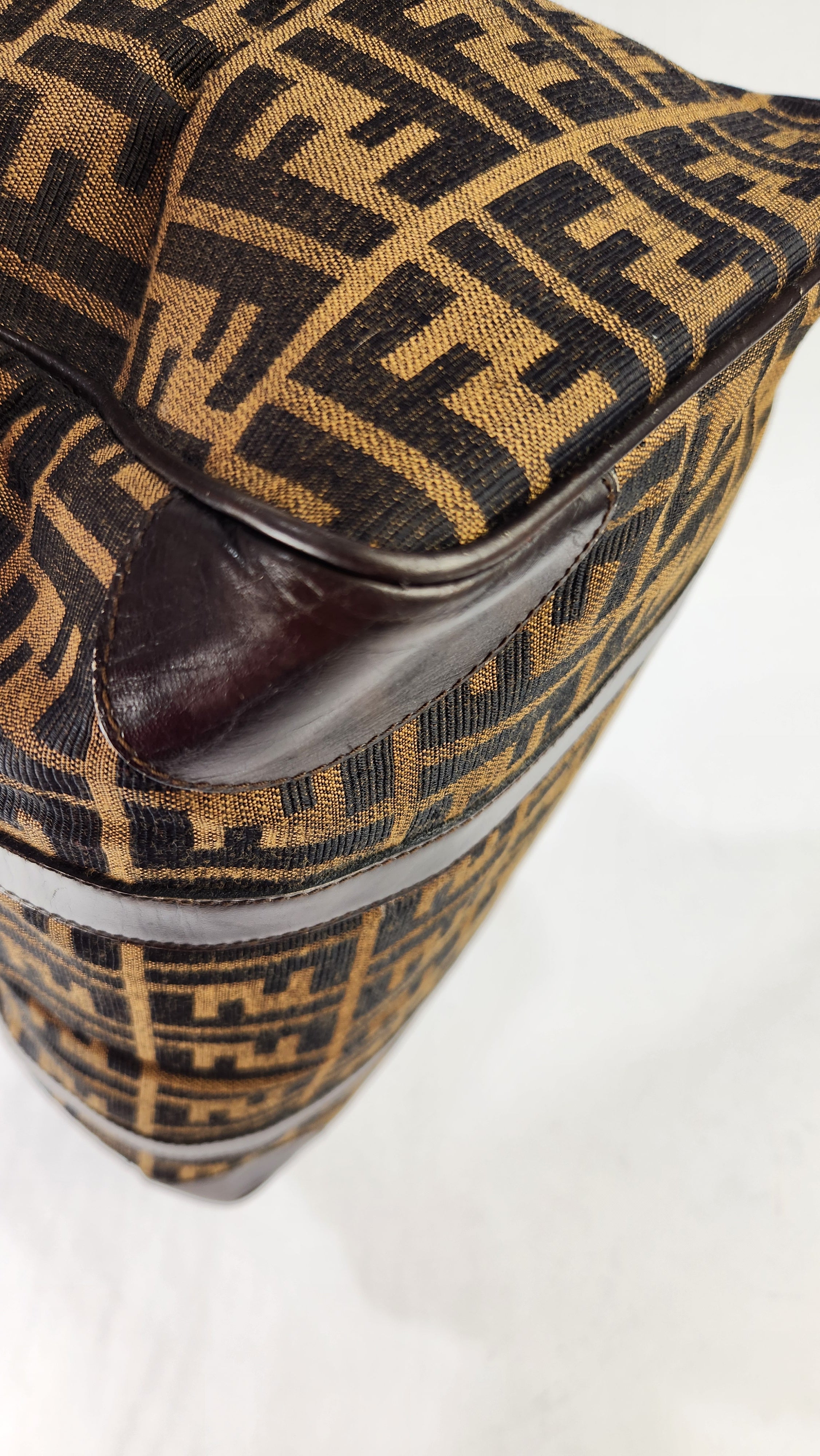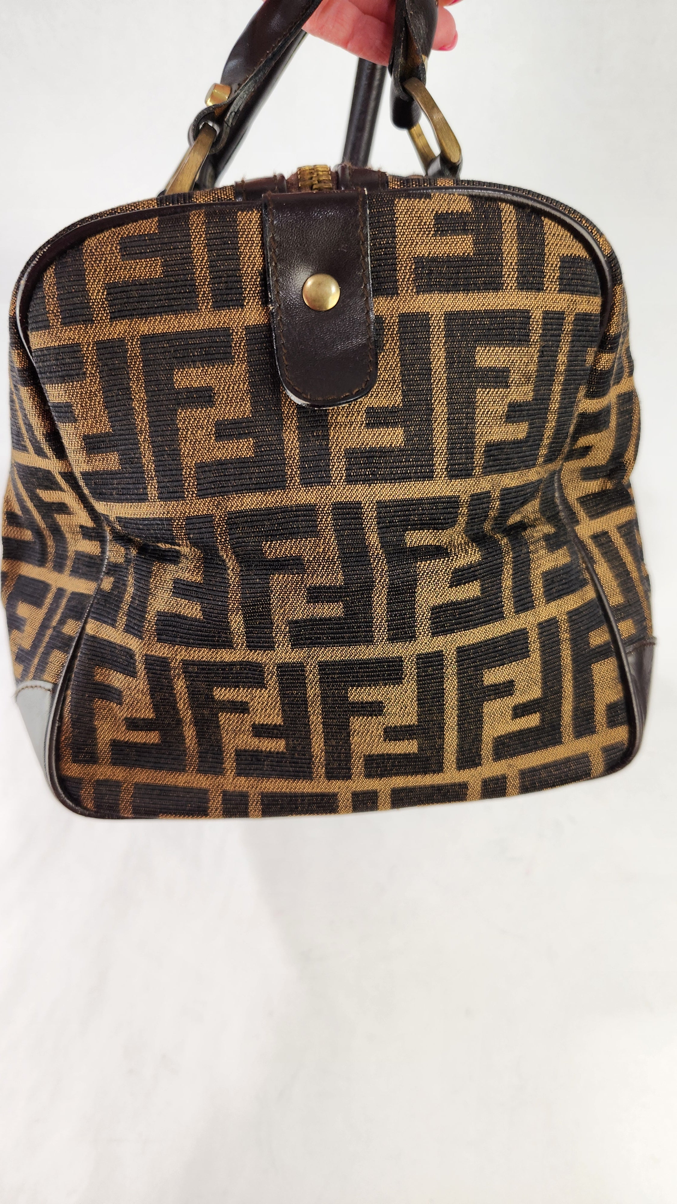 Condition details: In great condition; outside zucca canvas is in great condition with some sign of wear throughout and some rubs. Corners and edges are in great condition with some signs of wear and rubbing. Leather parts are in great condition with some wear and rubbing and creasing in areas. Leather handles are in great condition with some signs of wear. Gold tone hardware is in great condition with some signs of wear, zipper works well. Inside is clean with some signs of wear, no foul smell.