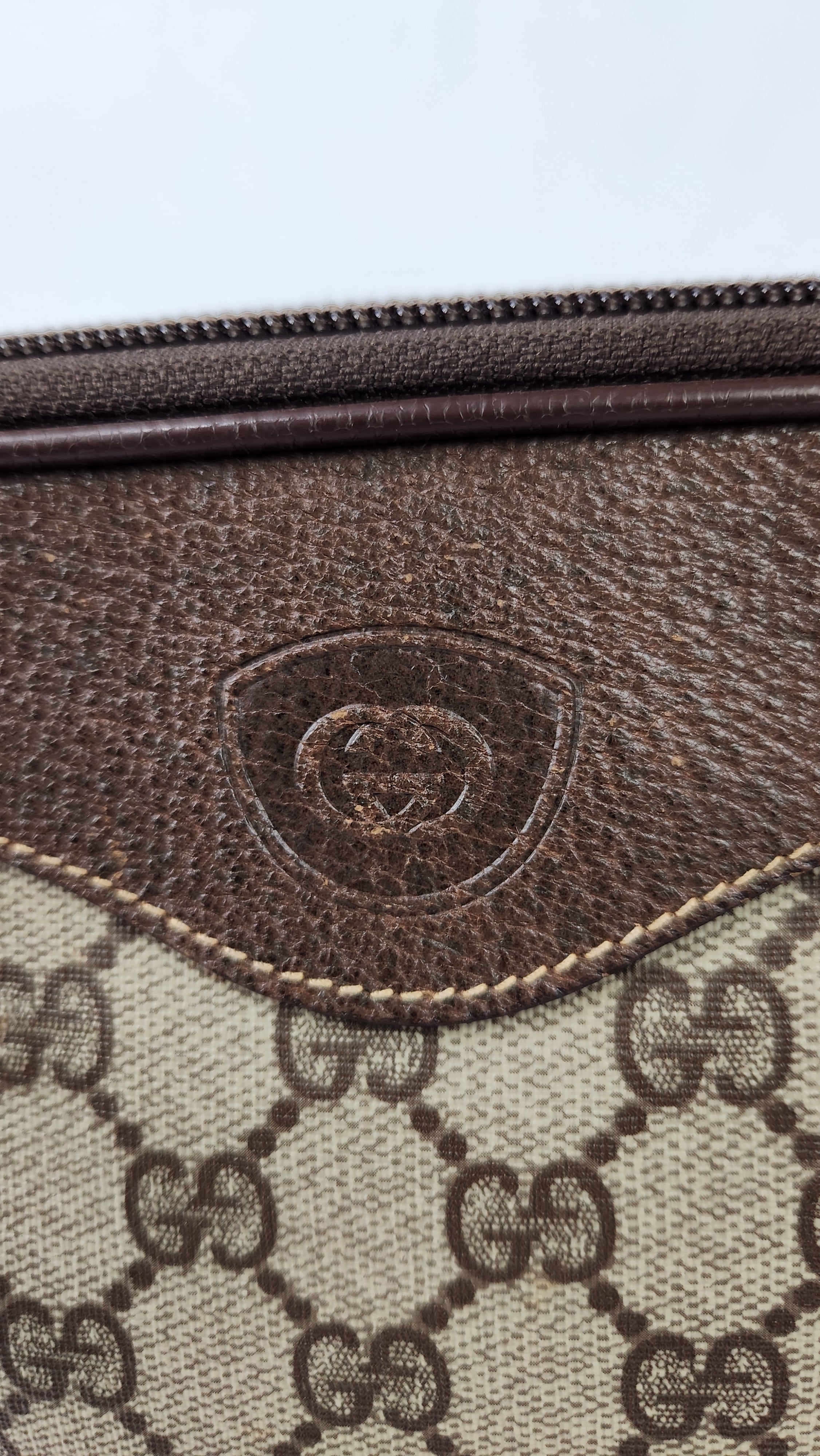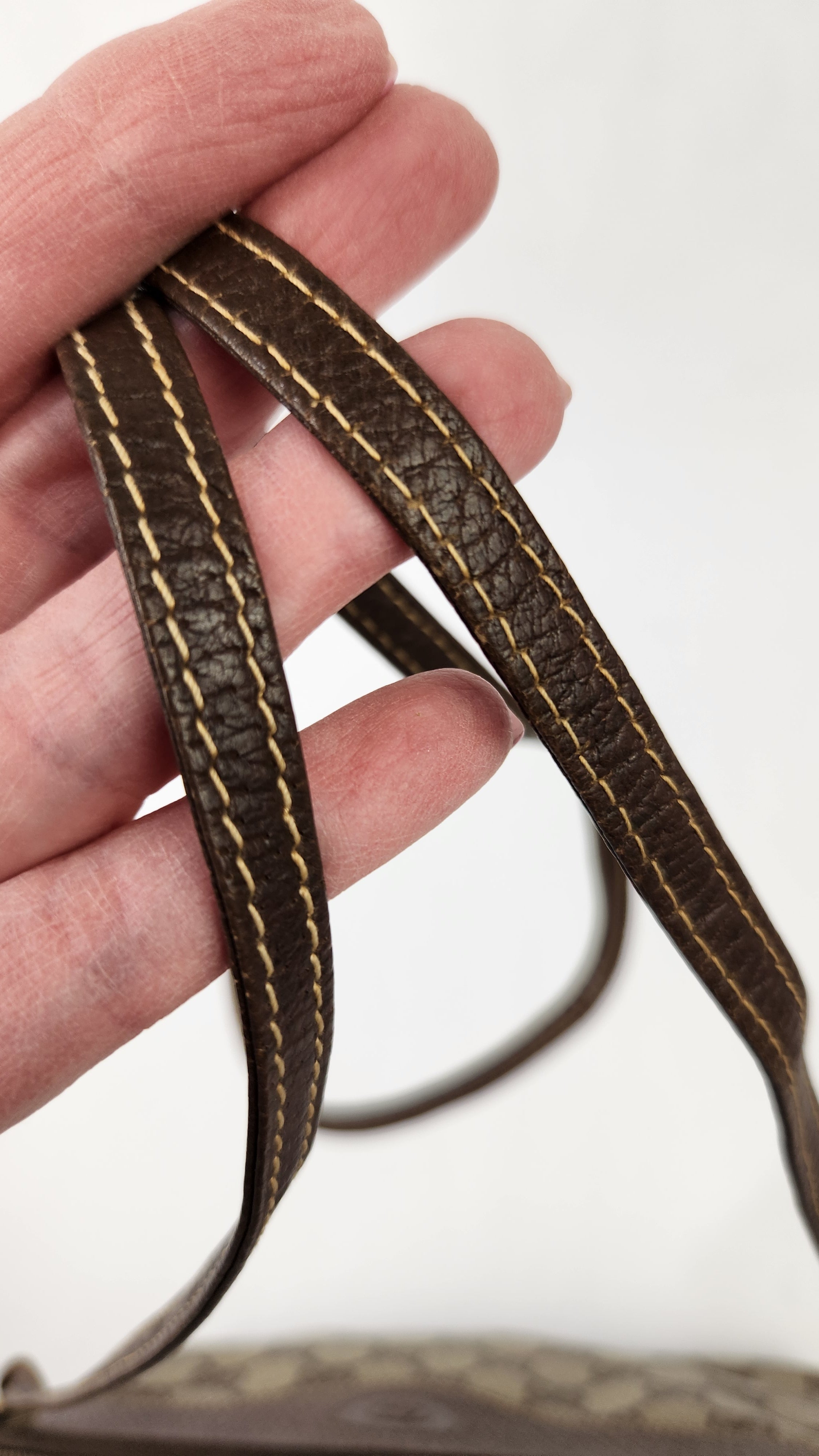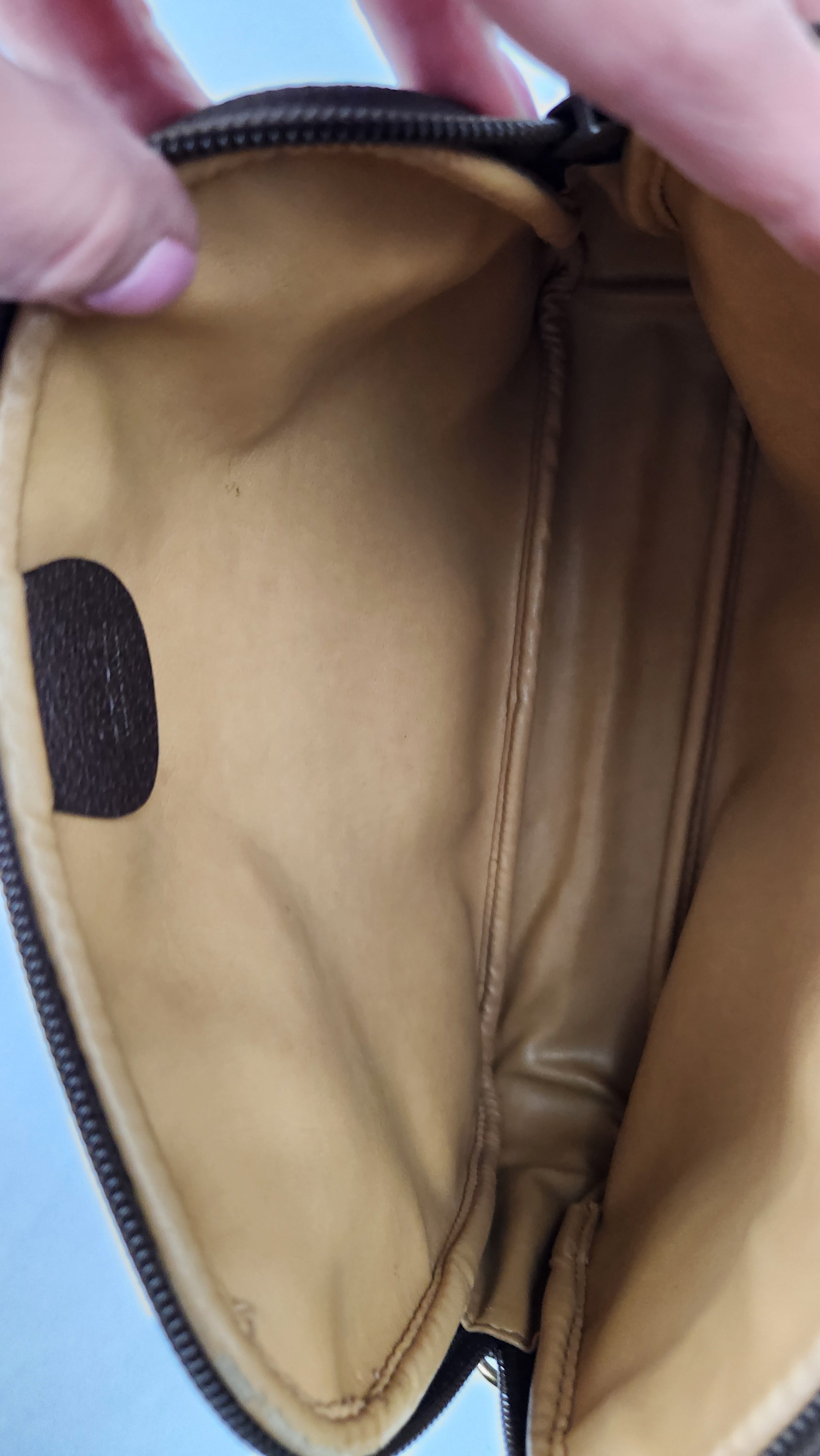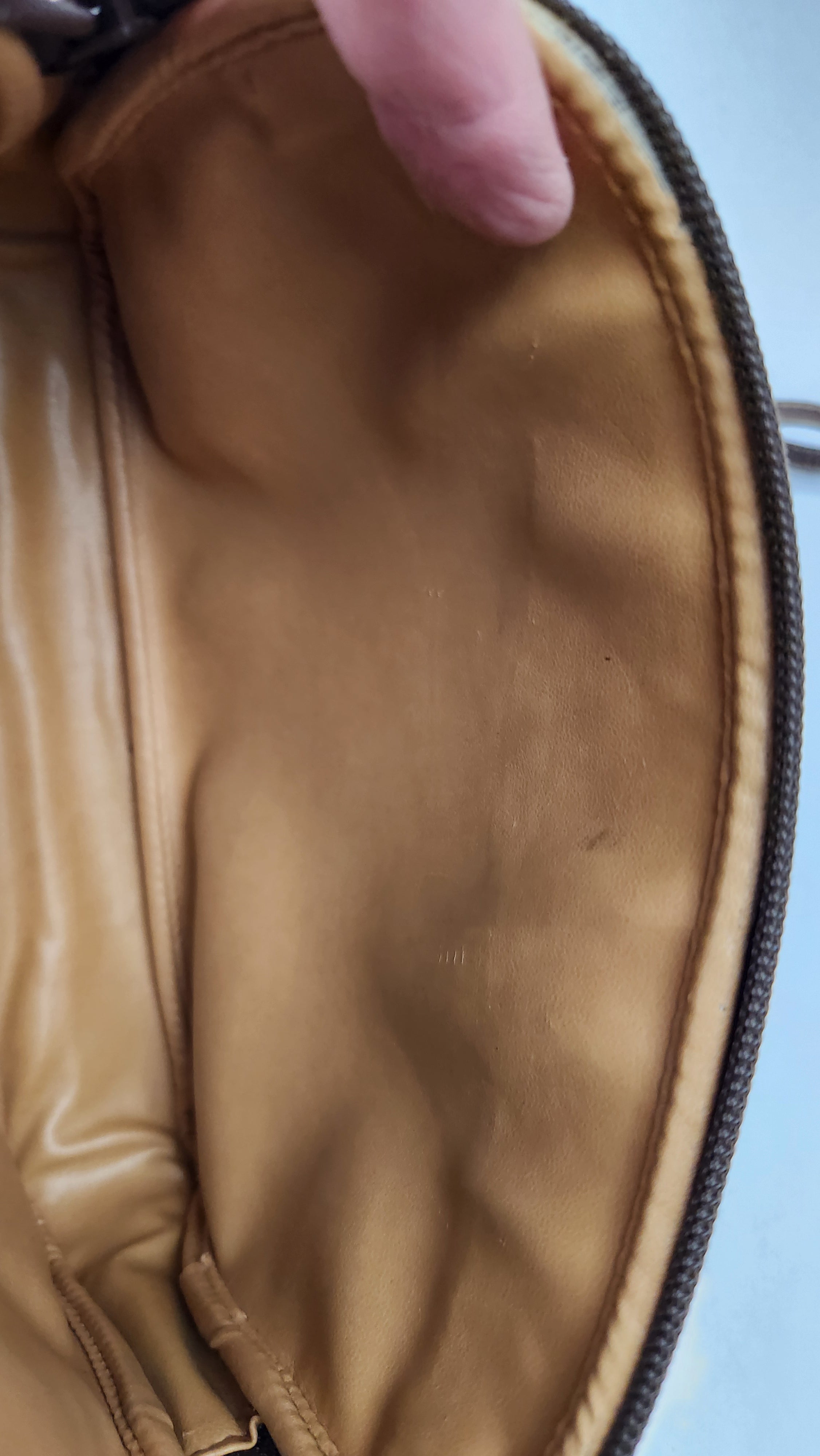 Condition details: In great condition; outside pvc coated canvas is in great condition with some signs of wear. Leather strap is in great condition with some signs of wear. Leather parts, edges and corners are in great condition with some signs of wear. Gold tone hardware is in great condition with some signs of wear and slight silvering on zipper pull, zipper works well. Inside is clean with some signs of wear, and rubbing to top layer of lining due to the rubbing of the zip when it closes and opens. no foul smell.