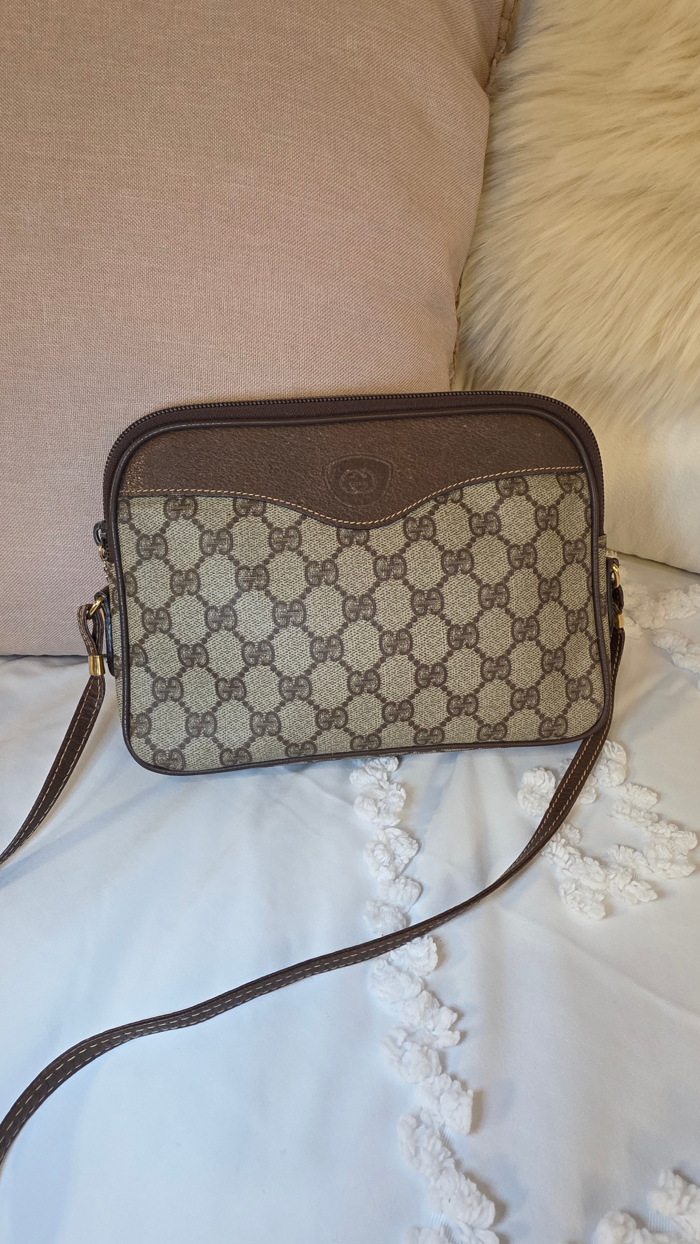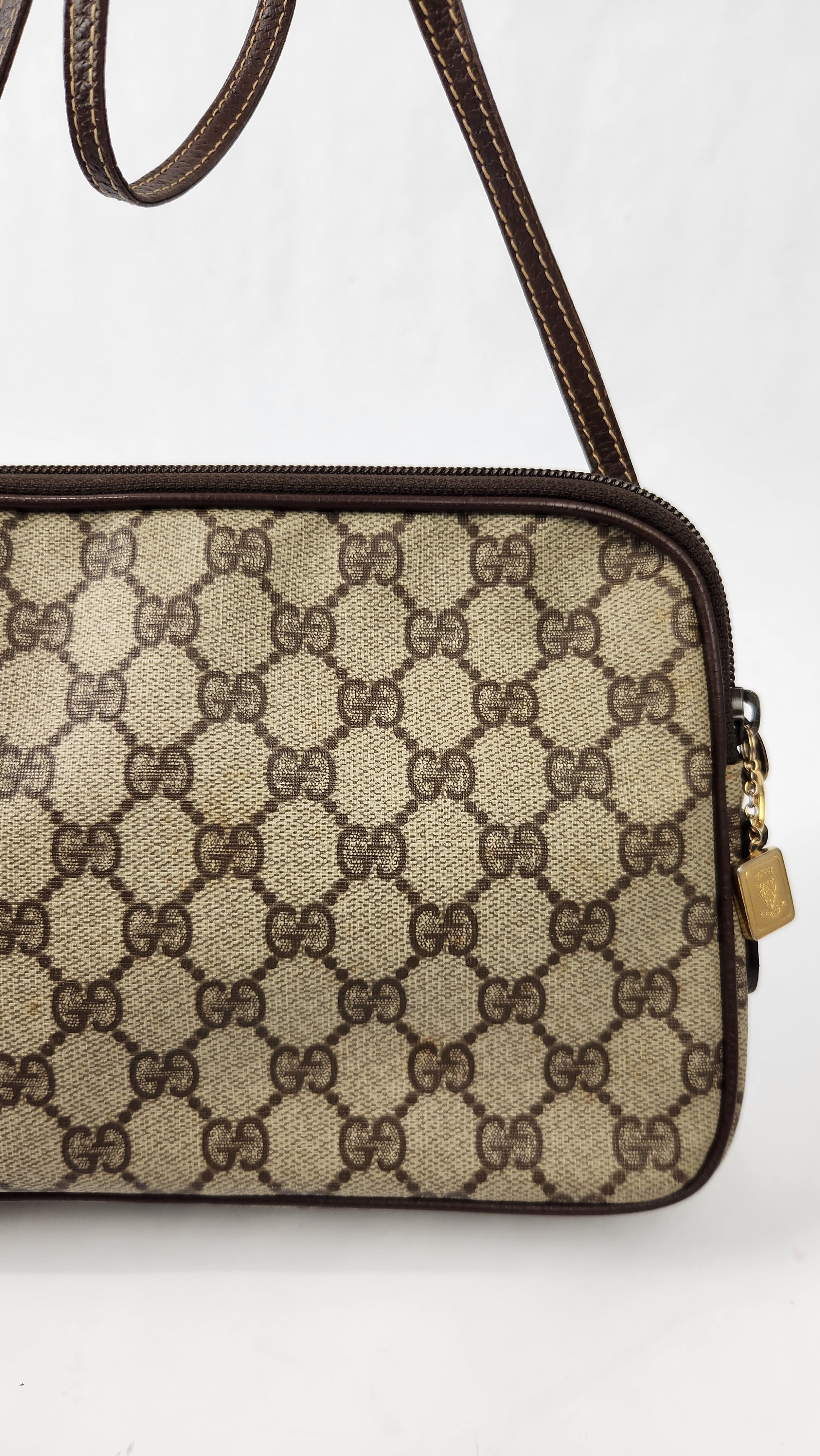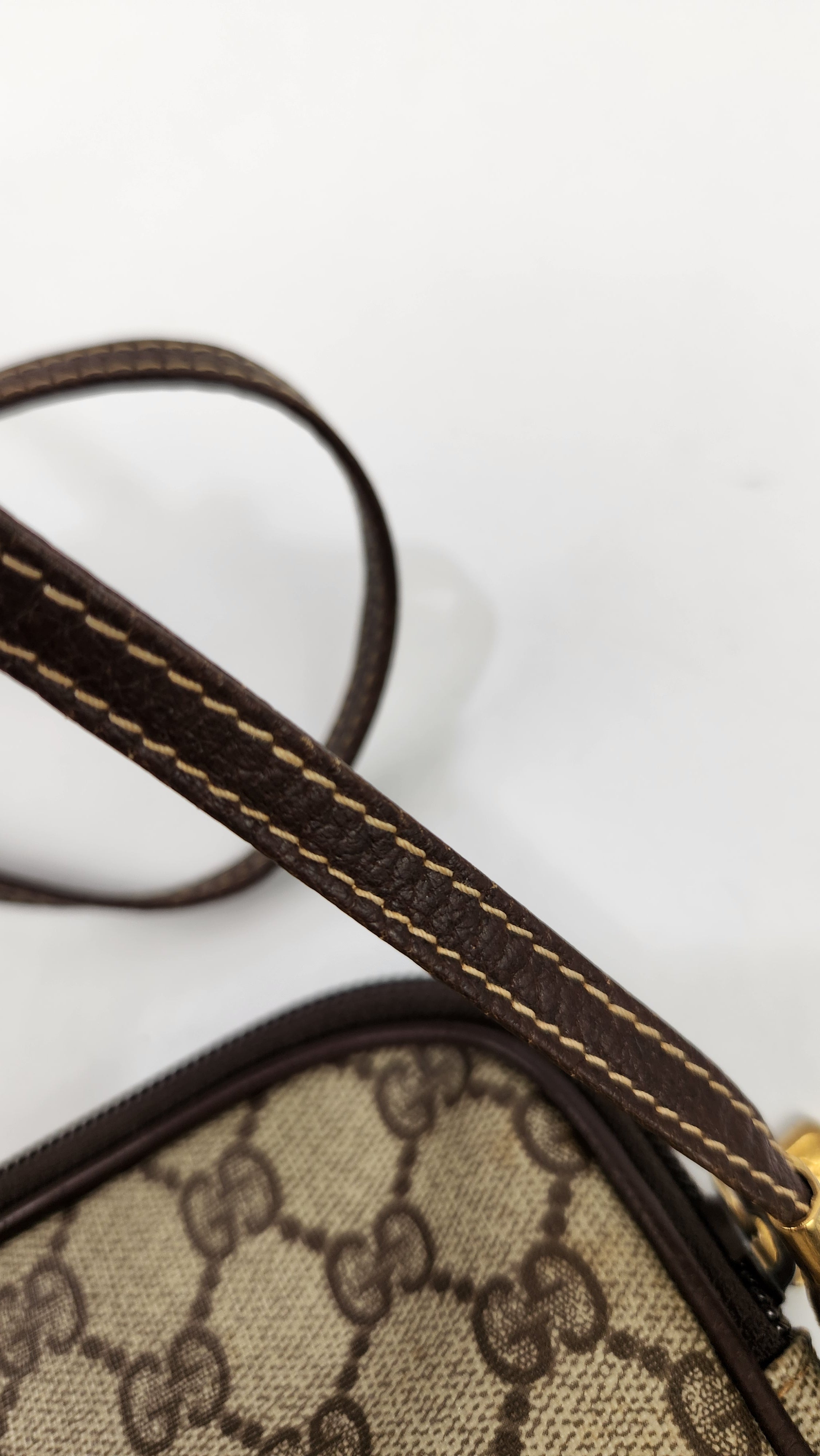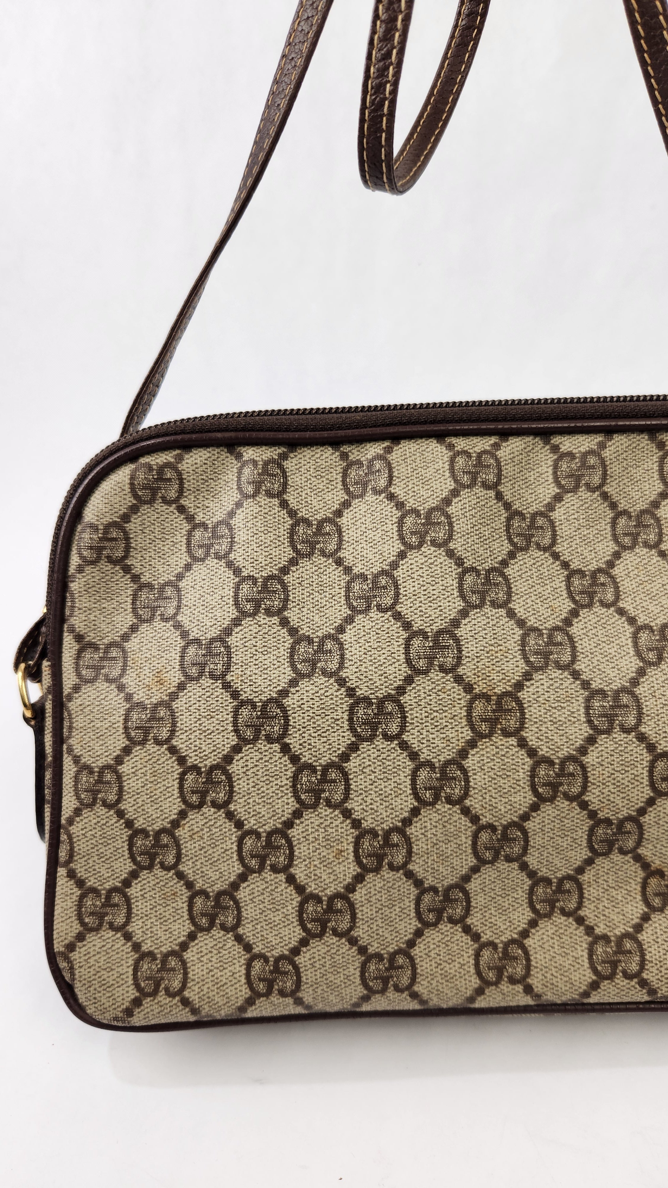 Condition details: In great condition; outside pvc coated canvas is in great condition with some signs of wear. Leather strap is in great condition with some signs of wear. Leather parts, edges and corners are in great condition with some signs of wear. Gold tone hardware is in great condition with some signs of wear and slight silvering on zipper pull, zipper works well. Inside is clean with some signs of wear, and rubbing to top layer of lining due to the rubbing of the zip when it closes and opens. no foul smell.