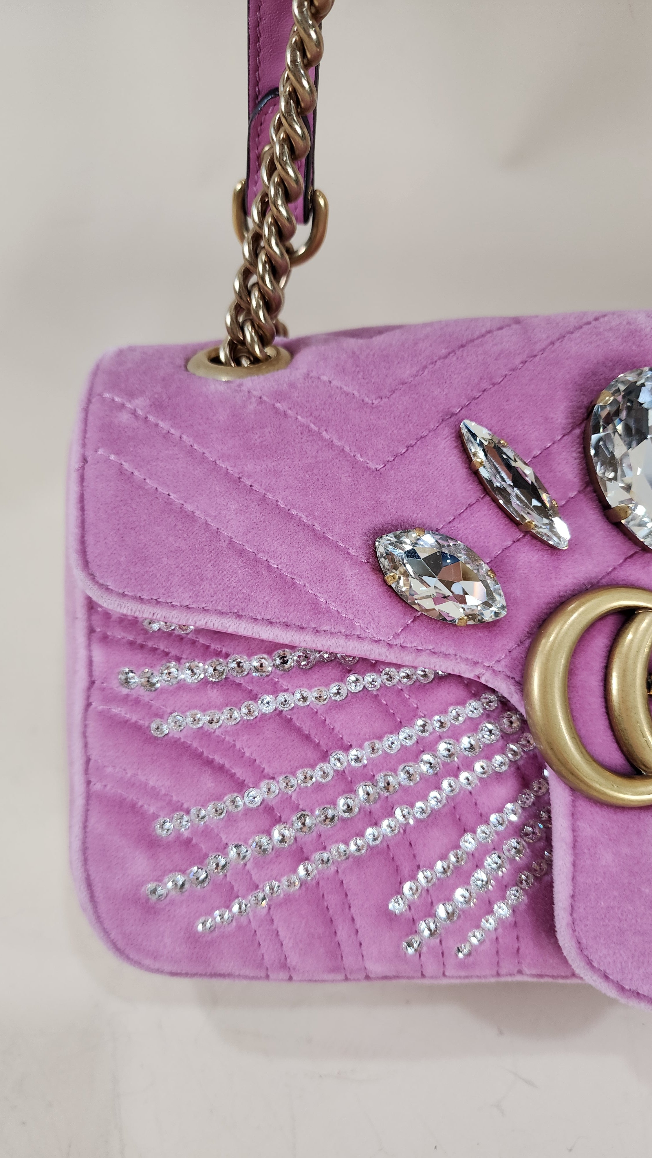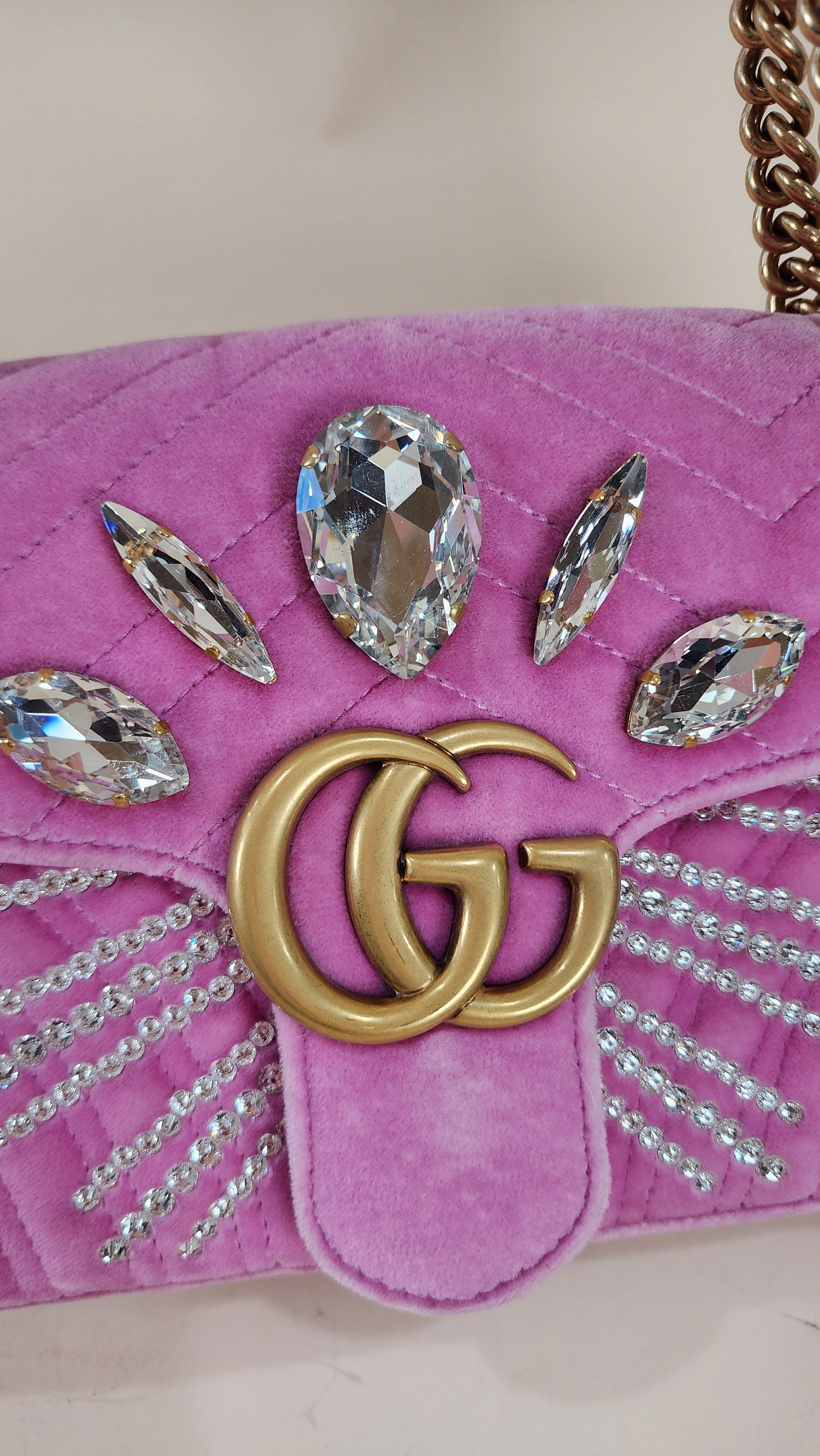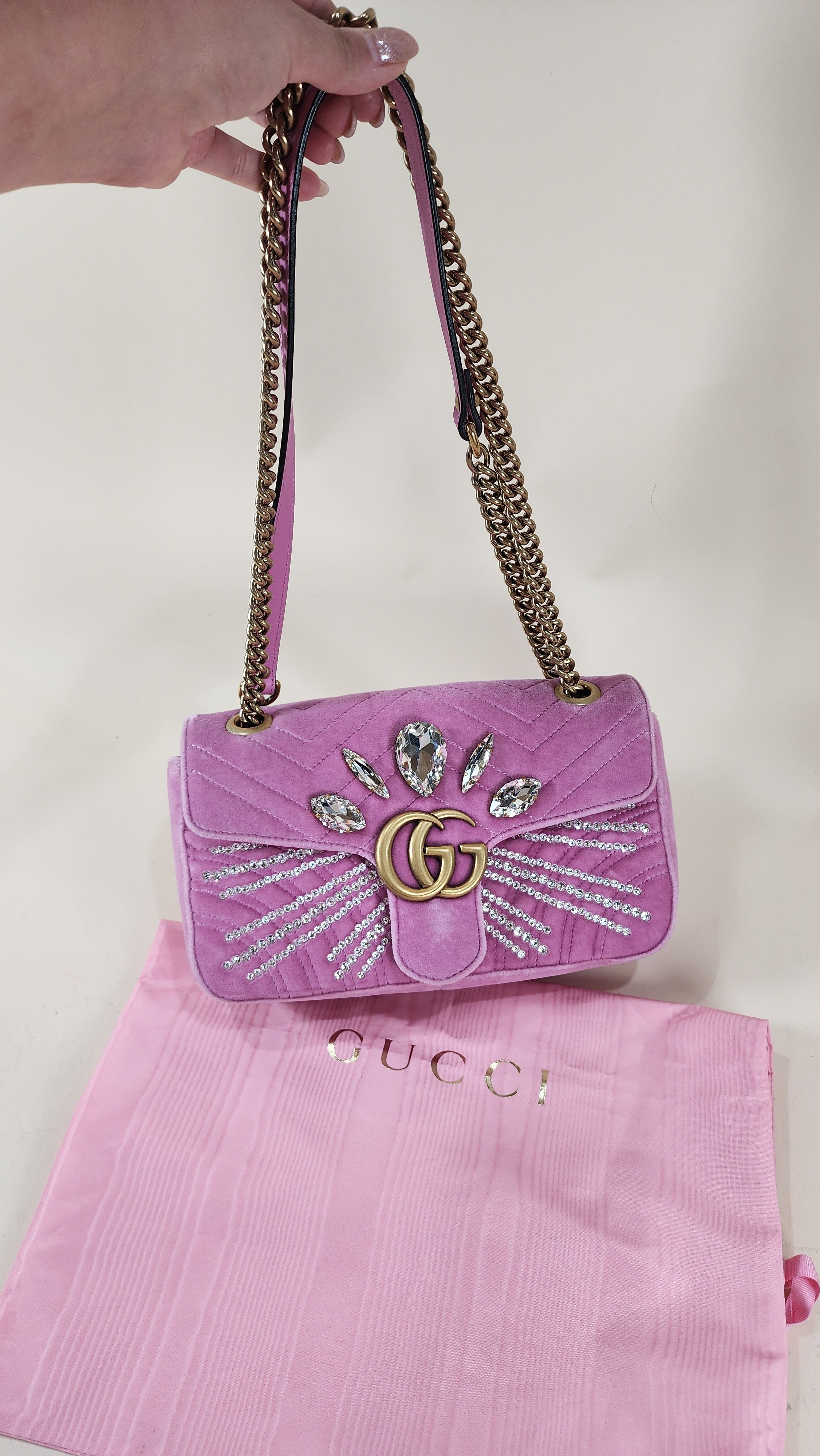 Condition details: In great condition; outside pink velor is in great condition with some signs of wear and rubbing in areas which has caused a slight lightening to pink velor color. The front is decorated with 5 large rhinestones and smaller ones in a sunburst pattern, all are present and in great condition. Leather on handle is in great condition, gold tone chain part of the strap is in great condition with some signs of wear. Hardware is in great condition with some signs of wear, snap closure and internal zipper work well. Inside is clean, no foul smell. Comes with a Gucci dustbag.