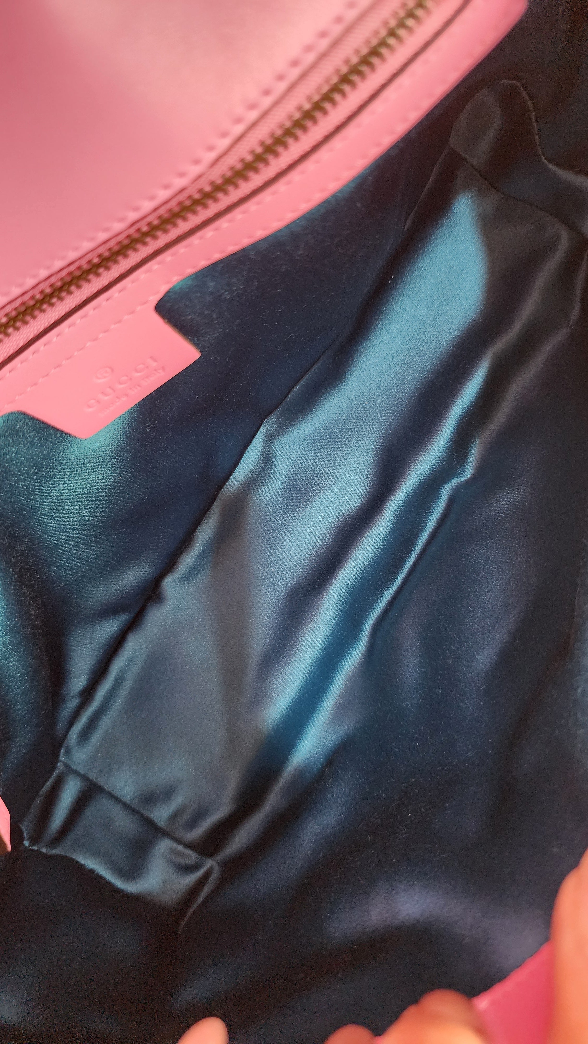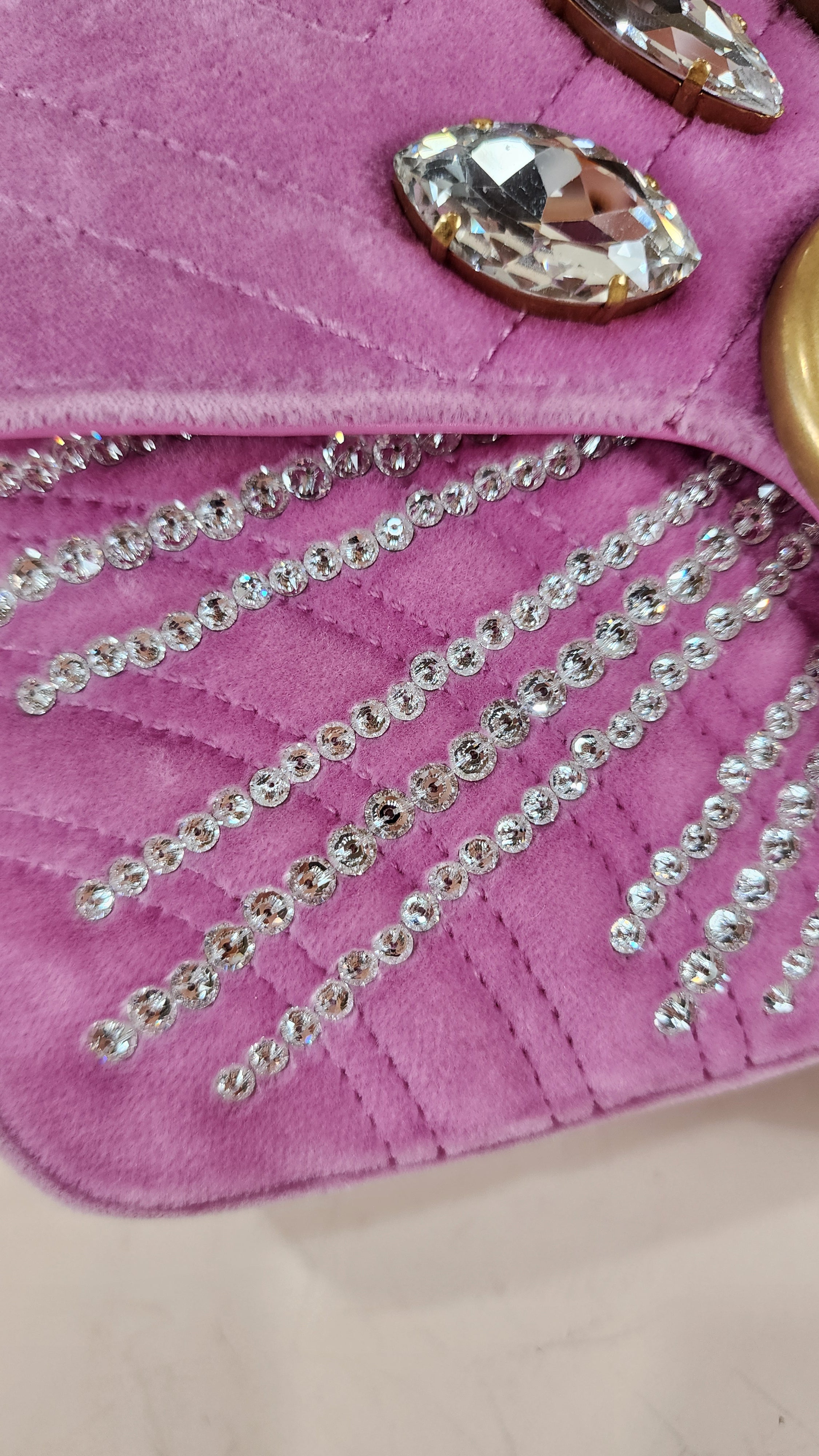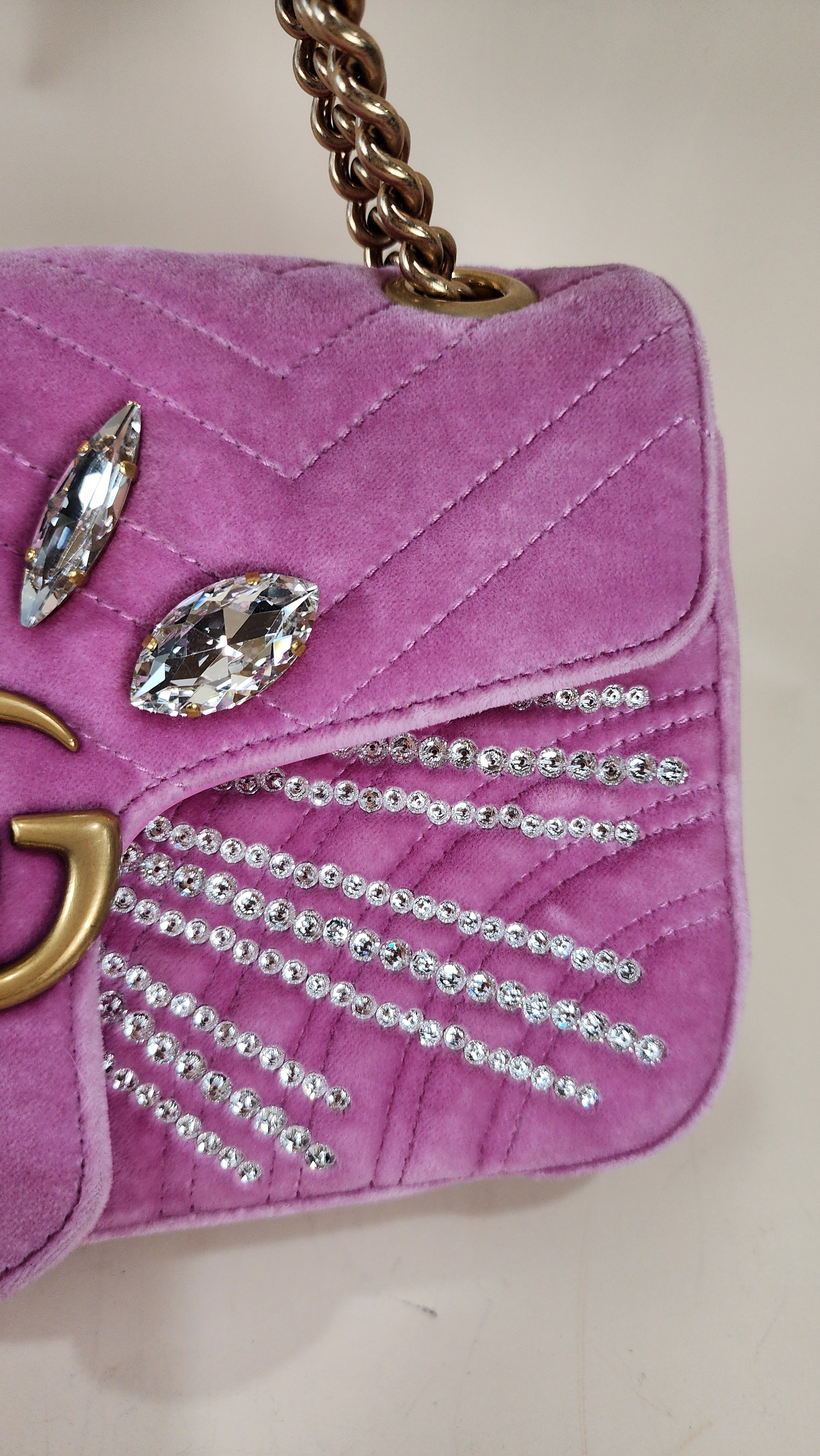Condition details: In great condition; outside pink velor is in great condition with some signs of wear and rubbing in areas which has caused a slight lightening to pink velor color. The front is decorated with 5 large rhinestones and smaller ones in a sunburst pattern, all are present and in great condition. Leather on handle is in great condition, gold tone chain part of the strap is in great condition with some signs of wear. Hardware is in great condition with some signs of wear, snap closure and internal zipper work well. Inside is clean, no foul smell. Comes with a Gucci dustbag.