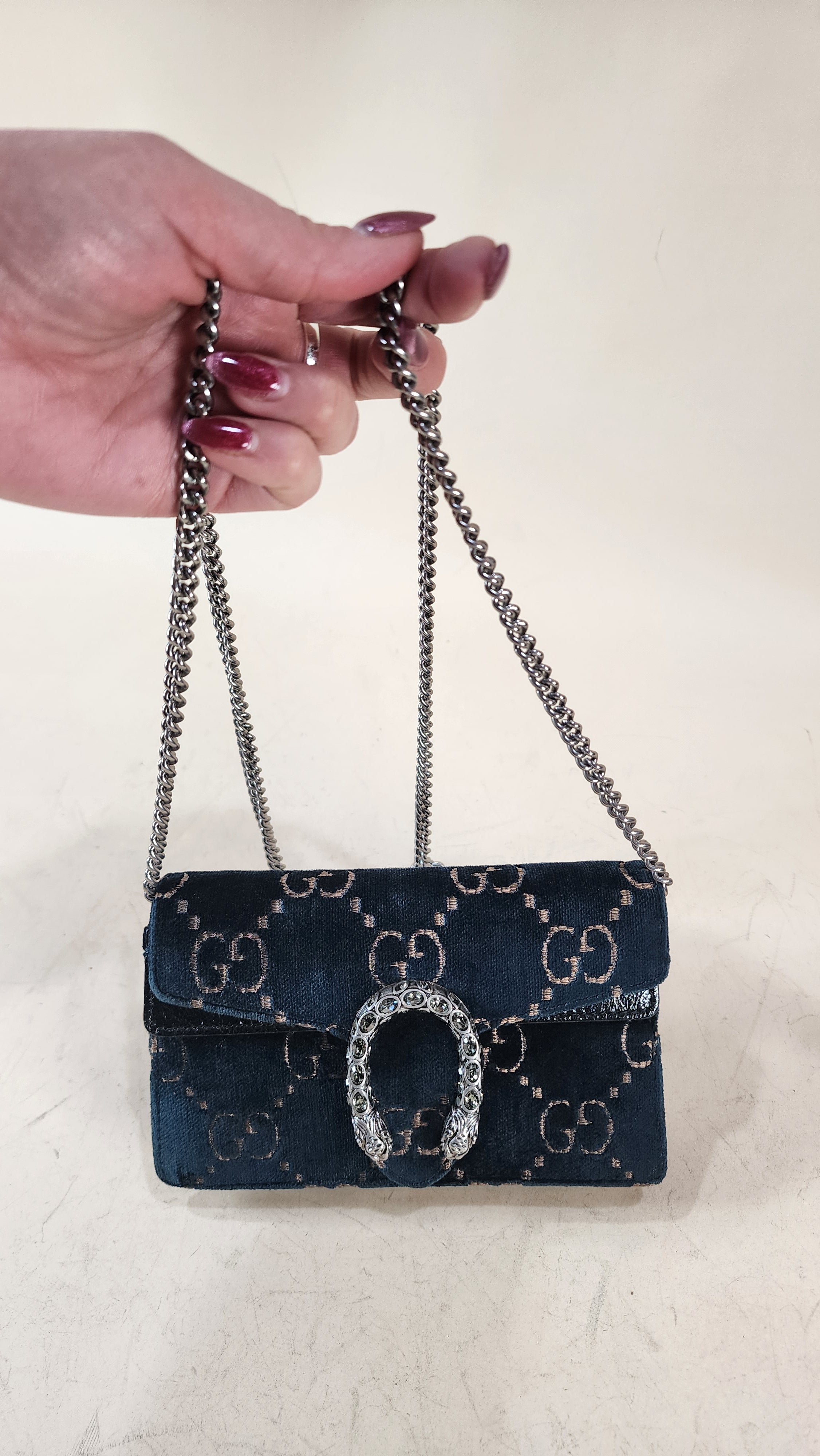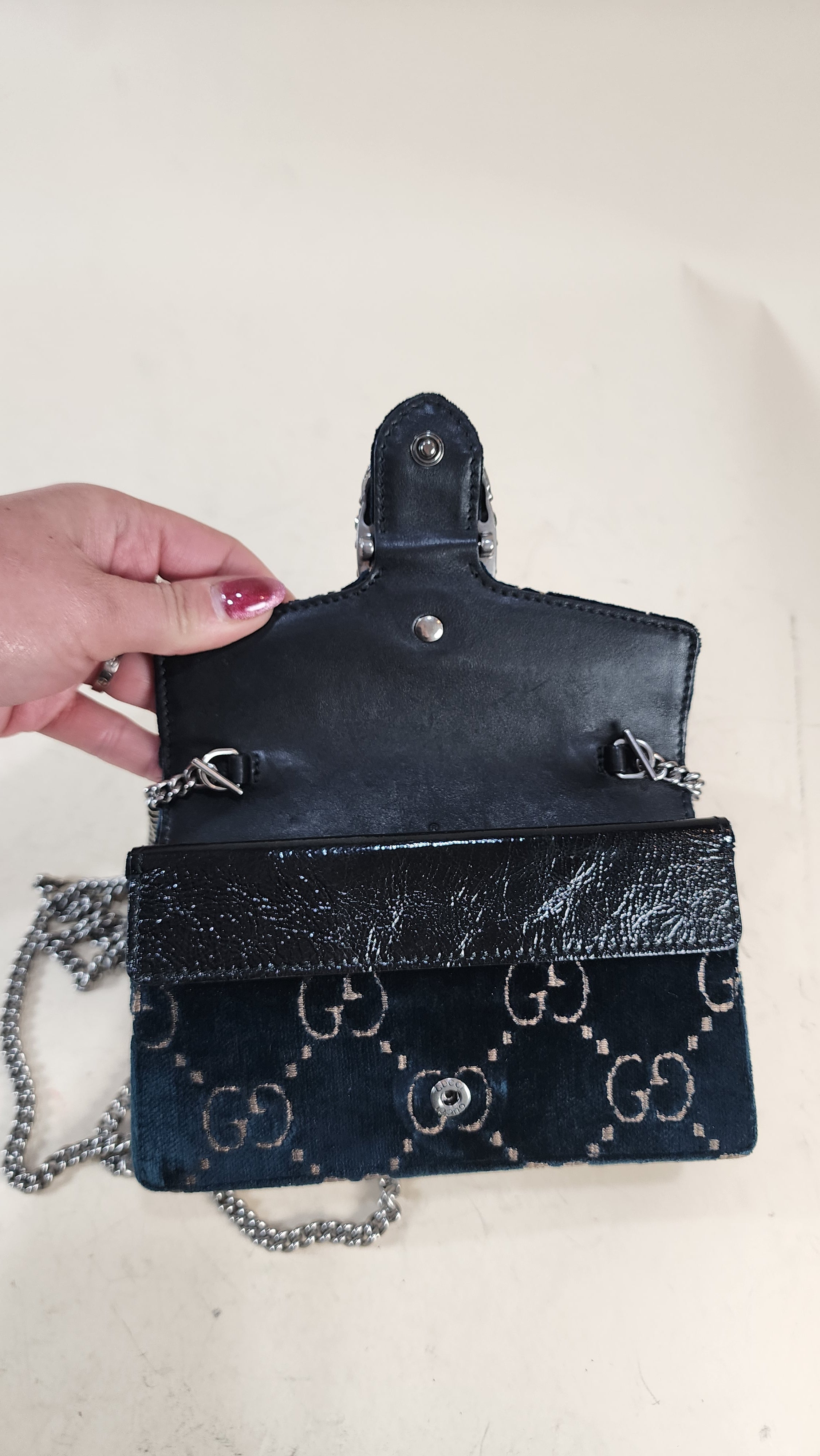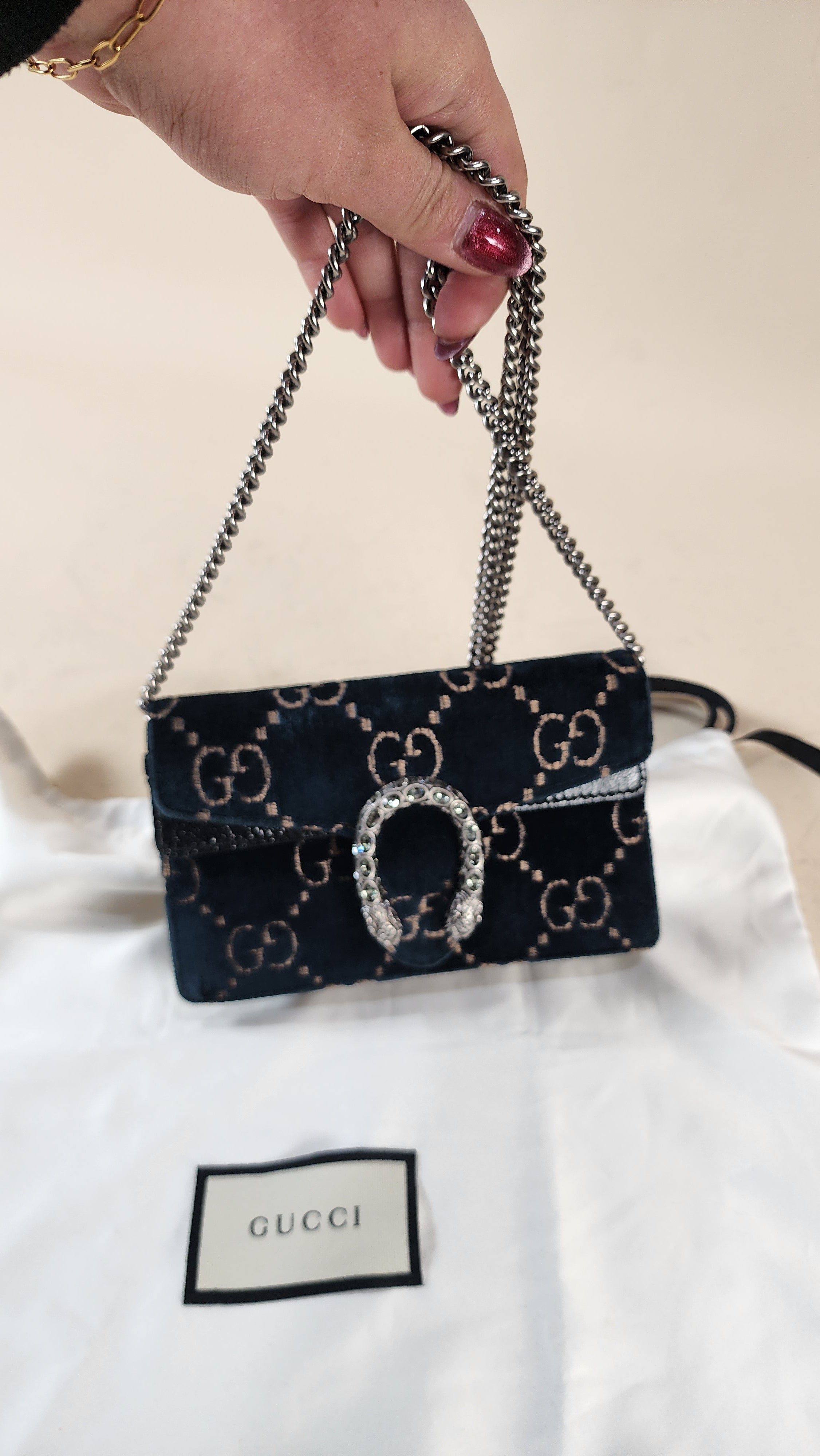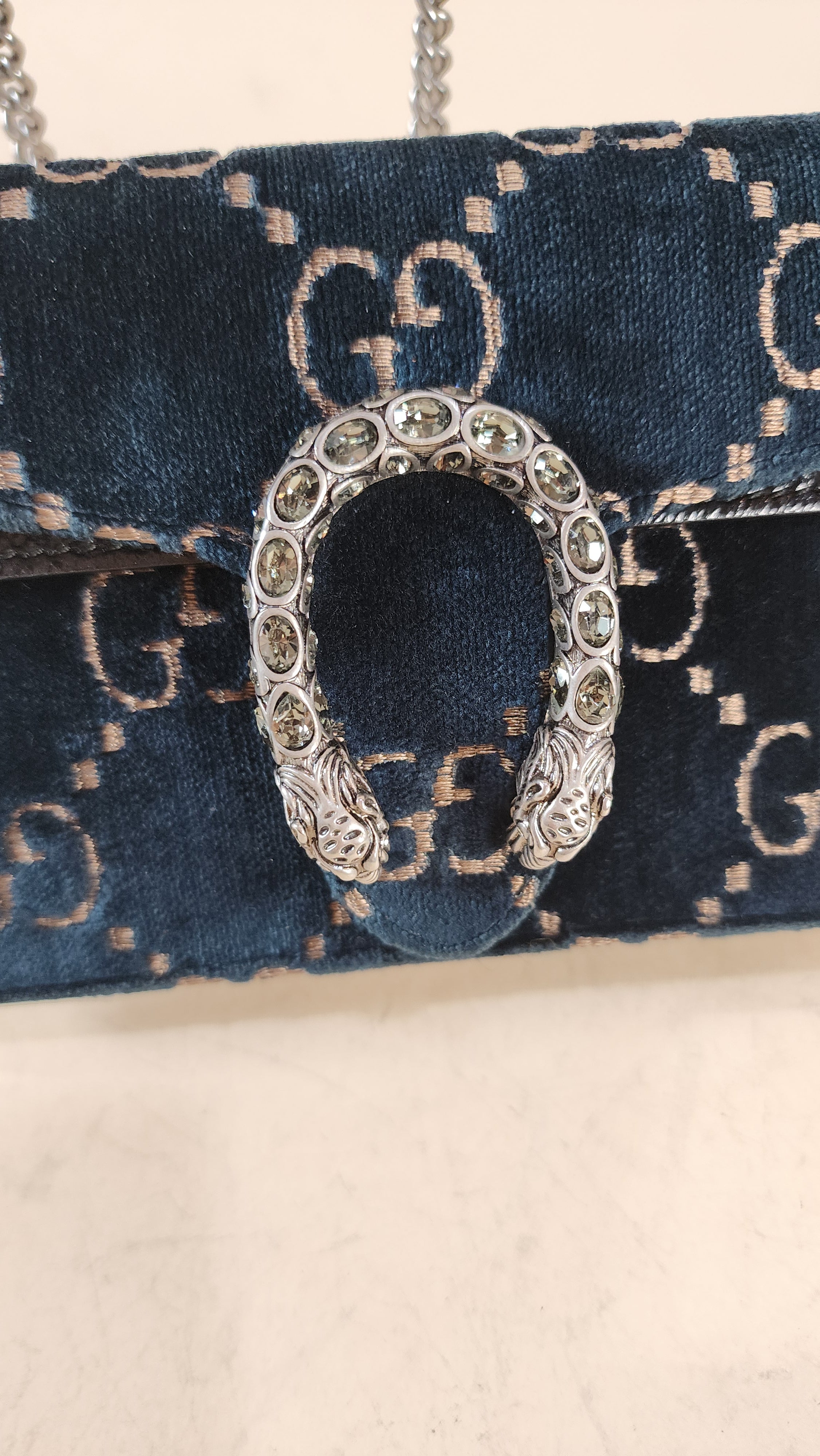 Condition details: In great condition; outside navy velvet is in great condition with some signs of wear and rubbing in areas, GG print is in great condition. The front closure is a dionysus and is in great condition with rhinestones that are still very shiny. Black textured patent leather sides and bottom are in great condition with some signs of wear. Corners and edges are in great condition. Brushed silver tone chain strap is in great condition with some signs of wear., chain is removable Hardware is in great condition with some signs of wear, snap closure works well. Inside is clean, one small stitch missing inside on one corner, no foul smell. Comes with a Gucci dustbag.