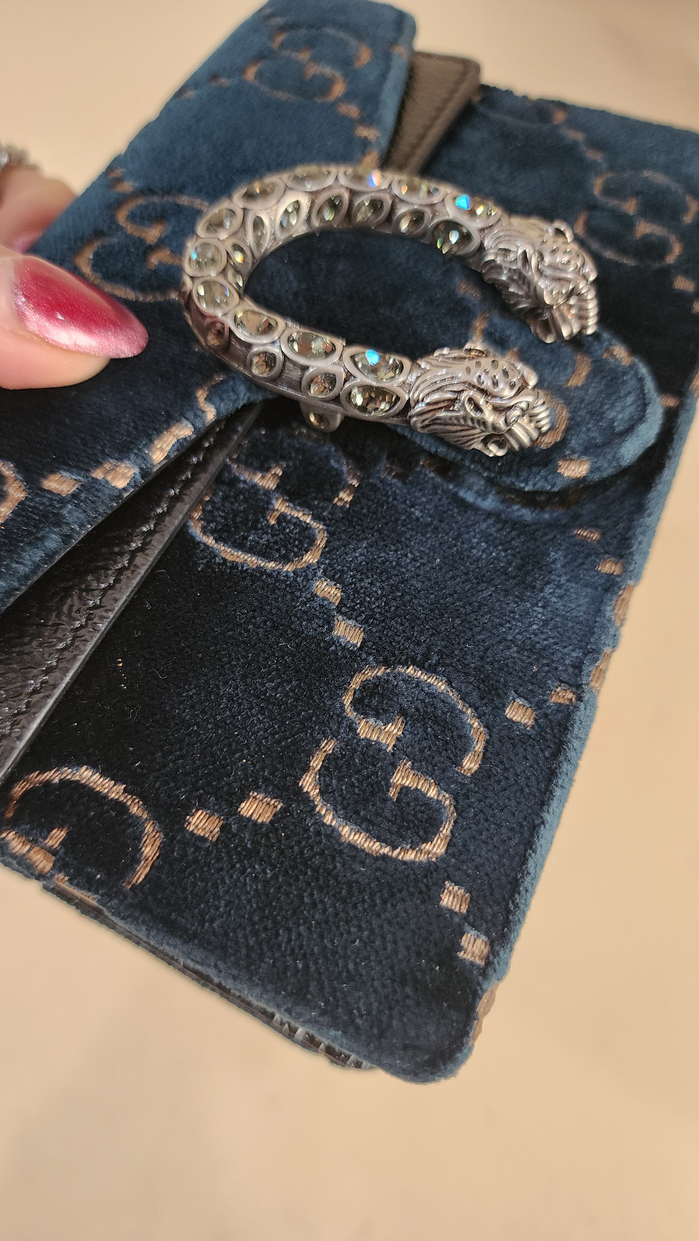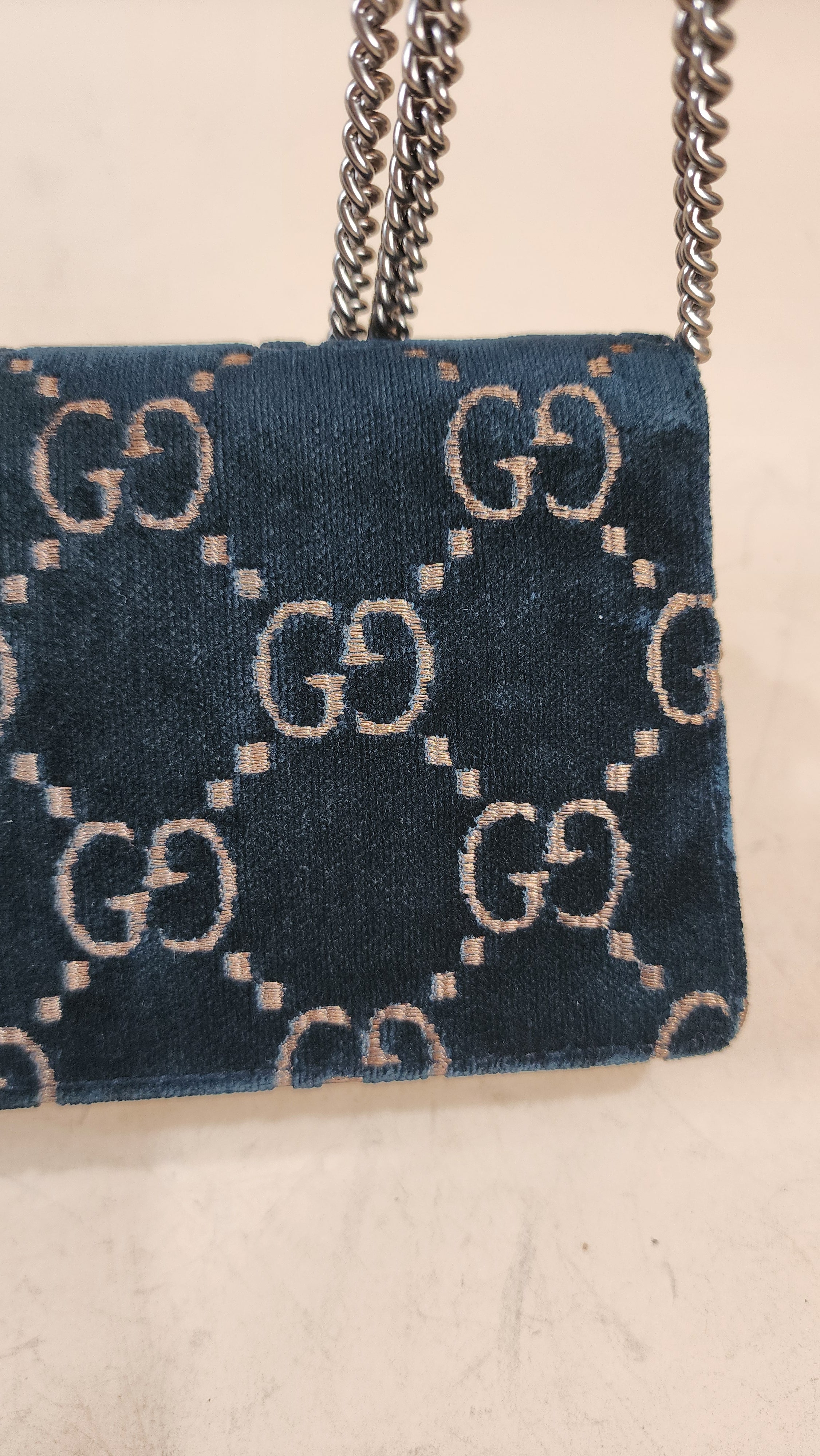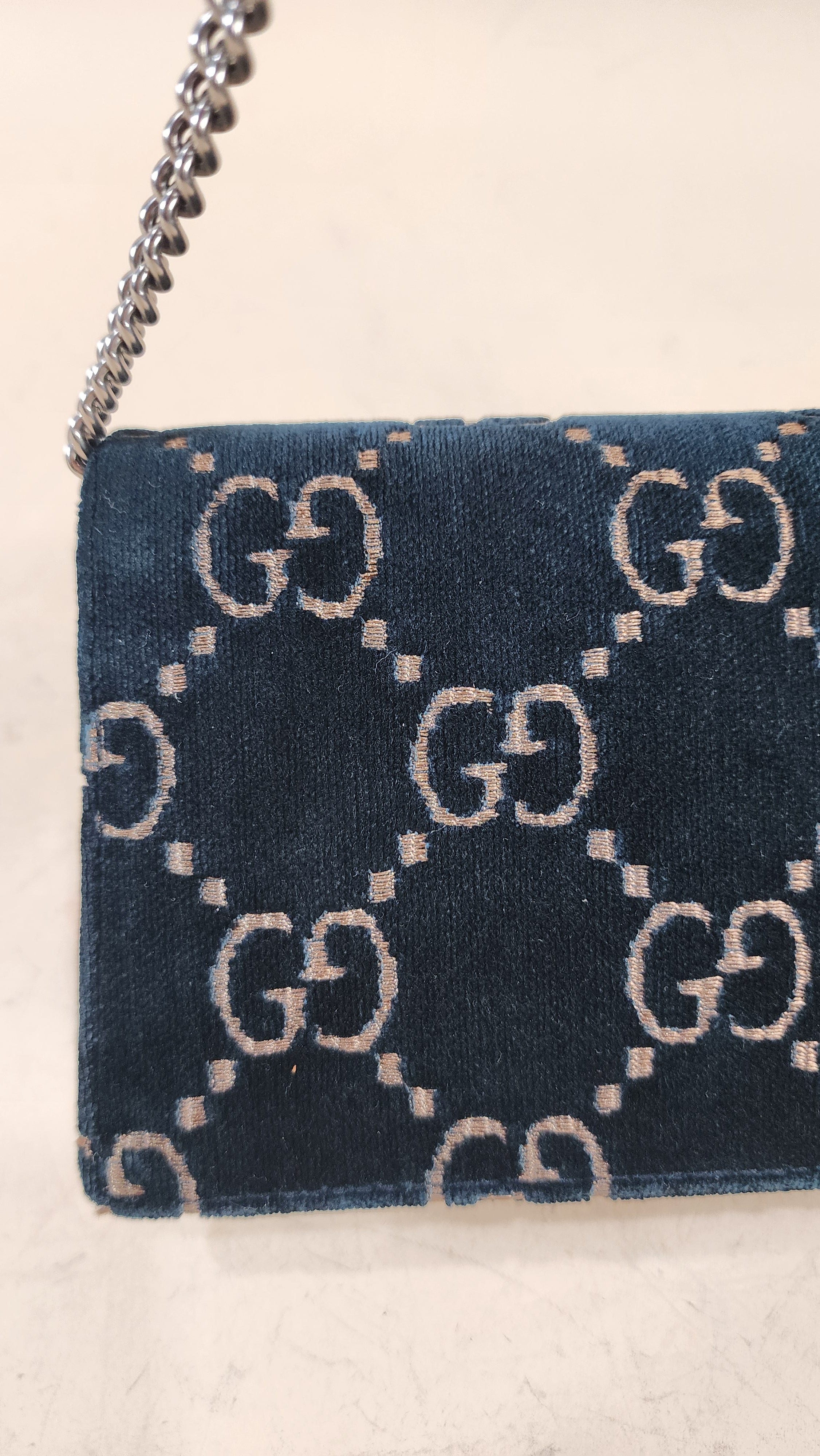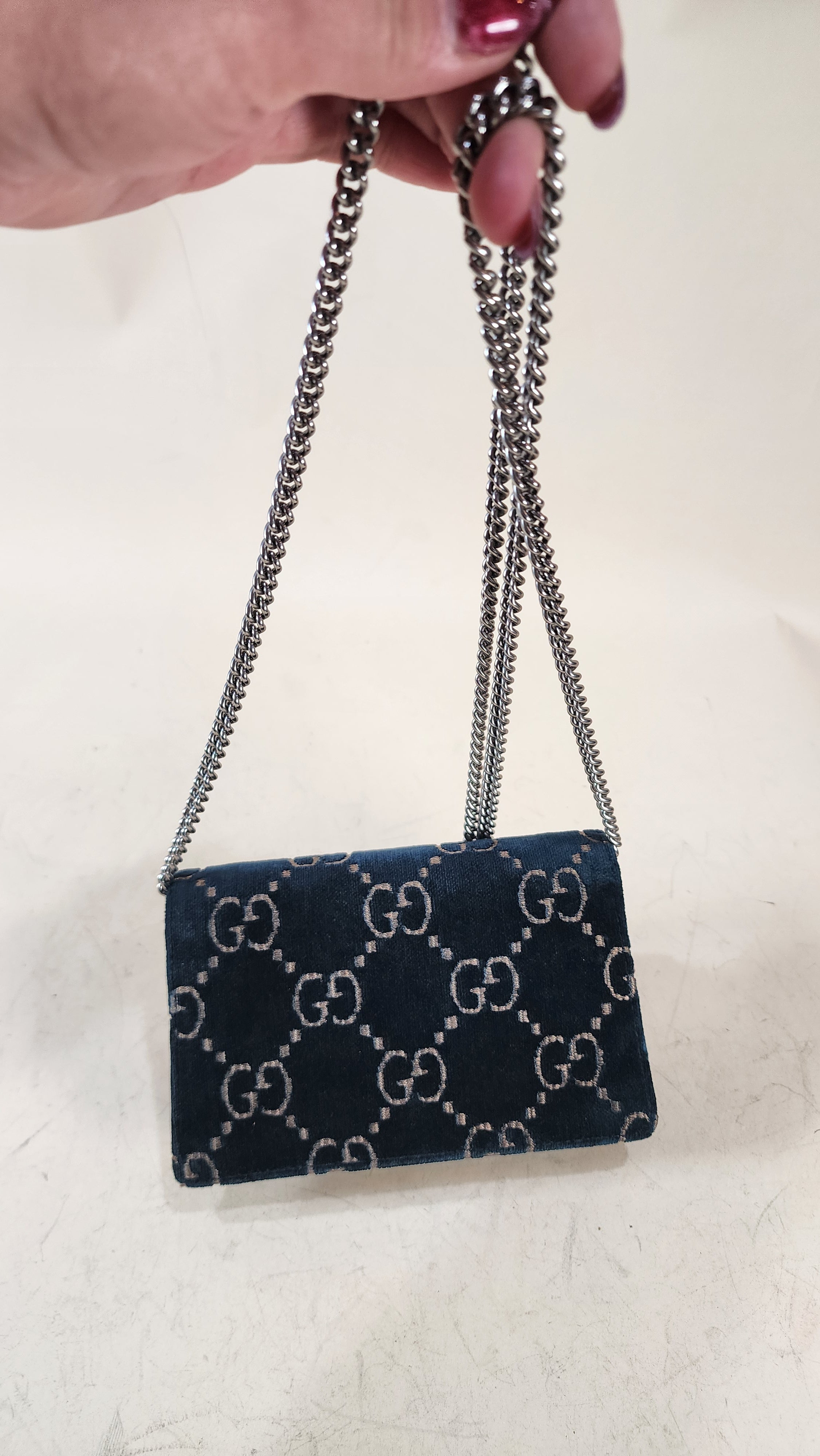 Condition details: In great condition; outside navy velvet is in great condition with some signs of wear and rubbing in areas, GG print is in great condition. The front closure is a dionysus and is in great condition with rhinestones that are still very shiny. Black textured patent leather sides and bottom are in great condition with some signs of wear. Corners and edges are in great condition. Brushed silver tone chain strap is in great condition with some signs of wear., chain is removable Hardware is in great condition with some signs of wear, snap closure works well. Inside is clean, one small stitch missing inside on one corner, no foul smell. Comes with a Gucci dustbag.