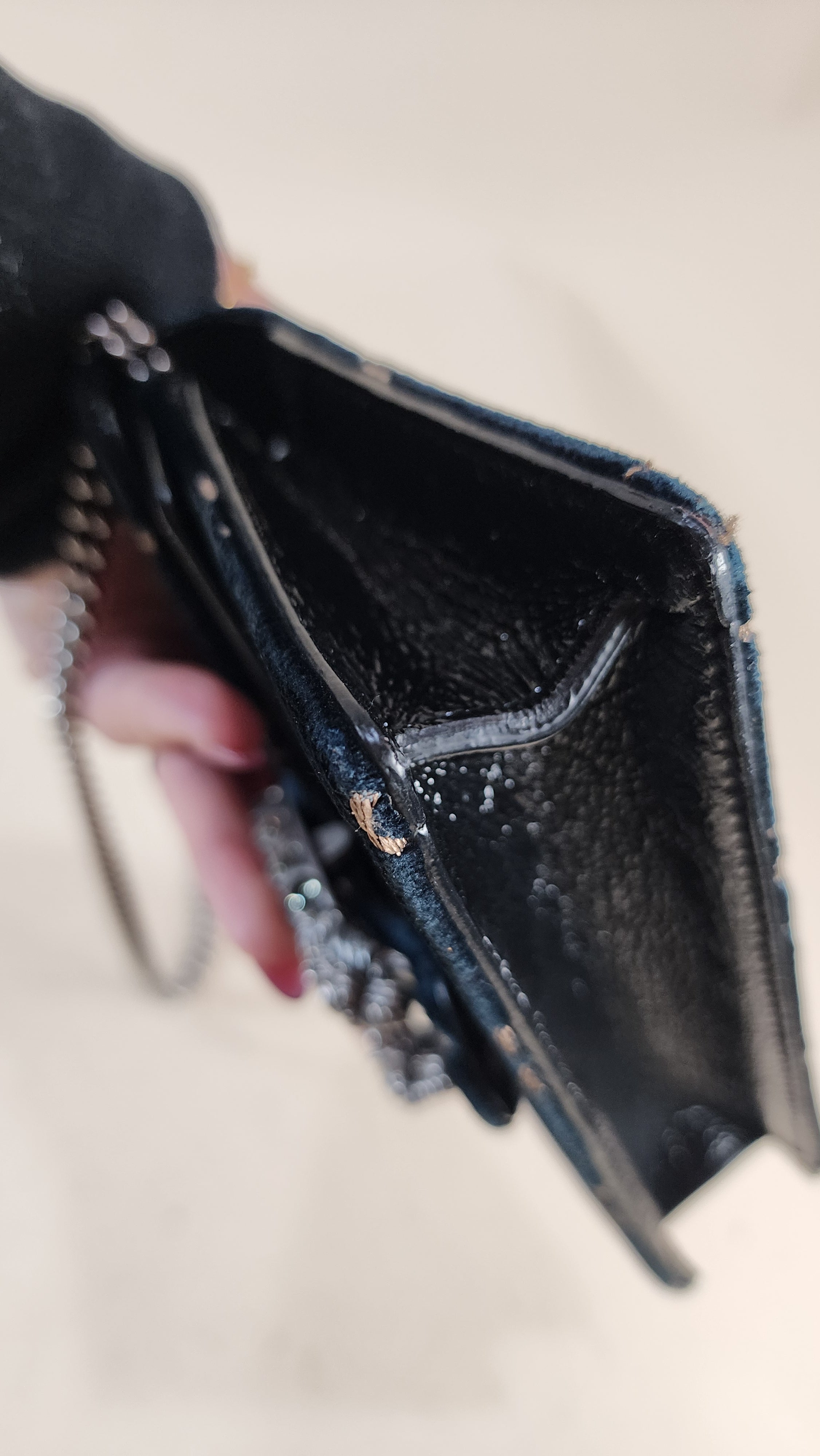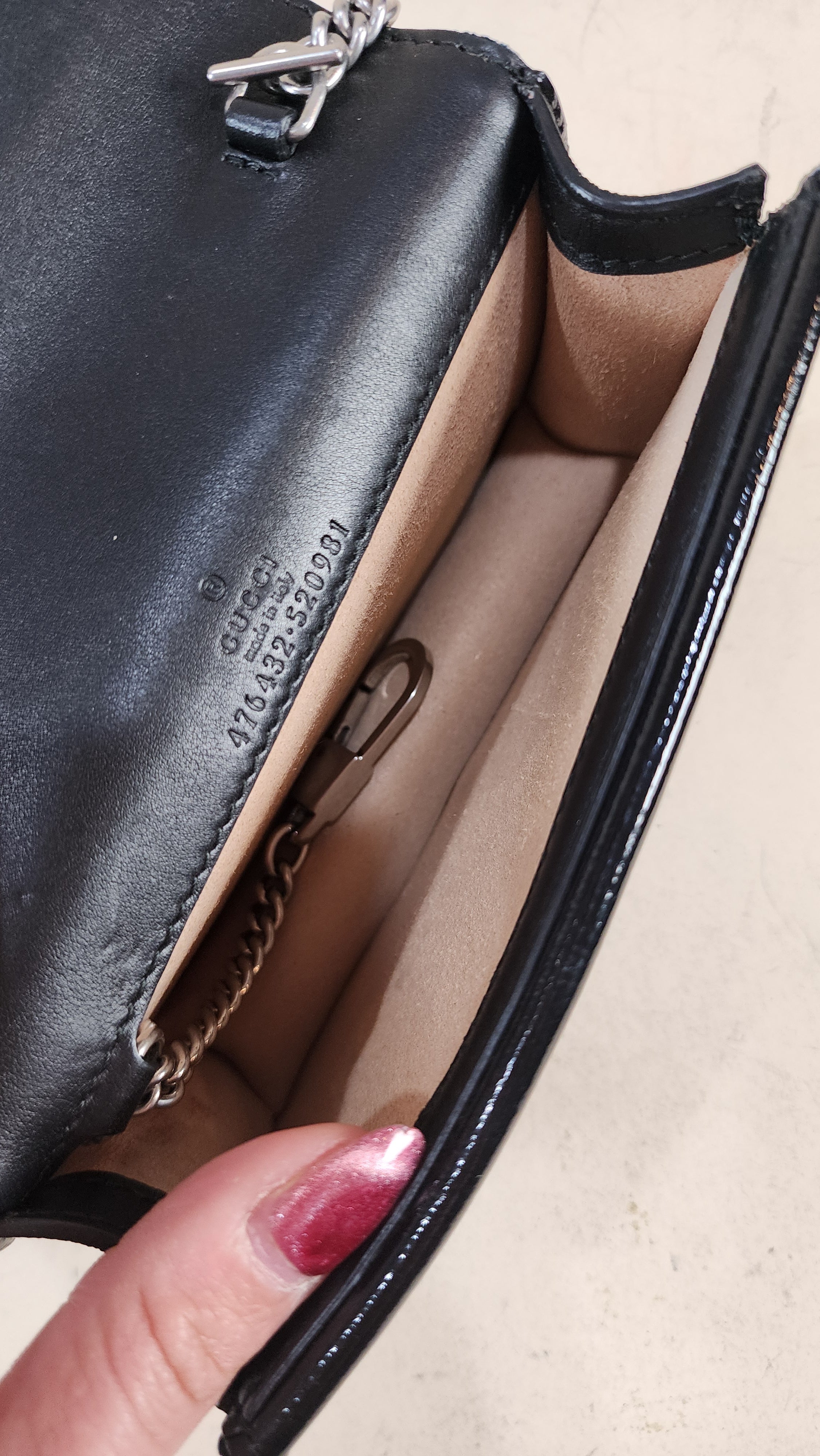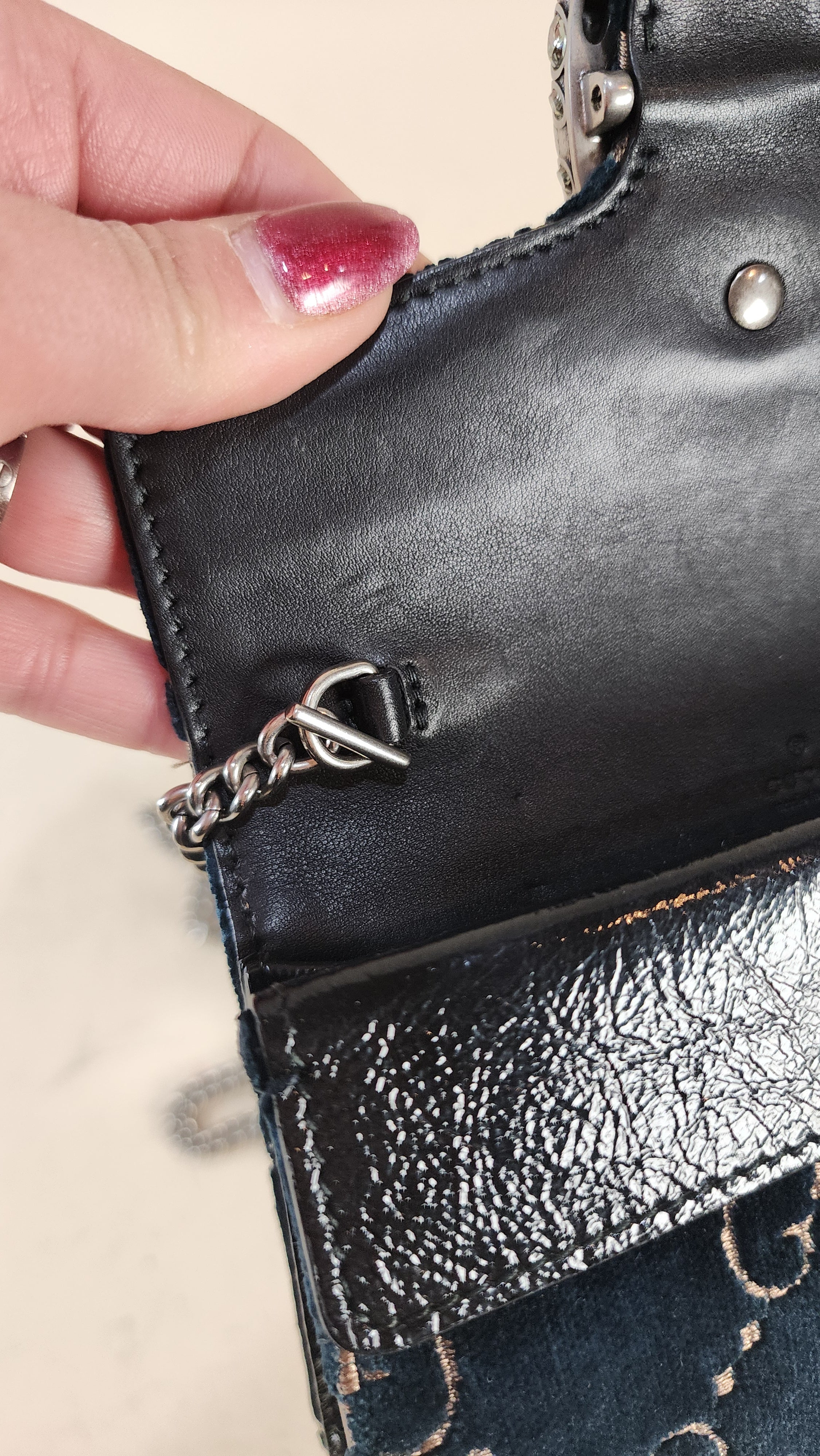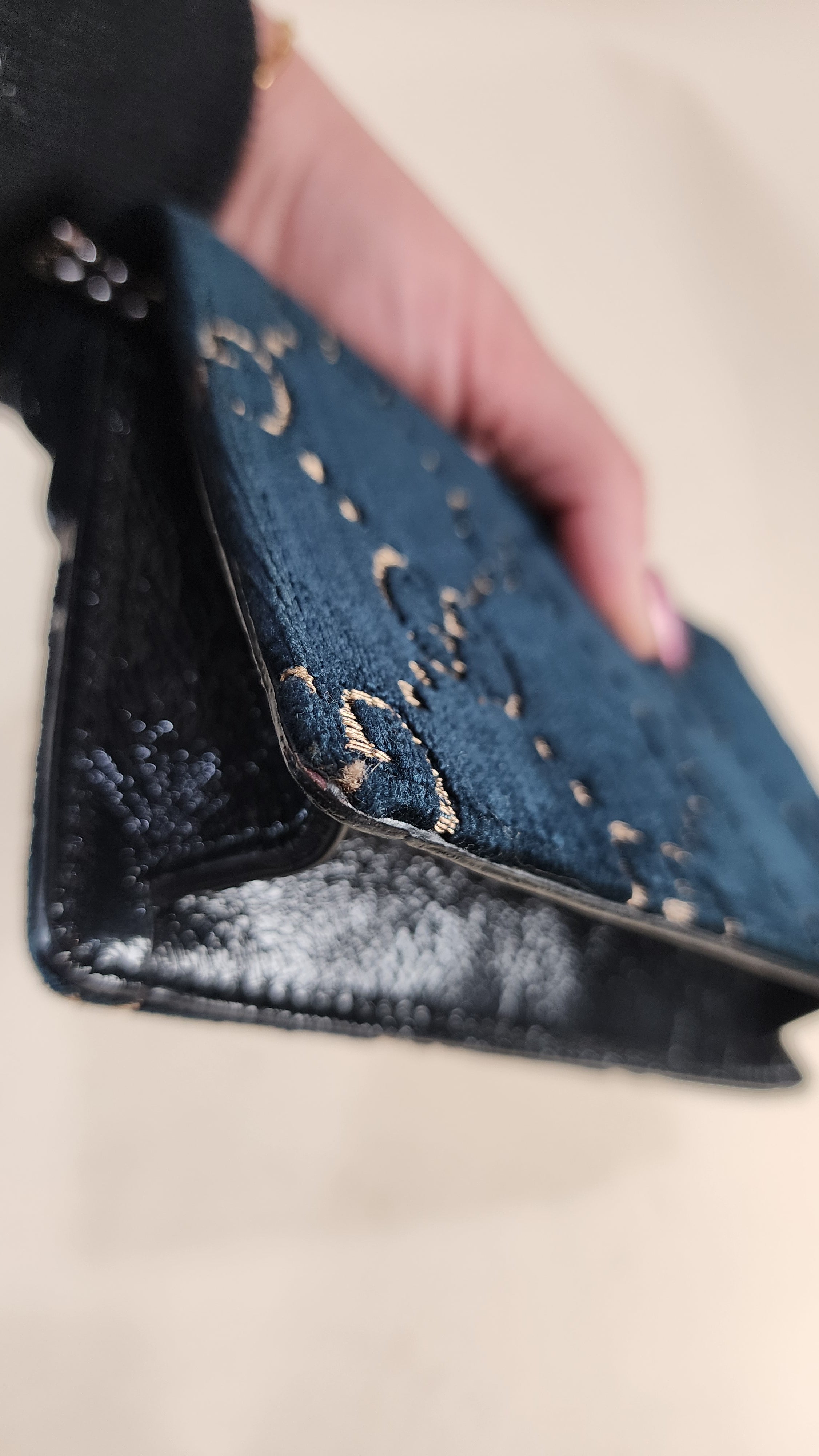 Condition details: In great condition; outside navy velvet is in great condition with some signs of wear and rubbing in areas, GG print is in great condition. The front closure is a dionysus and is in great condition with rhinestones that are still very shiny. Black textured patent leather sides and bottom are in great condition with some signs of wear. Corners and edges are in great condition. Brushed silver tone chain strap is in great condition with some signs of wear., chain is removable Hardware is in great condition with some signs of wear, snap closure works well. Inside is clean, one small stitch missing inside on one corner, no foul smell. Comes with a Gucci dustbag.