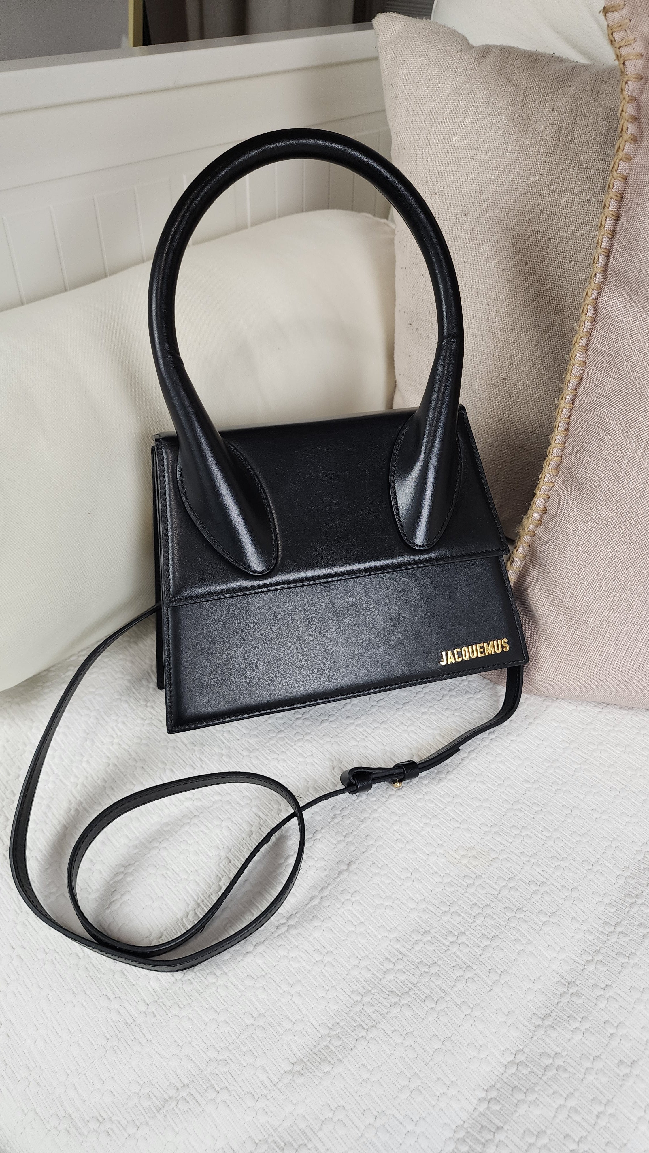 Condition details: This item is in excellent condition. Black leather is in excellent condition with some signs of wear, light surface scratches and rubbing. Corners and edges are in excellent condition with some signs of wear. Leather handle is in excellent condition, also comes with a removable longer shoulder strap, which is also in great condition. Gold toned Jacquemus lettering on front is vibrant and in excellent condition; magnetic closure works well. Inside is clean with some signs of wear, no foul smell.