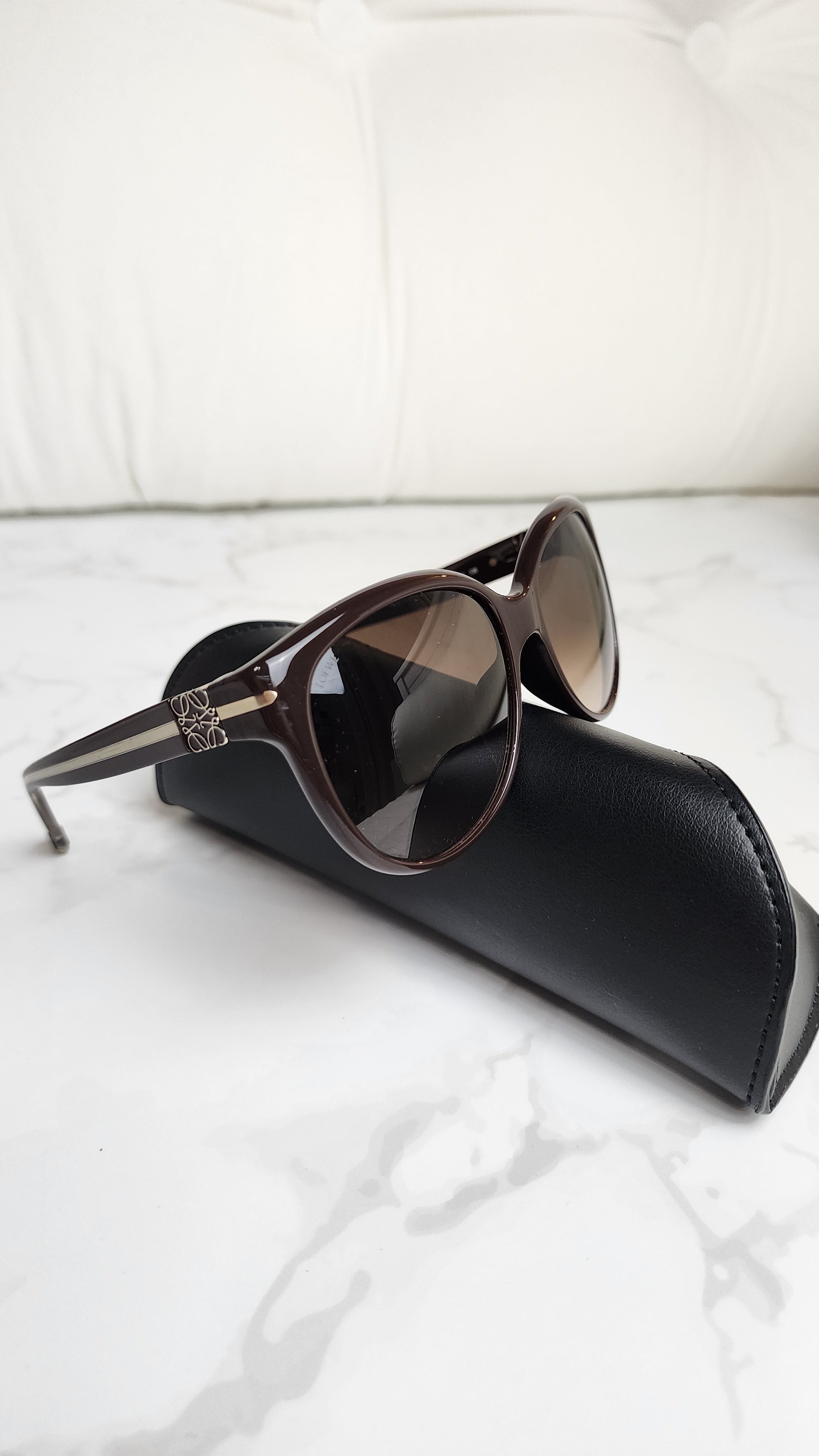 Condition details: These sunglasses are in great condition; they are a dark brown plastic frame and arms with silver Loewe logo on the temple and at the end of arms with a silver stripe in between. They come with a Loewe padded leather case.