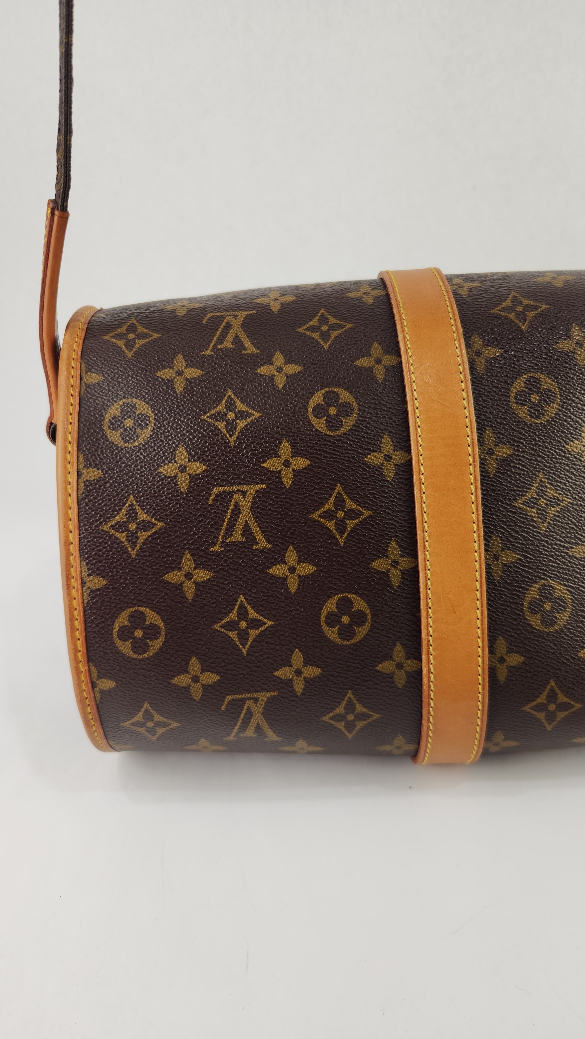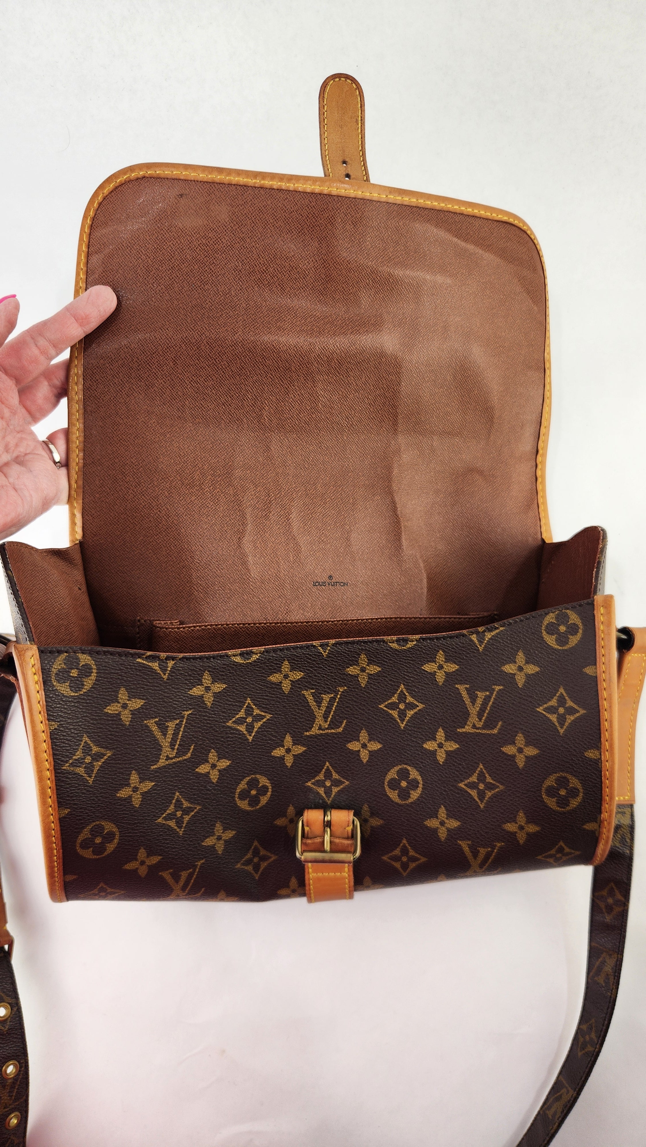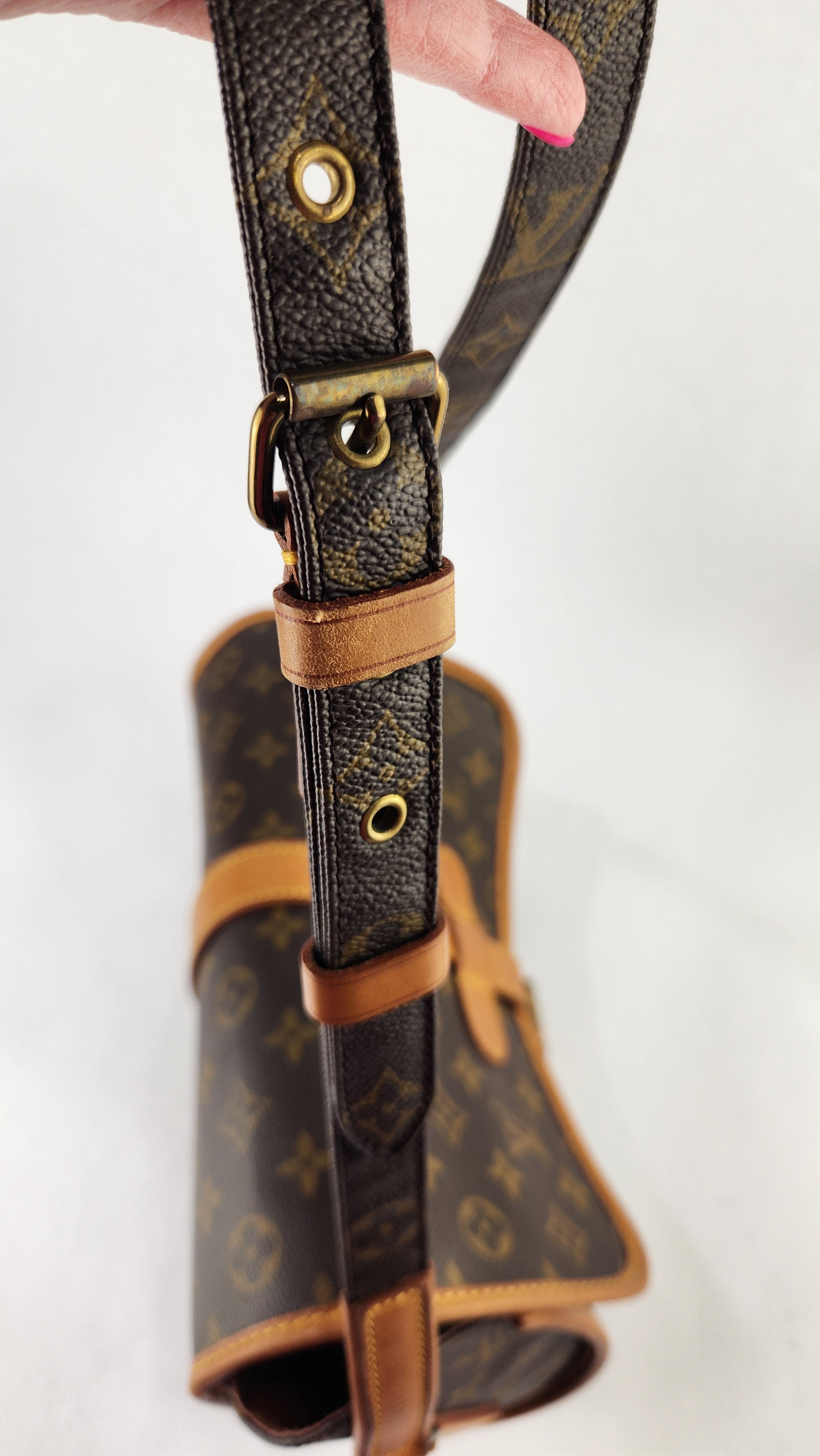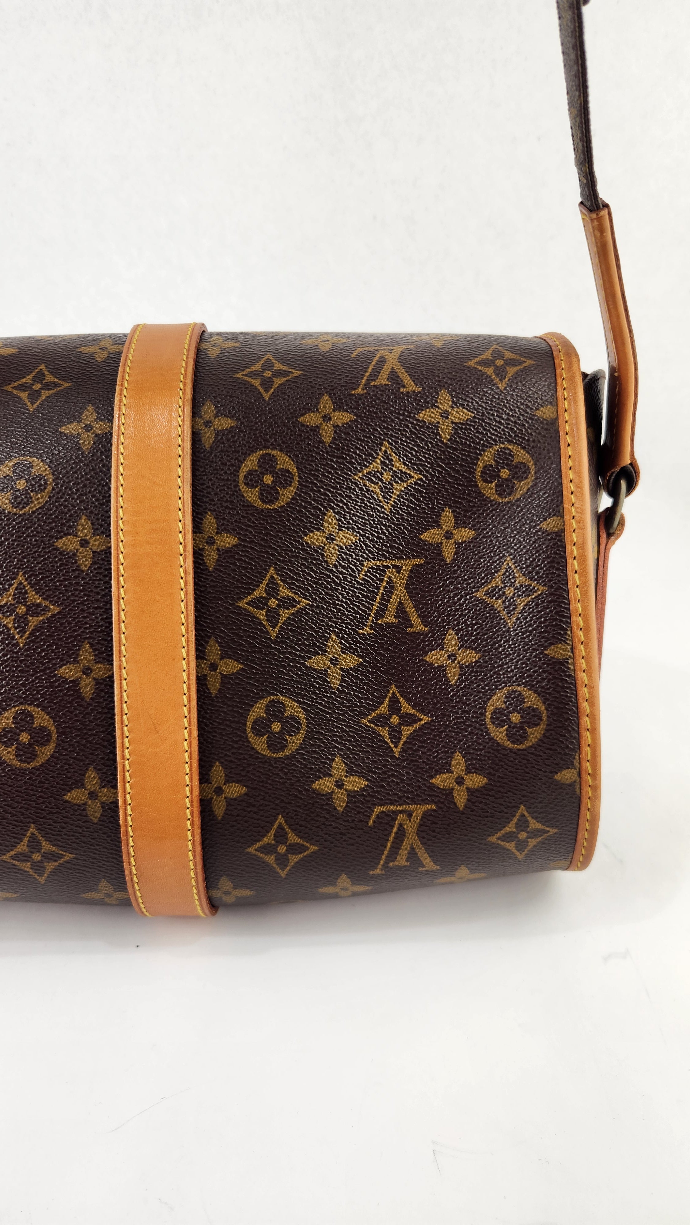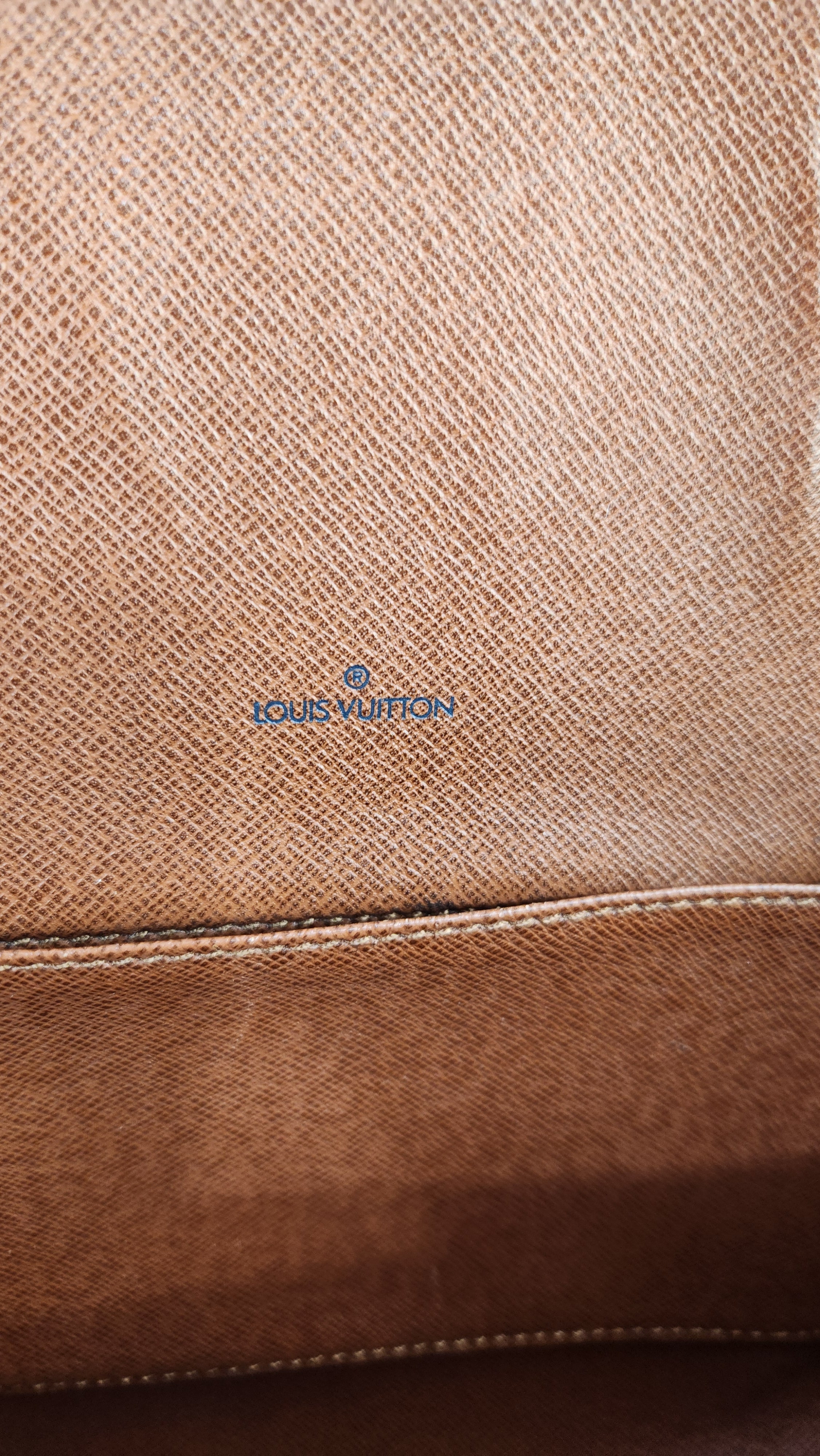 Condition details: This item is in great condition; outside pvc canvas in great condition, some minor signs of wear throughout. Corners and edges are in great condition with some signs of wear and rubbing. Adjustable shoulder strap is in great condition with some signs of wear. Gold tone hardware has some signs of wear and darkening, buckle closure works well. Inside is clean with some signs of wear, creasing on the top flap closure and the inside pocket has been cleaned, no foul smell.