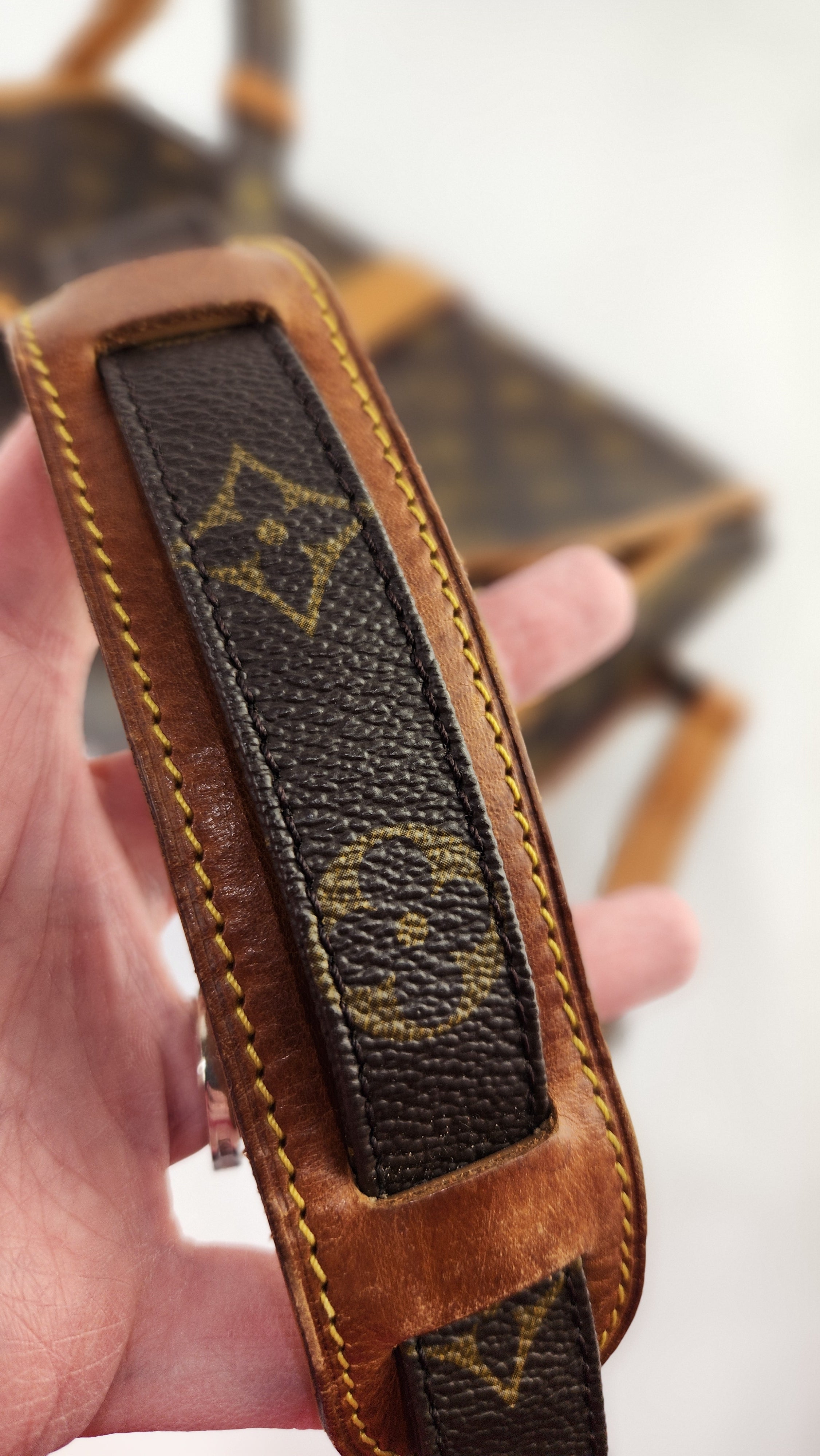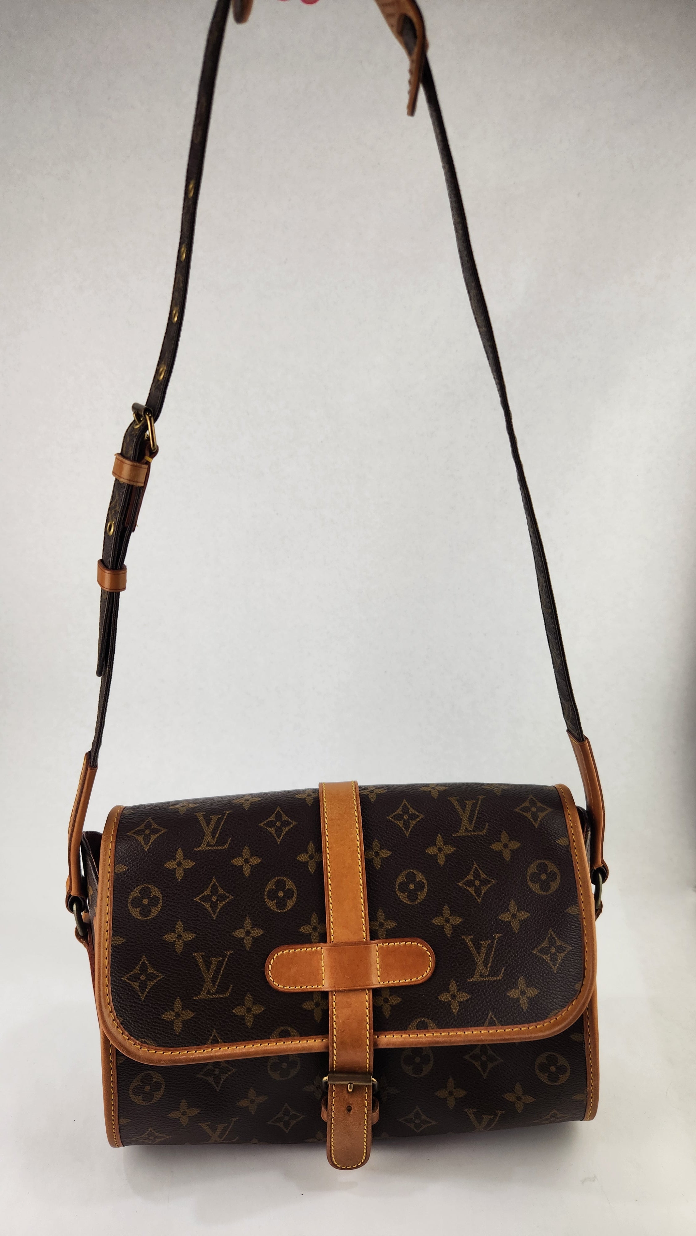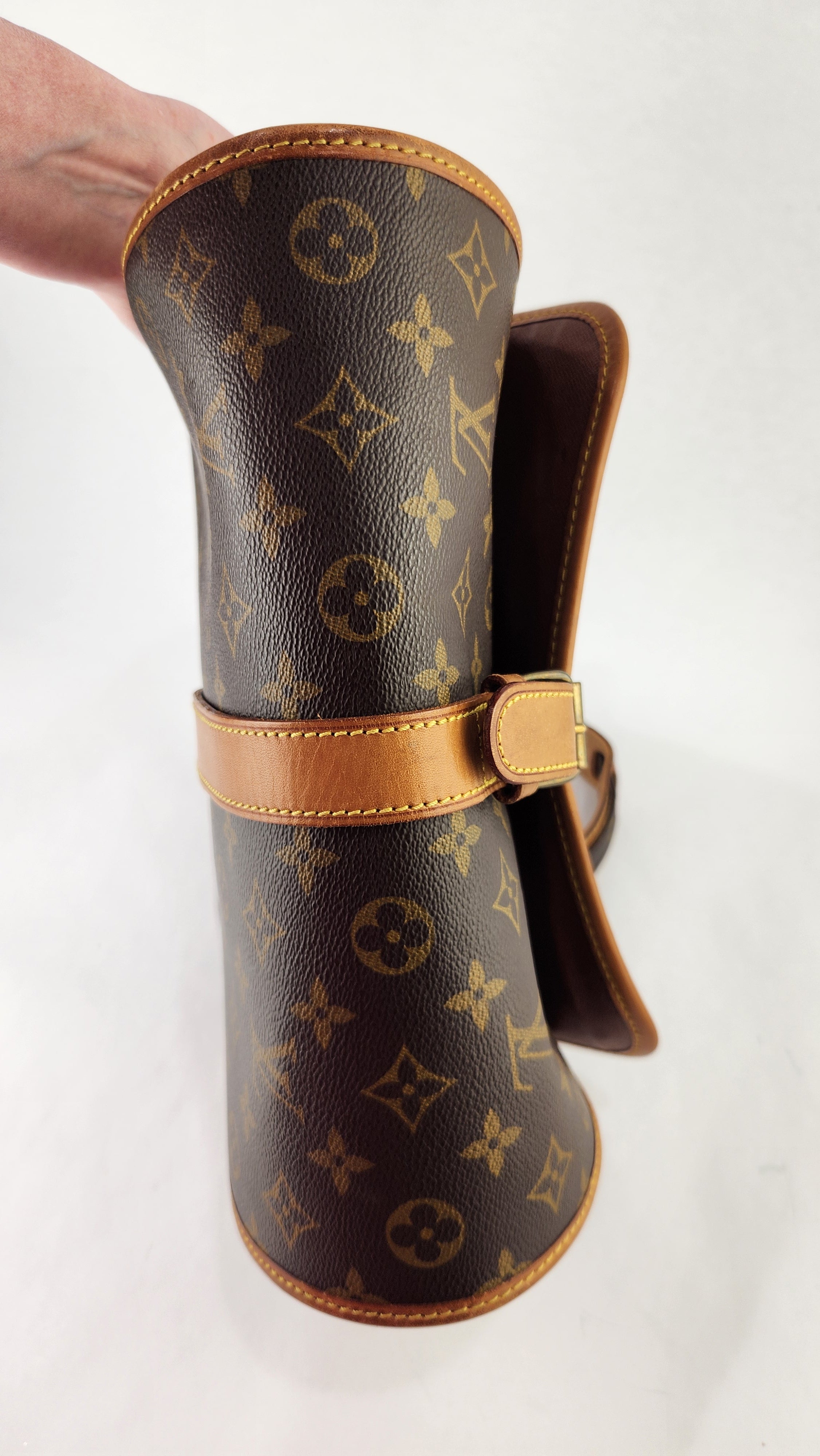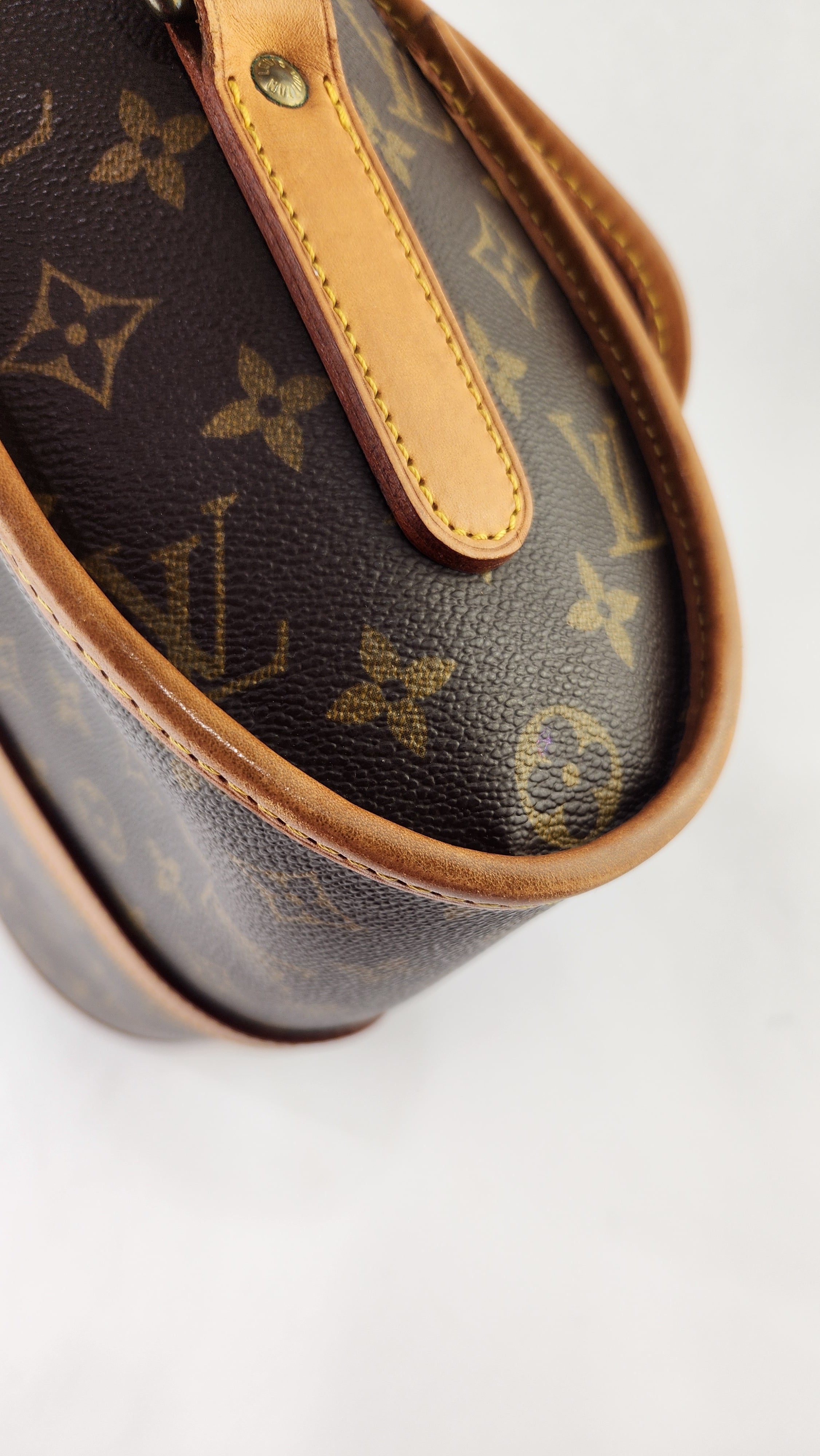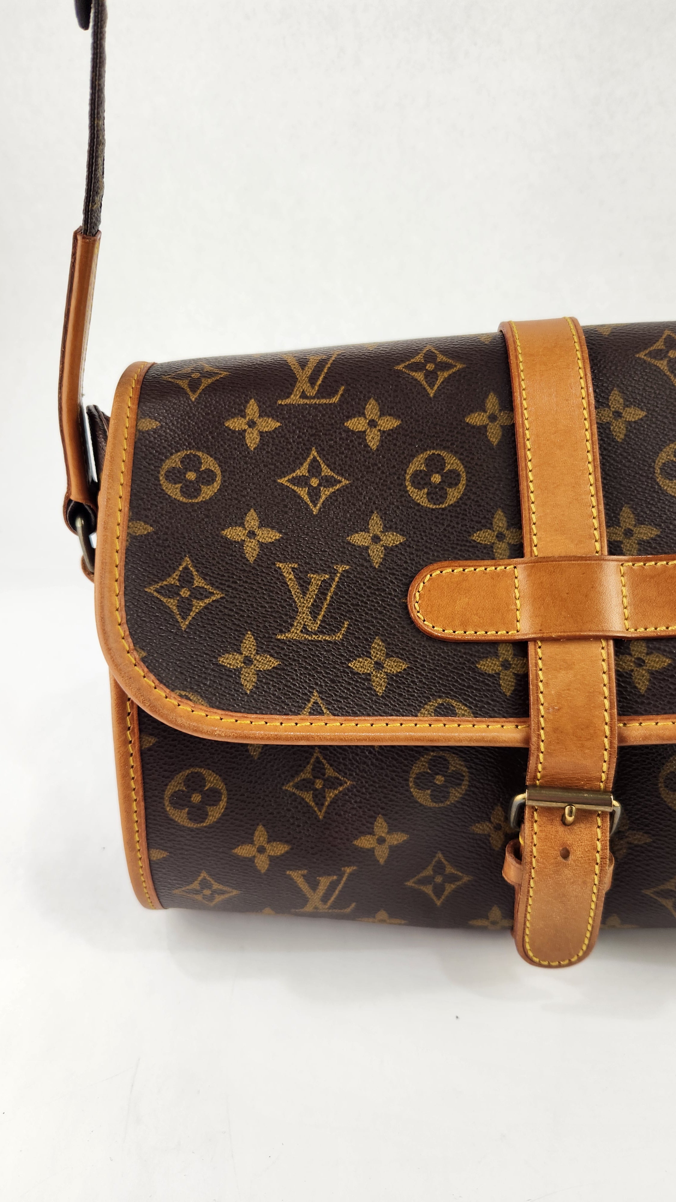 Condition details: This item is in great condition; outside pvc canvas in great condition, some minor signs of wear throughout. Corners and edges are in great condition with some signs of wear and rubbing. Adjustable shoulder strap is in great condition with some signs of wear. Gold tone hardware has some signs of wear and darkening, buckle closure works well. Inside is clean with some signs of wear, creasing on the top flap closure and the inside pocket has been cleaned, no foul smell.