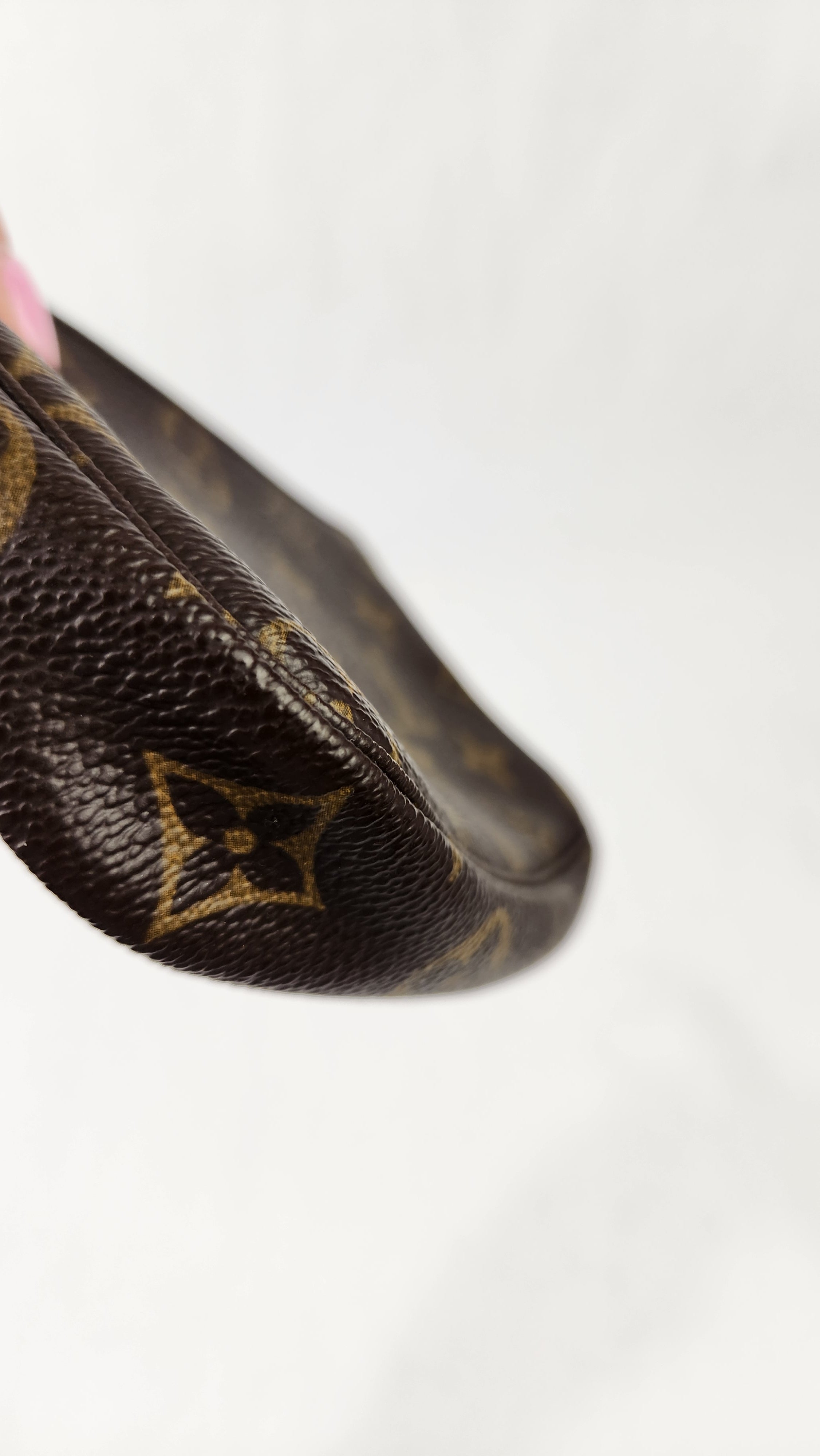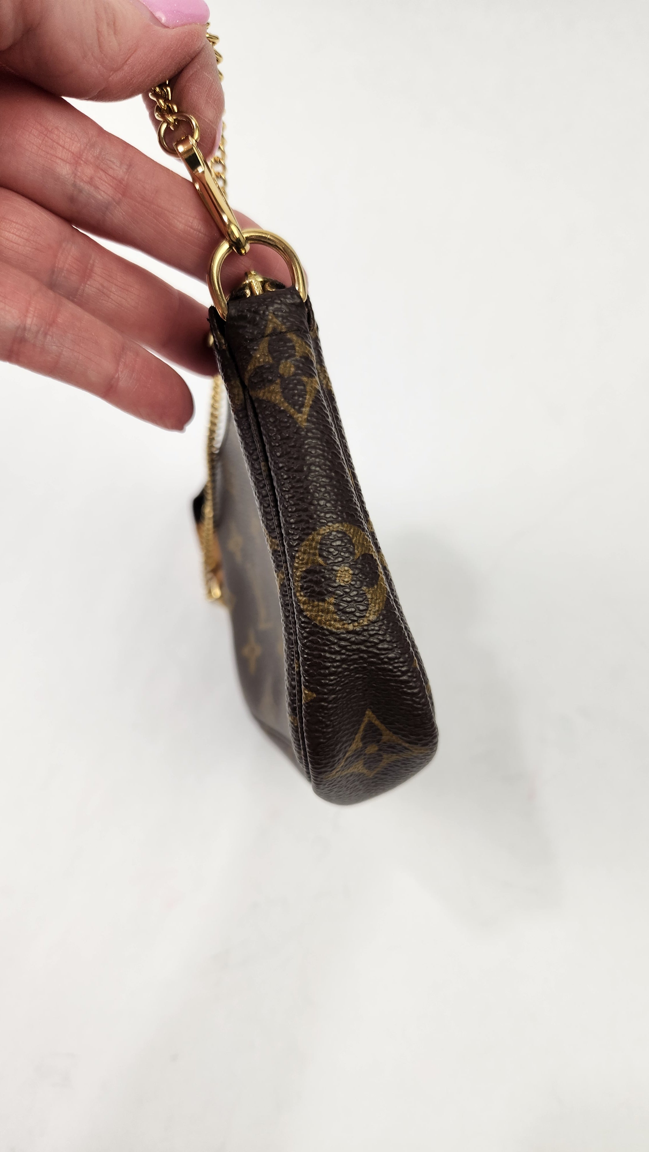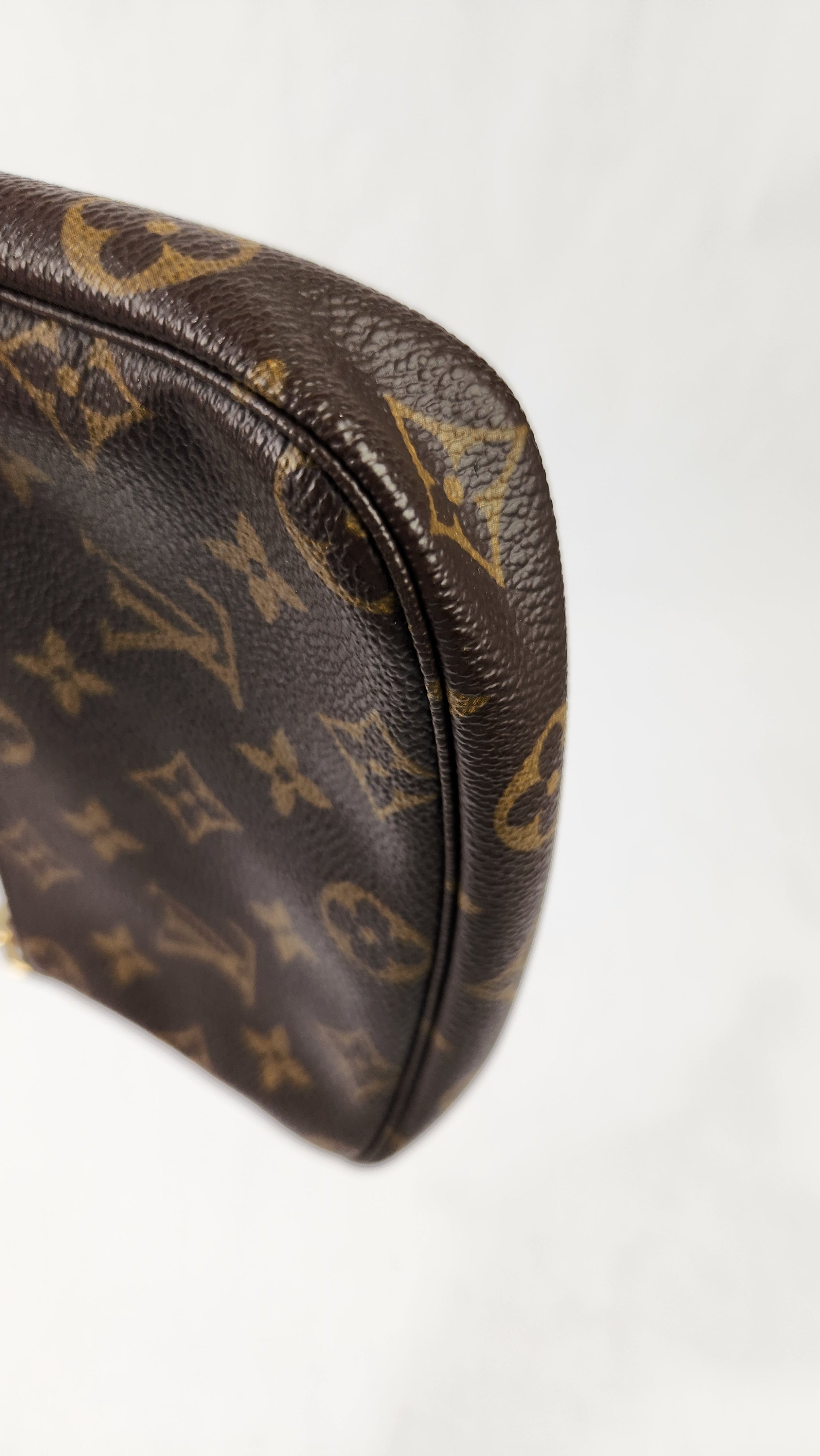 Condition details: This item is in excellent condition; outside monogram PVC coated canvas is in excellent condition with some minor signs of wear throughout. Corners are in great condition with some minor signs of wear. Leather side tab is in great condition with some signs of wear. Gold tone hardware is in great condition with minimal signs of wear, zipper works well. Chain strap can be moved to use as a wristlet and is in great condition. Inside is clean, no foul smell.