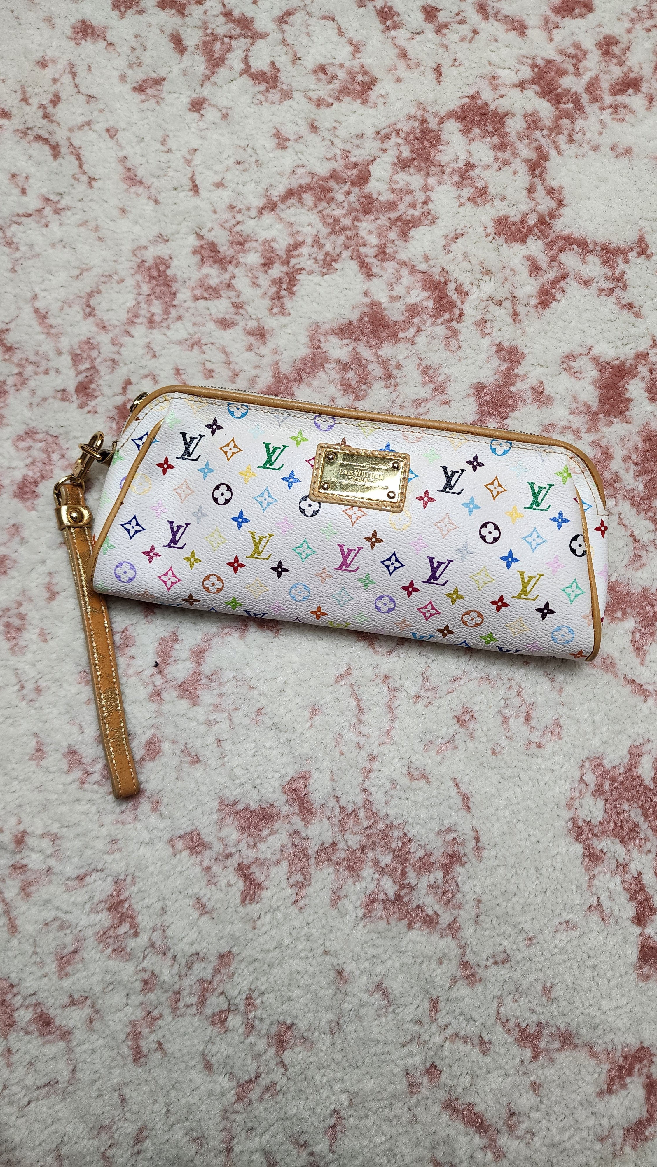 Condition details: In great condition, outside white multicolor canvas is in great condition with some rubbing throughout. Vachetta leather was originally painted a gold color but that has faded and rubbed off and now a natural vachetta color is present which is even and light. Wristlet strap and around front metal plate still have remnants of the gold coloring. Cotton zipper has some marks around edges. Corners have some rubbing and sign of wear and marks in places. Hardwares with some signs of wear and surface rubs throughout and some silvering to zipper pull. Front plate has some surface rubbing. Inside is clean. No foul smell.