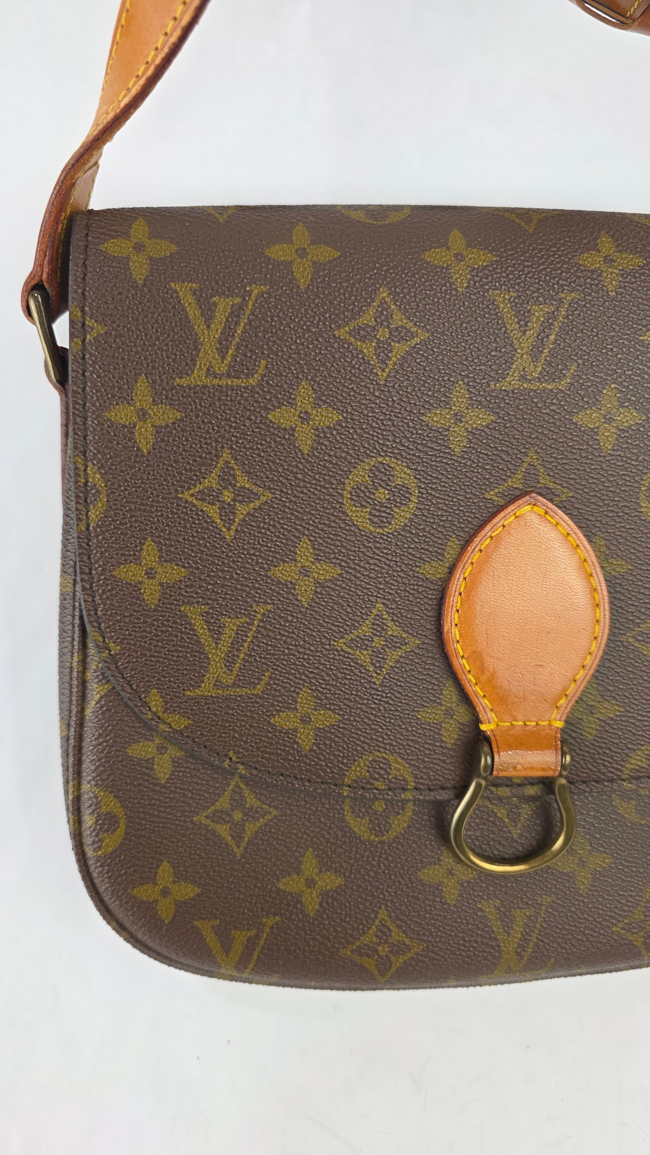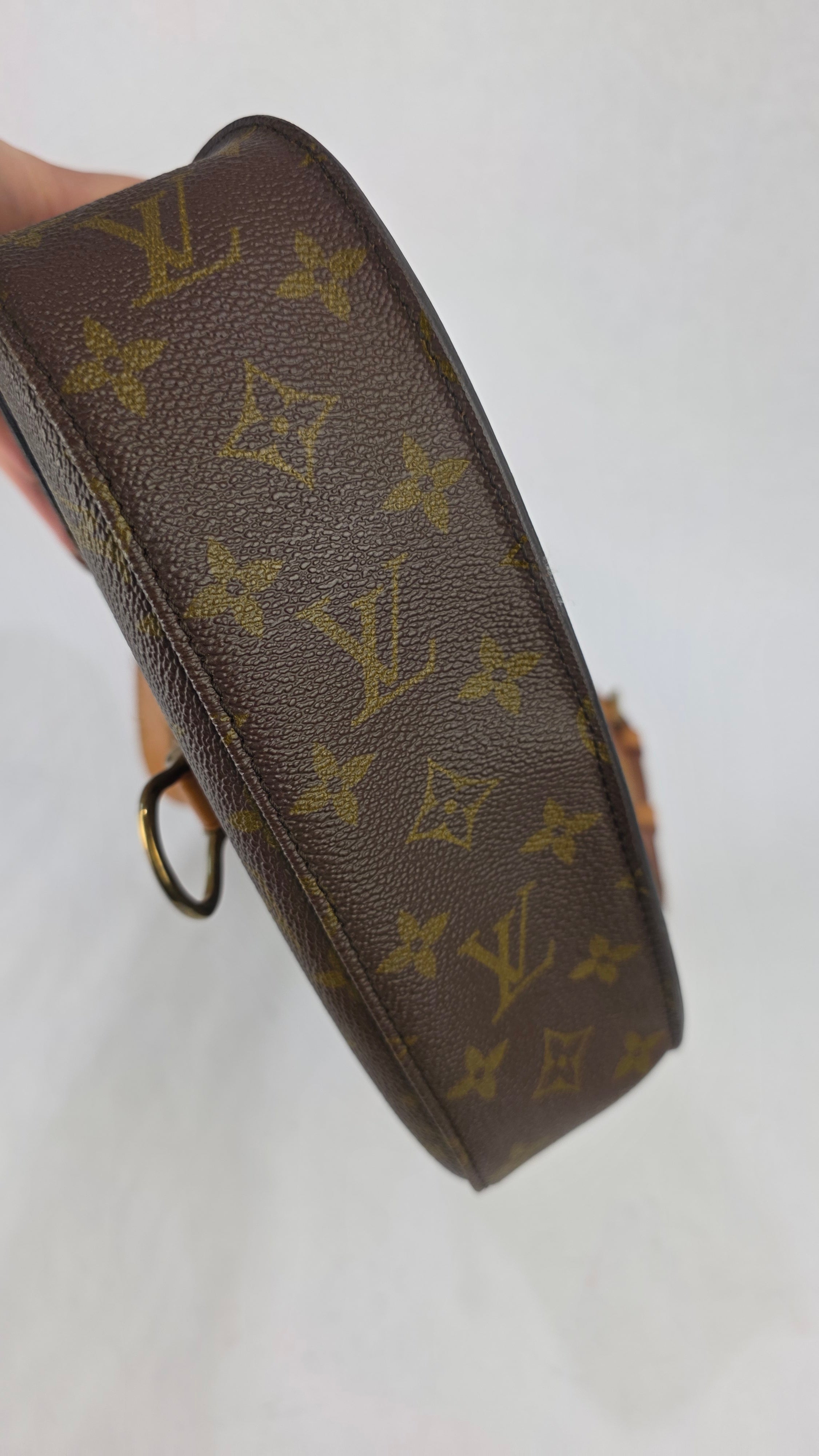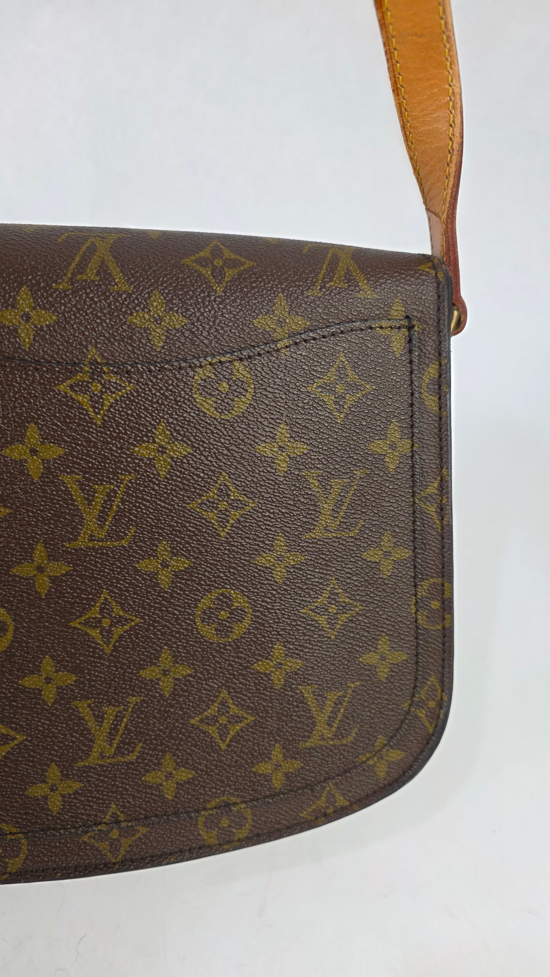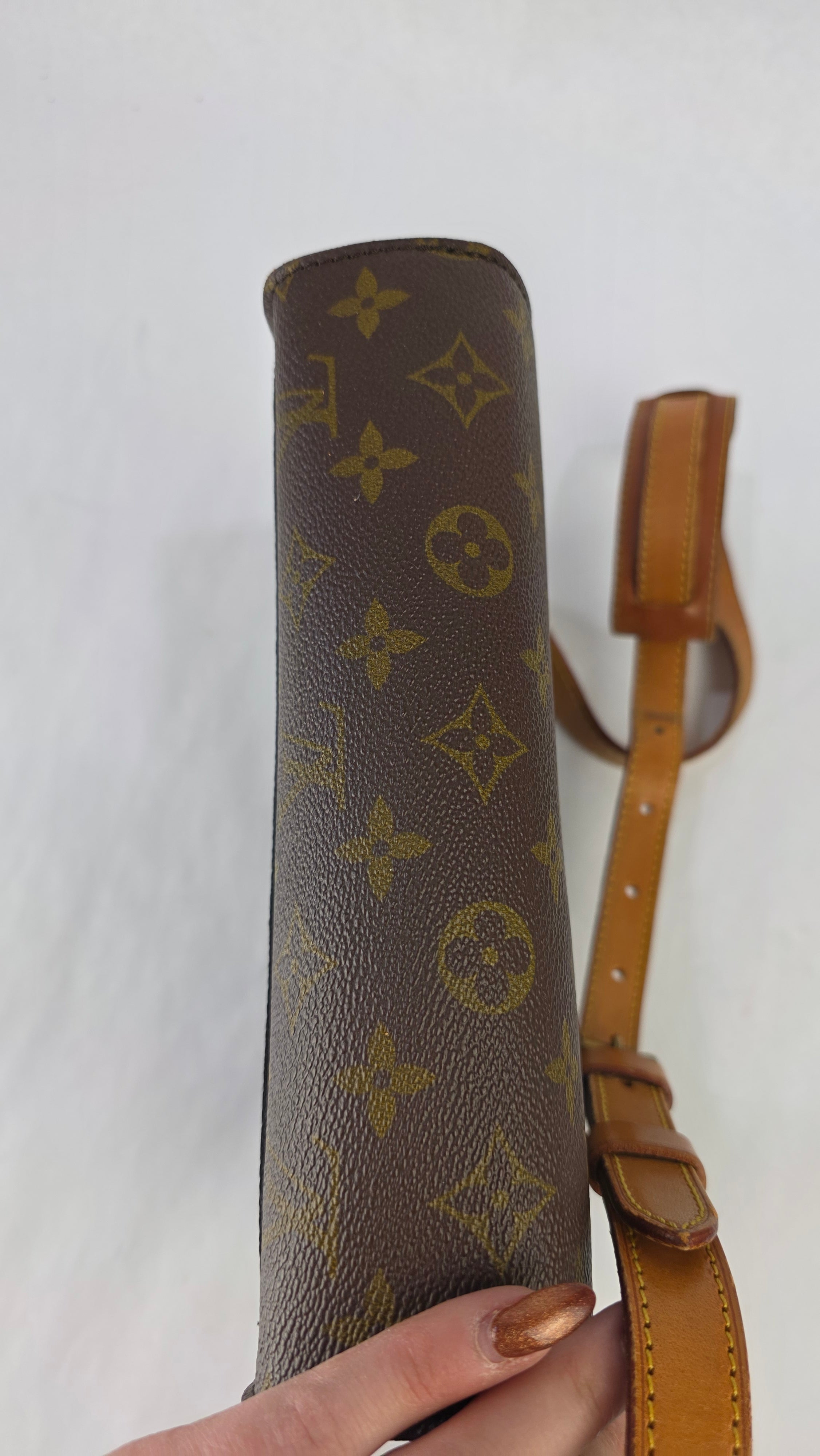 Condition details: In great vintage condition; outside monogram print is in great condition with some signs of wear. Corners and edges are in great condition with some signs of wear and rubbing in places. Leather parts and shoulder strap are in great condition with some signs of wear; shoulder strap is adjustable and has some signs of wear, some creasing, rubbing on edges and a mark near one of the previous buckle holes. Gold tone hardware has some signs of wear, snap closure and internal zipper work well. Inside is clean with some signs of wear, no foul smell.