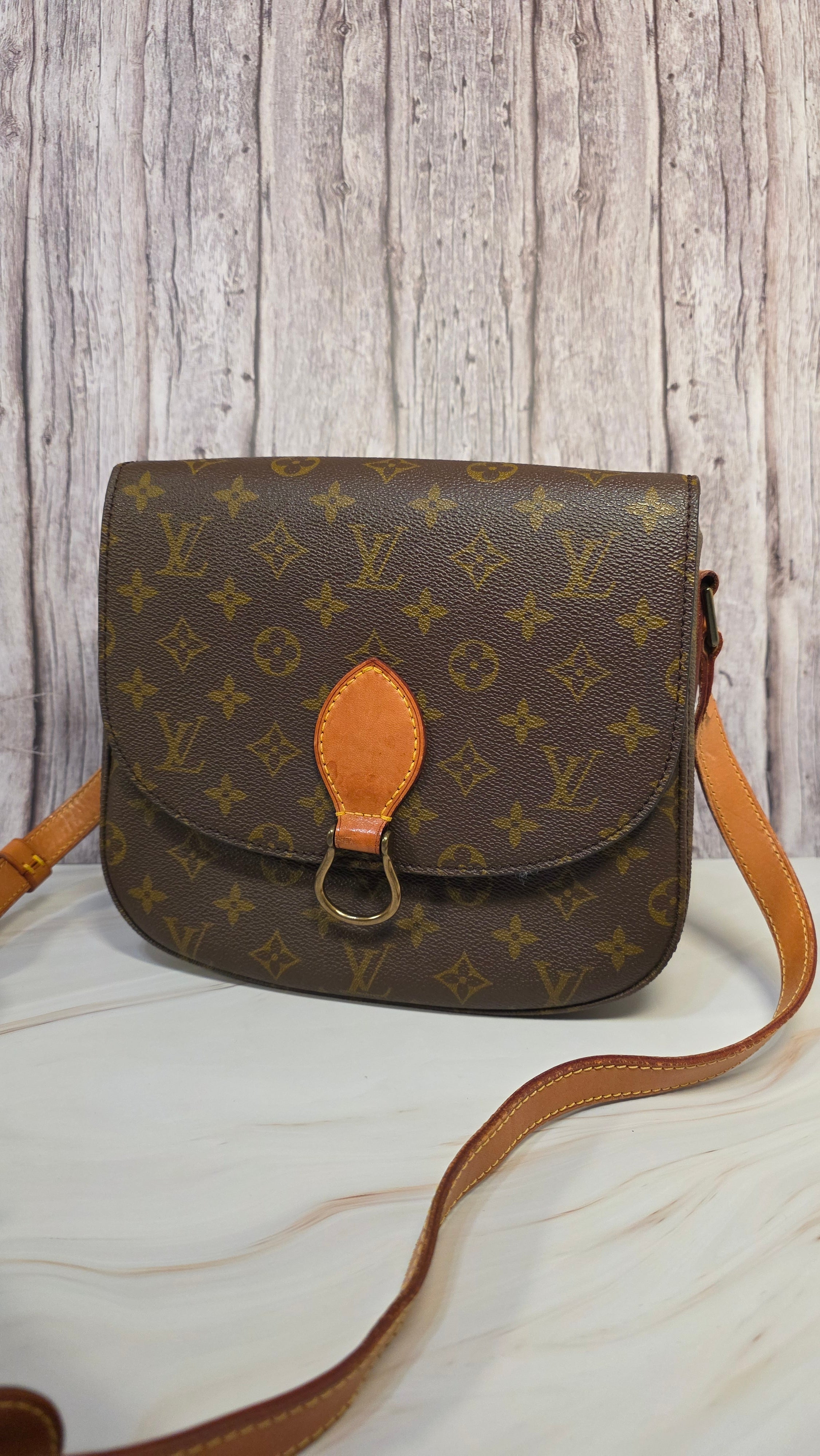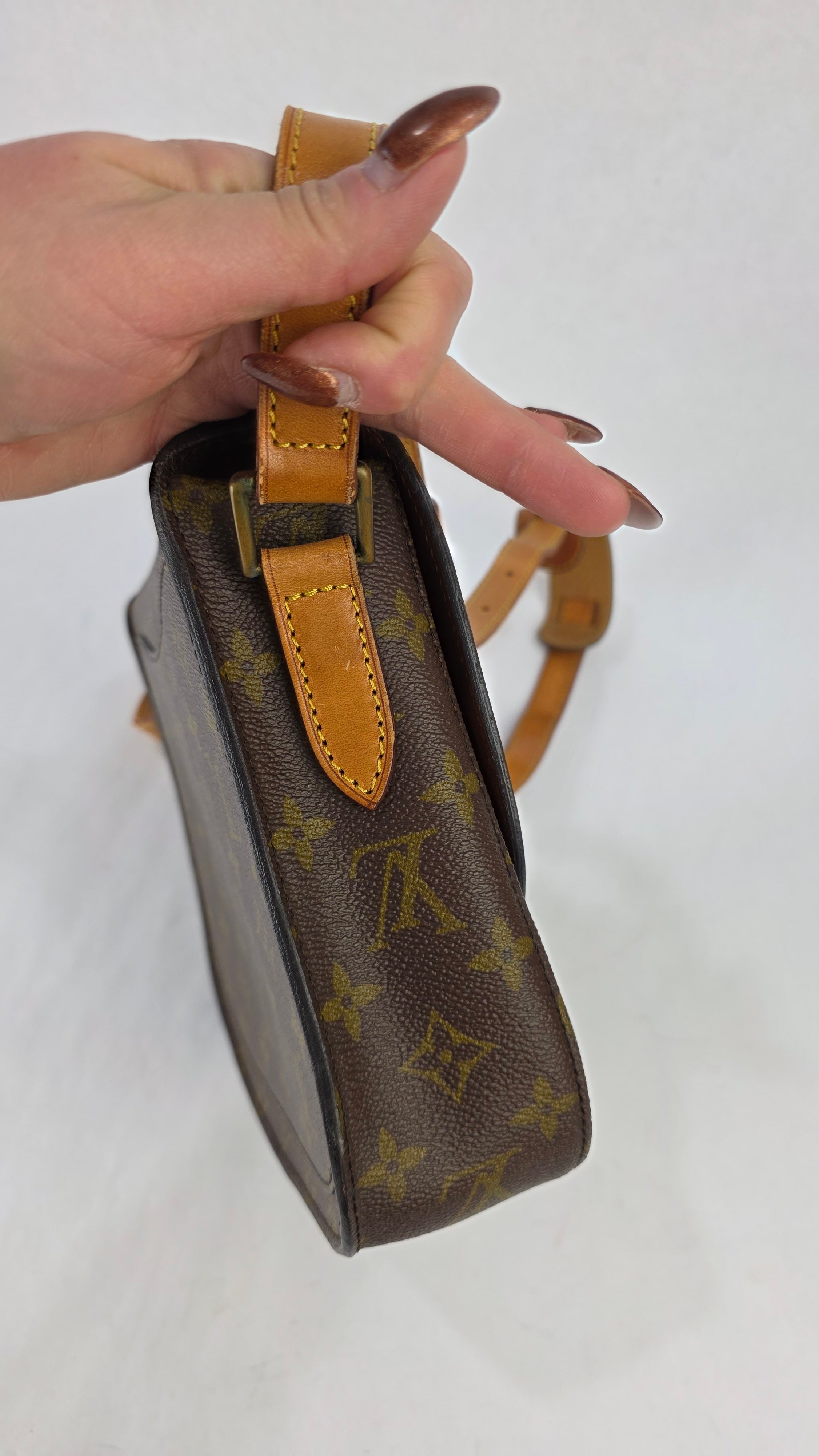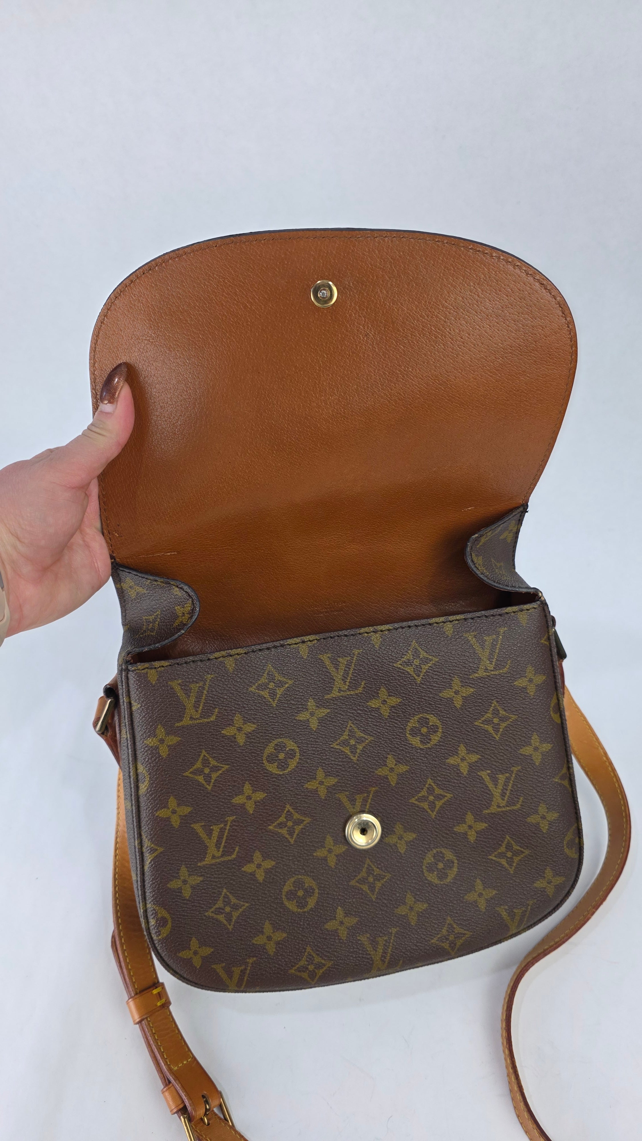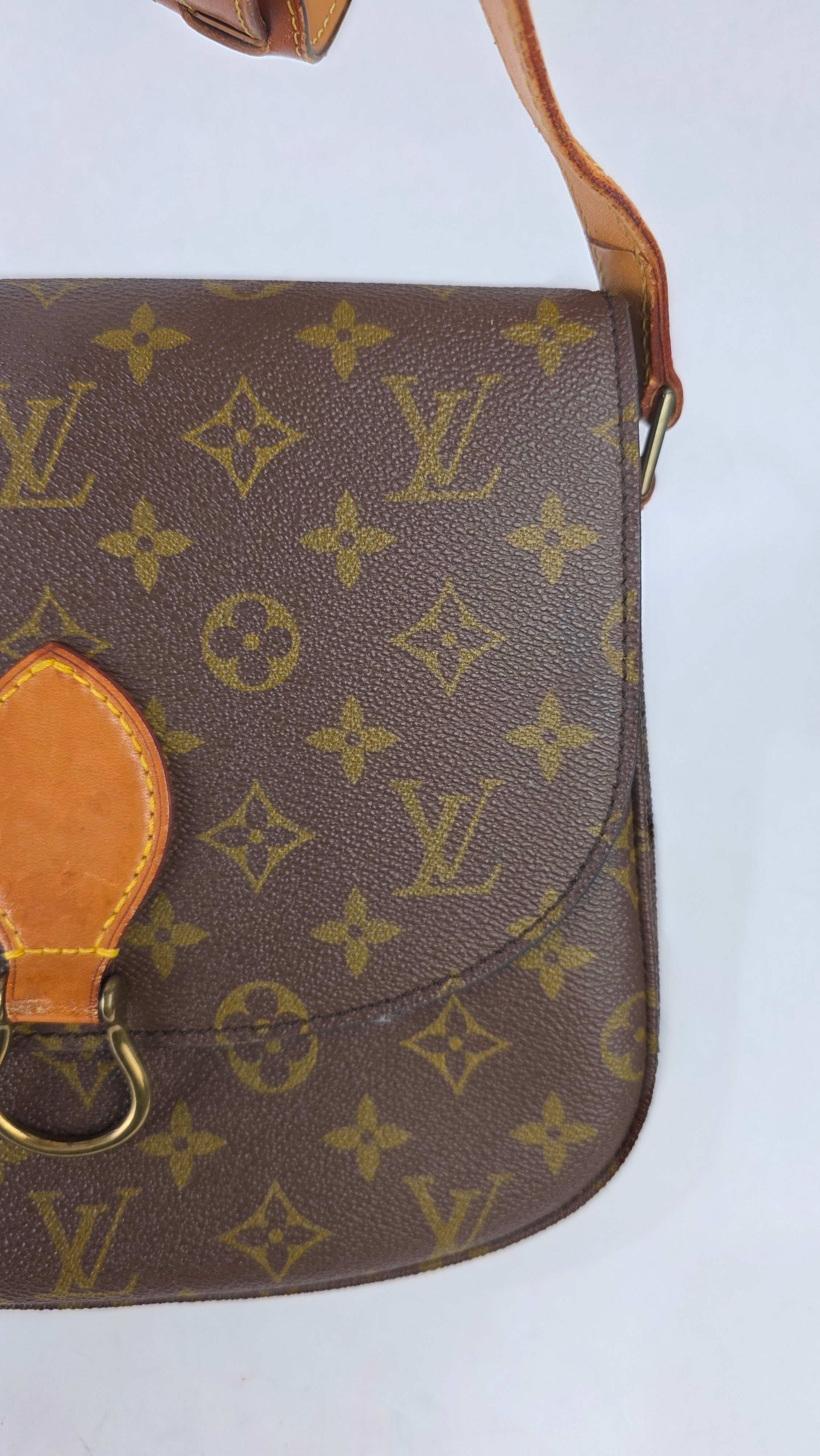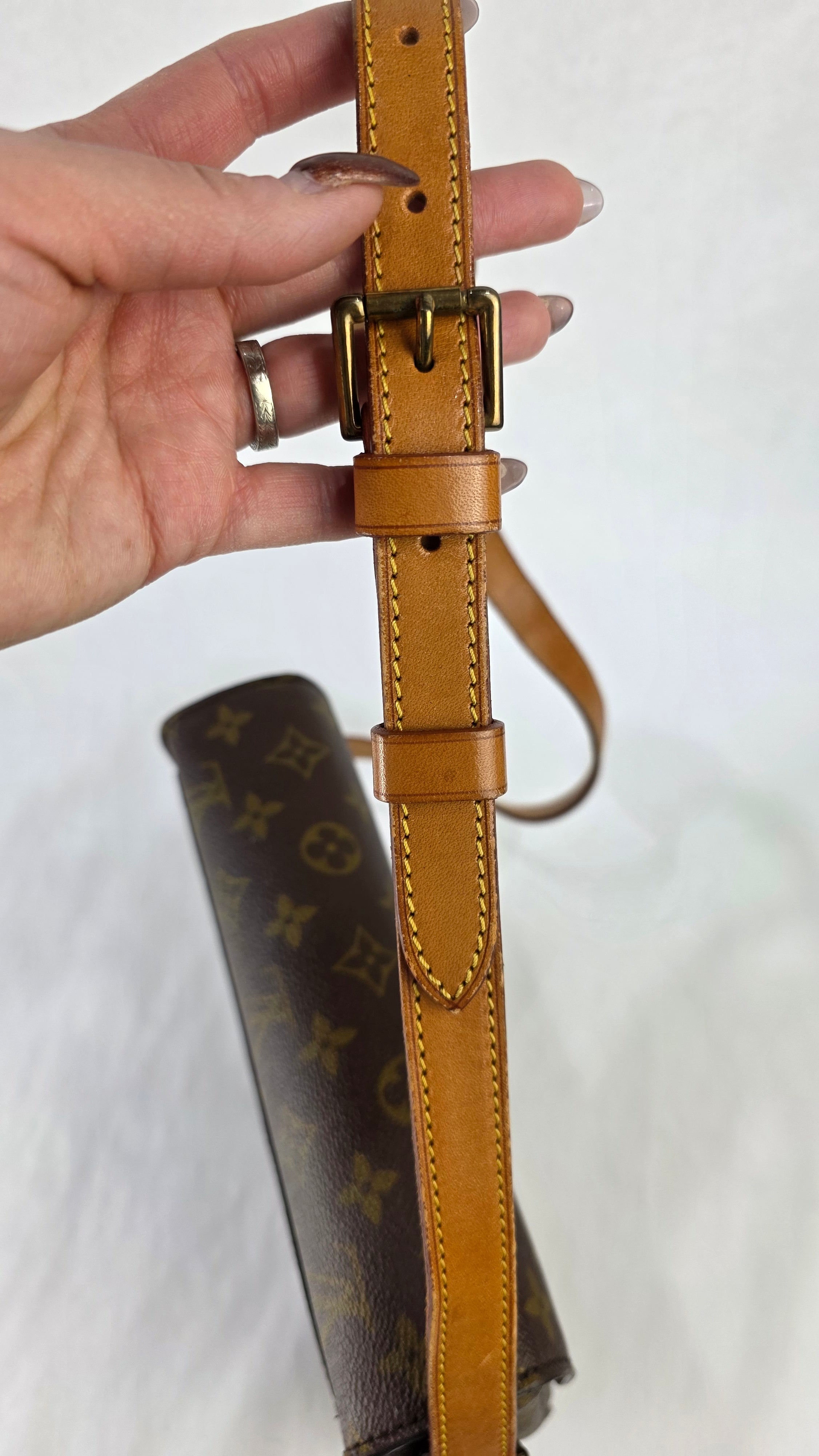 Condition details: In great vintage condition; outside monogram print is in great condition with some signs of wear. Corners and edges are in great condition with some signs of wear and rubbing in places. Leather parts and shoulder strap are in great condition with some signs of wear; shoulder strap is adjustable and has some signs of wear, some creasing, rubbing on edges and a mark near one of the previous buckle holes. Gold tone hardware has some signs of wear, snap closure and internal zipper work well. Inside is clean with some signs of wear, no foul smell.