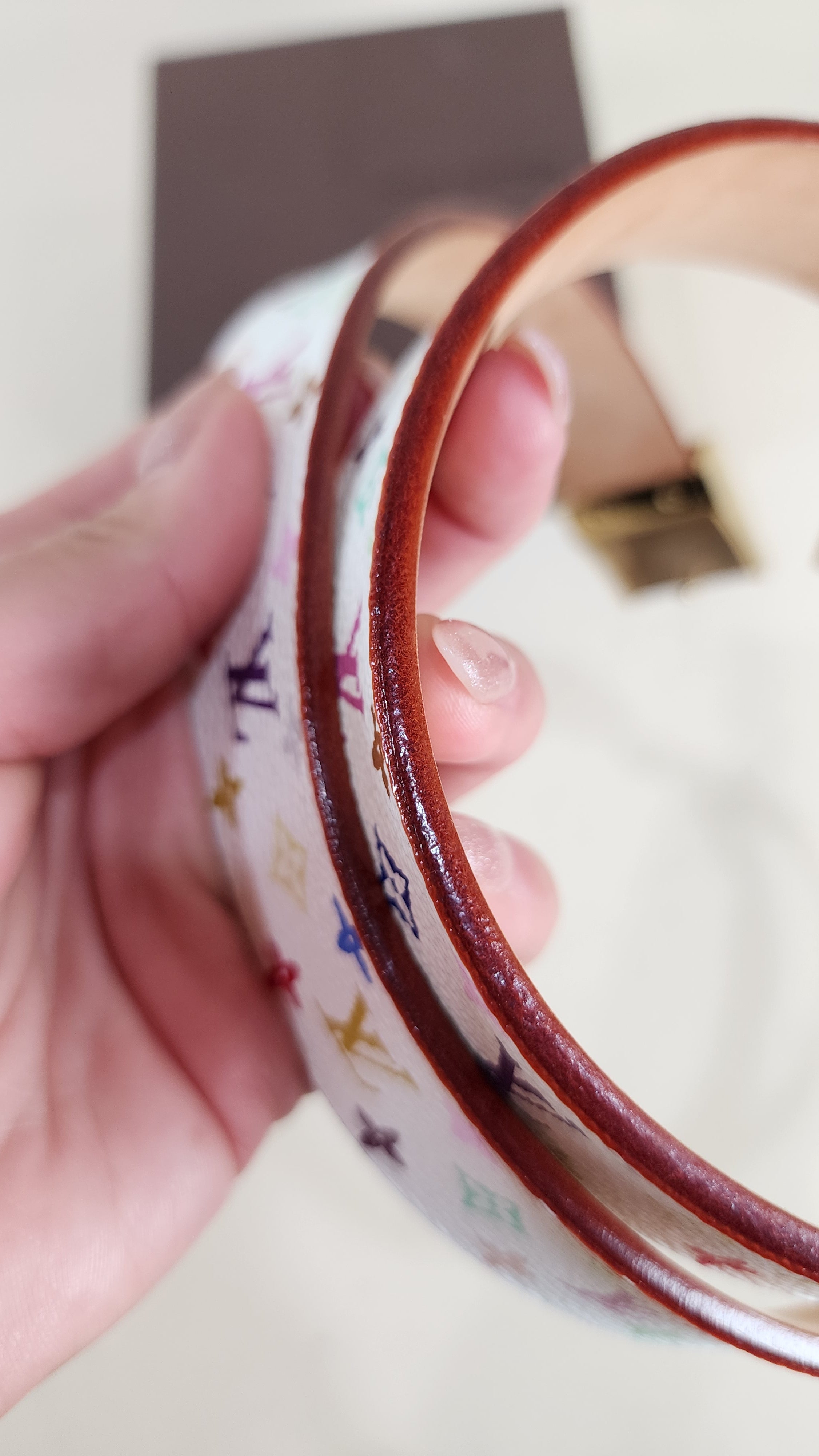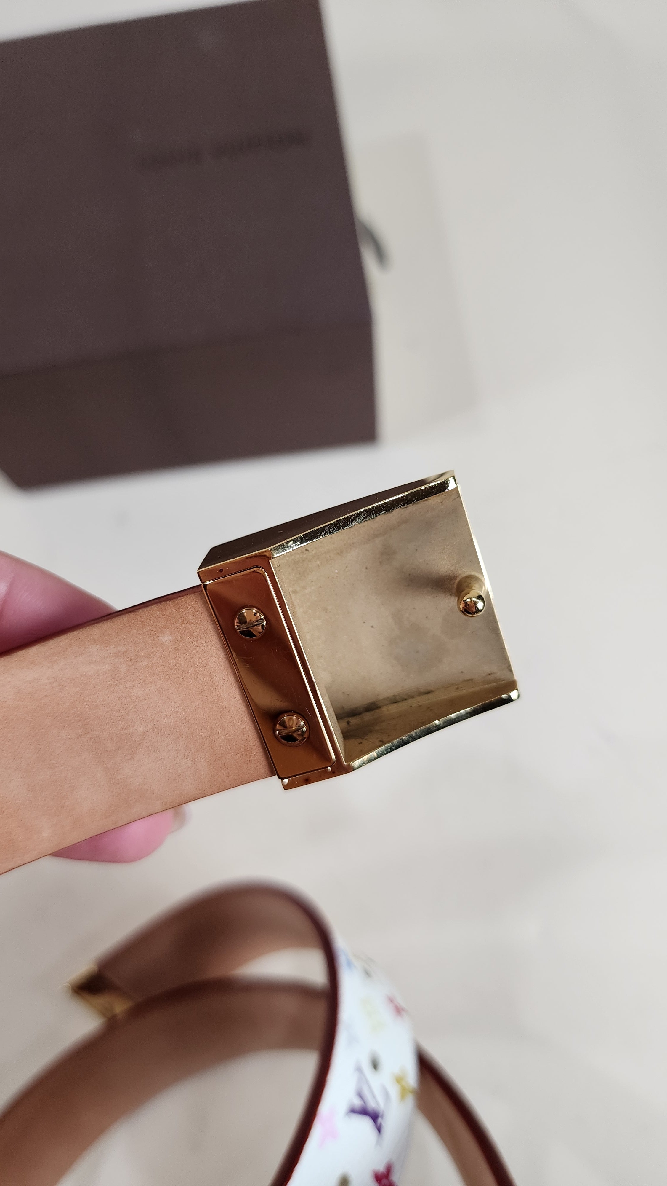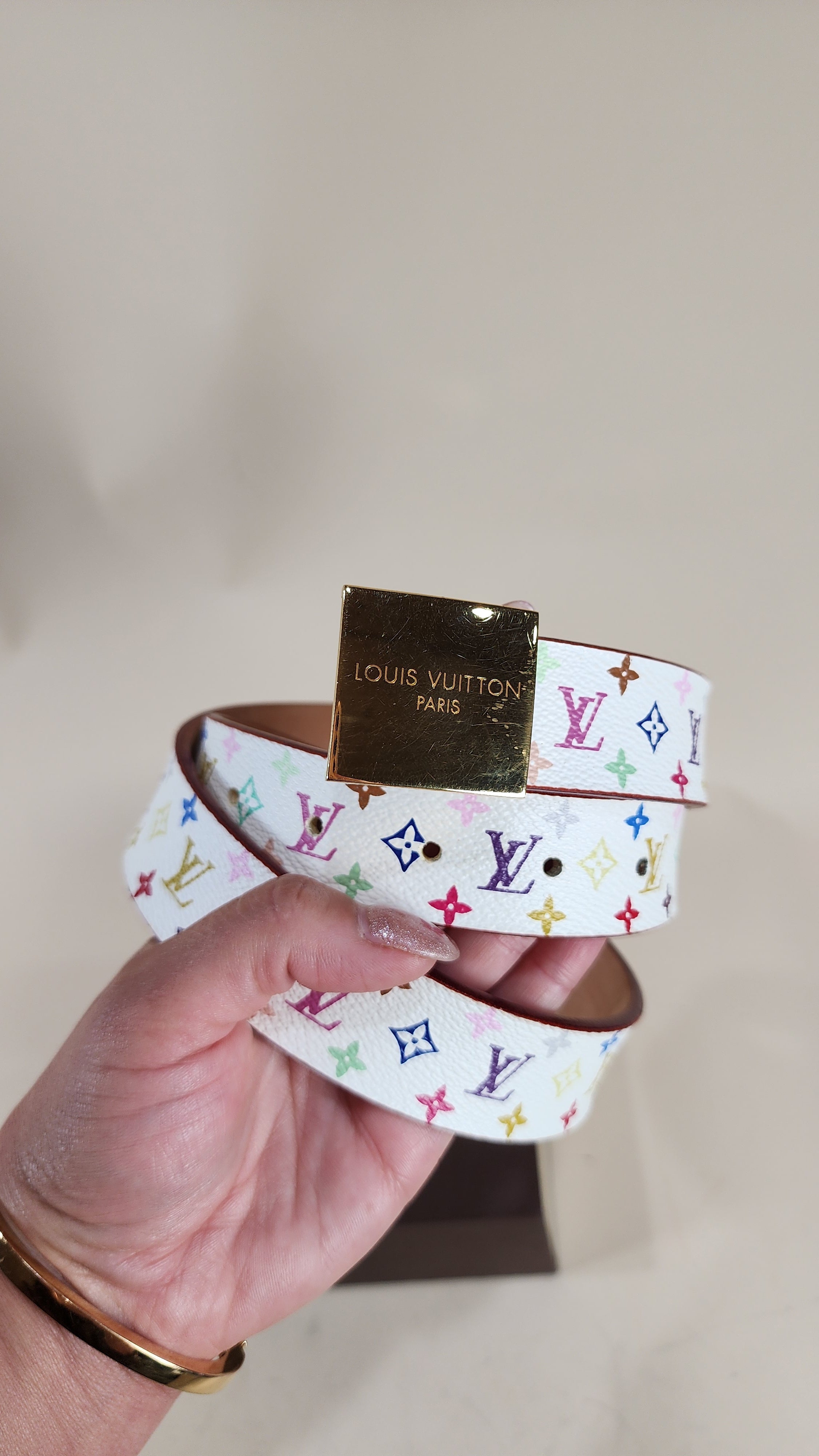 Condition details: In great condition, outside multicolor monogram print is in excellent condition with some minor signs of wear and rubbing. Inside of belt has some signs of wear and marks but in great condition. Gold buckle and hardware are in great condition with some signs of wear and surface rubs. Comes with a Louis Vuitton box.