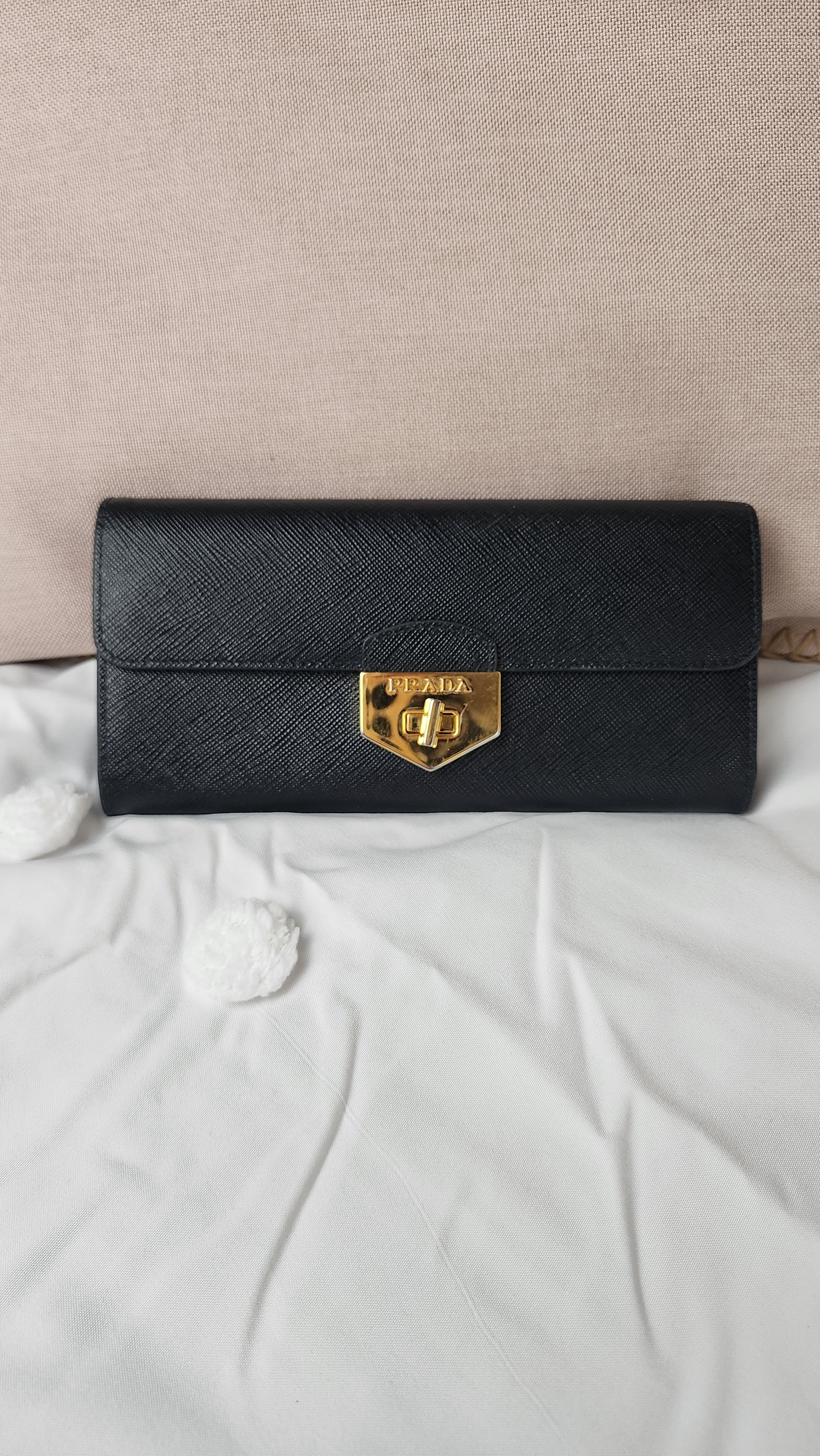 Condition details: In great condition; outside saffiano leather is in great condition with some signs of wear and rubbing. Corners are in great condition with some signs of wear. Gold toned hardware has some signs of wear in terms of rubbing and surface scratches and minor silvering, twist lock closure and internal zipper work well has some rubbing on edges. Inside is clean with some signs of wear, no foul smell.