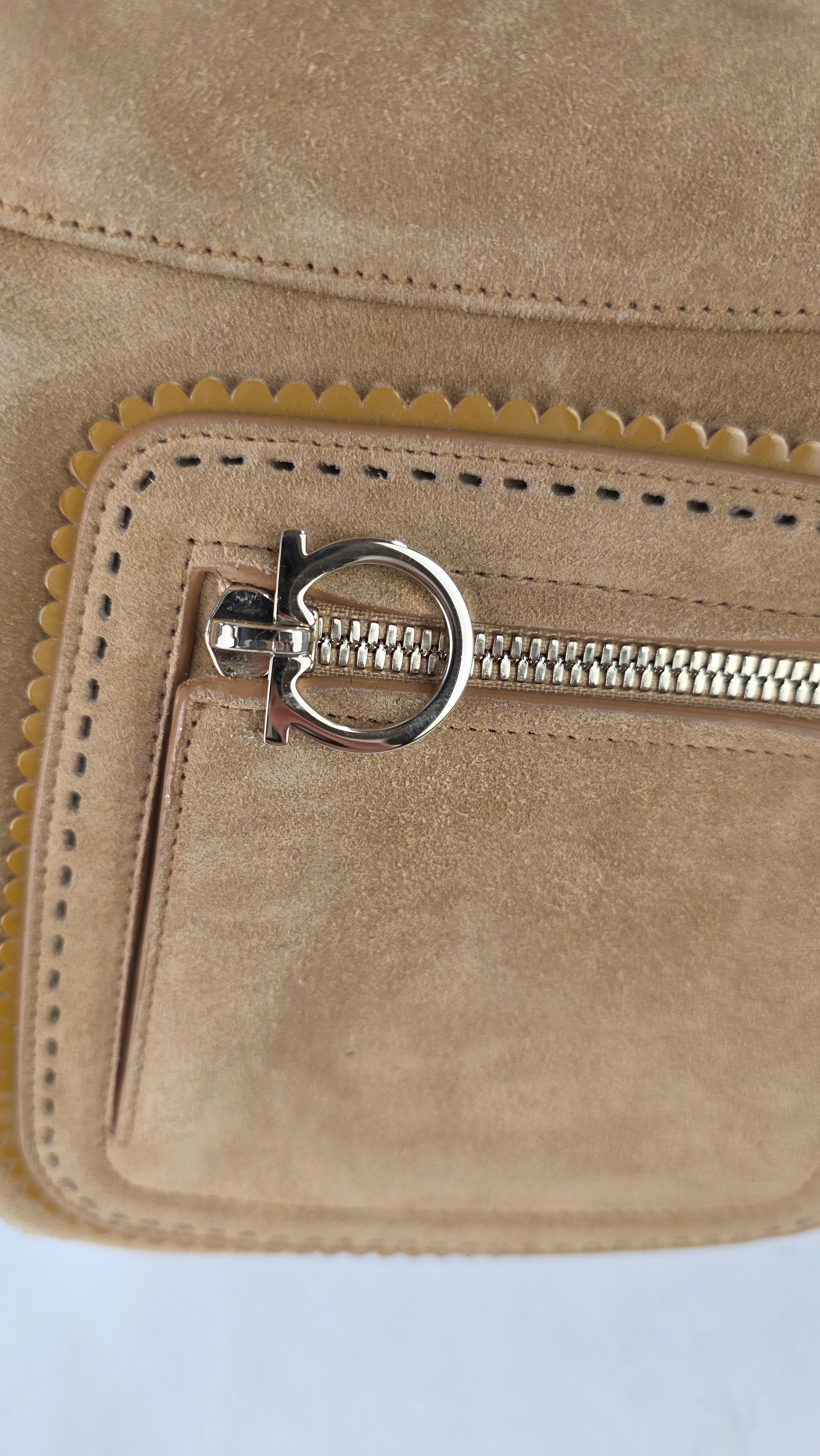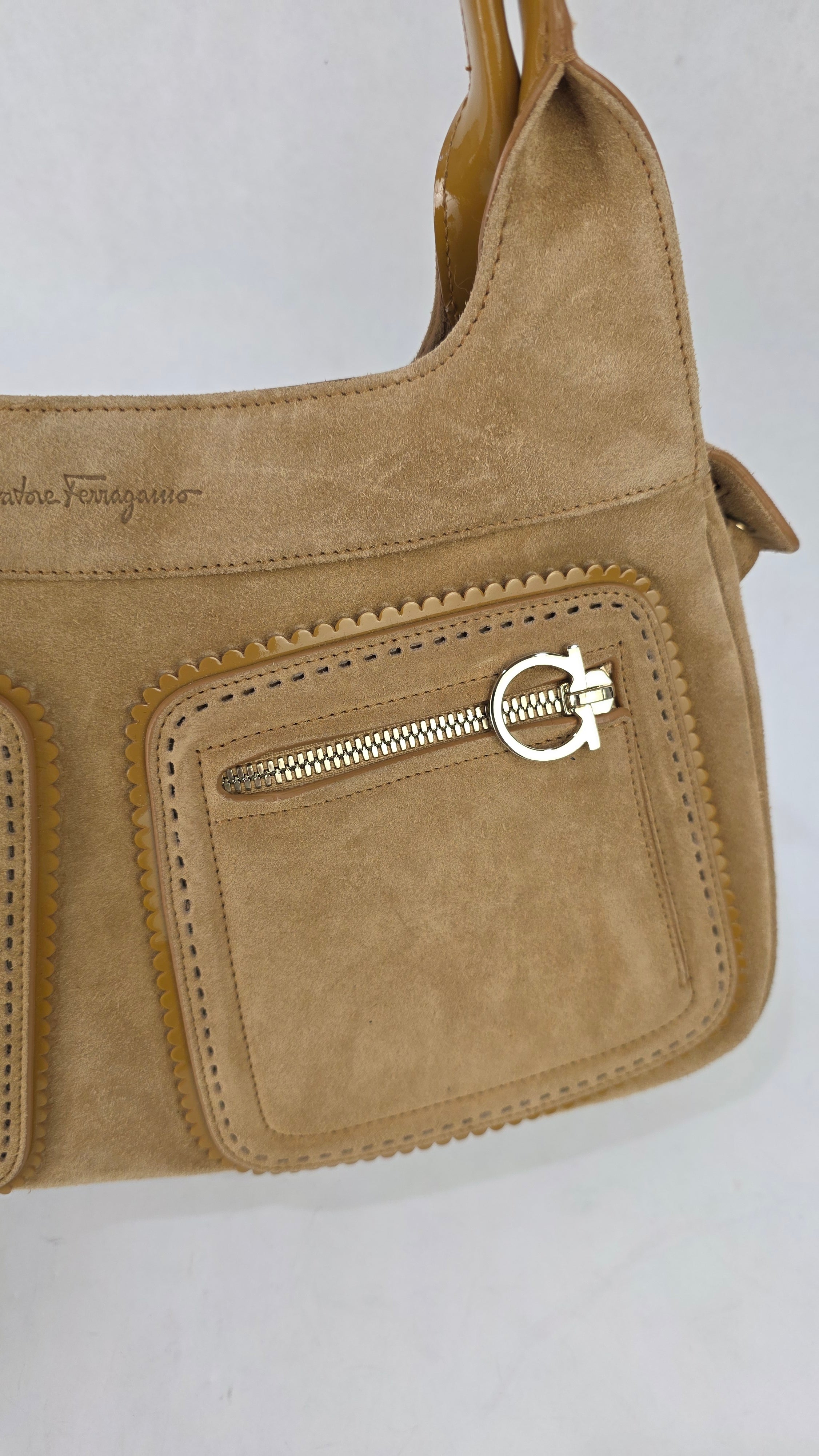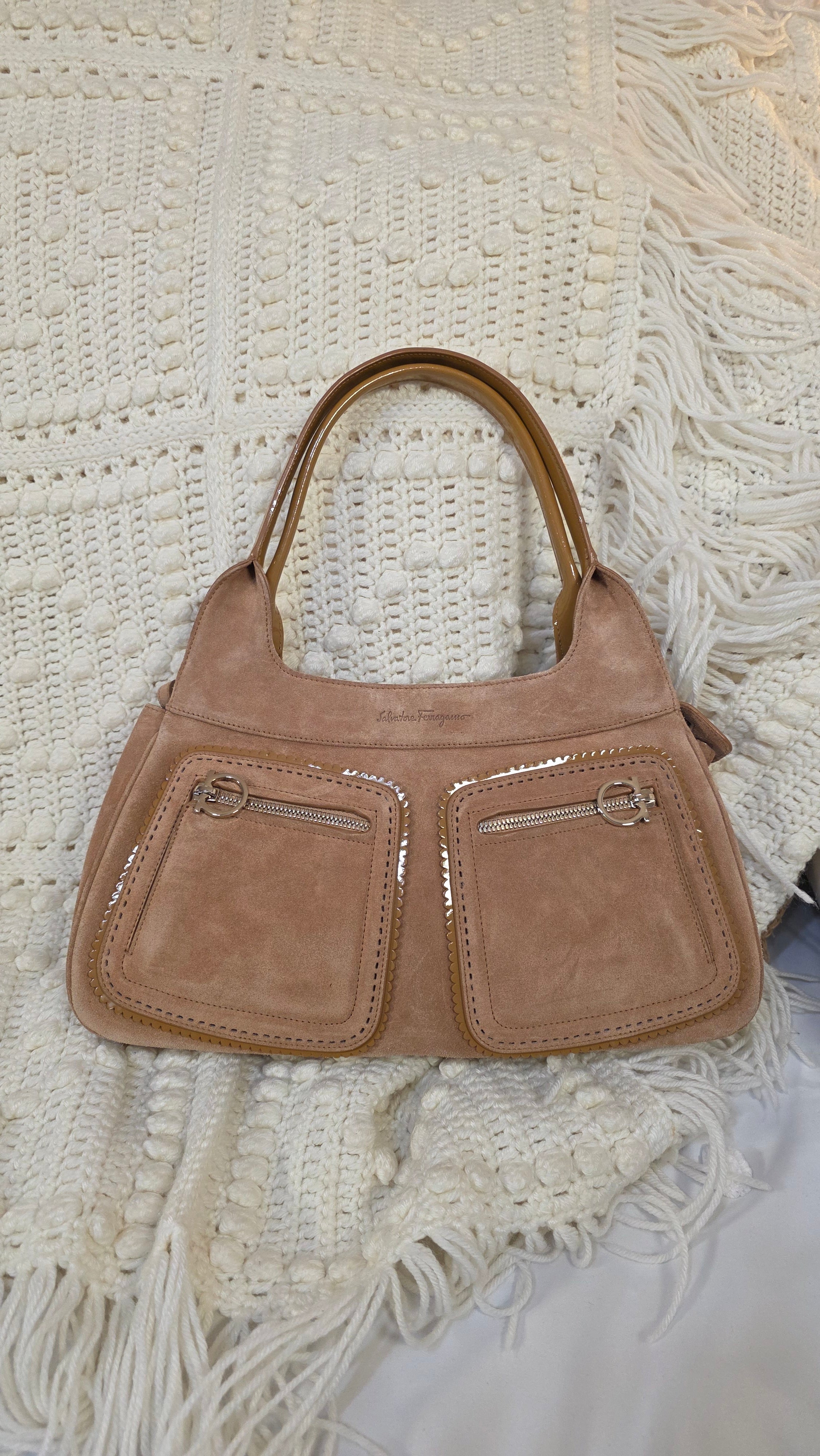Salvatore Ferragamo Gancini Tan Suede Shoulder Bag