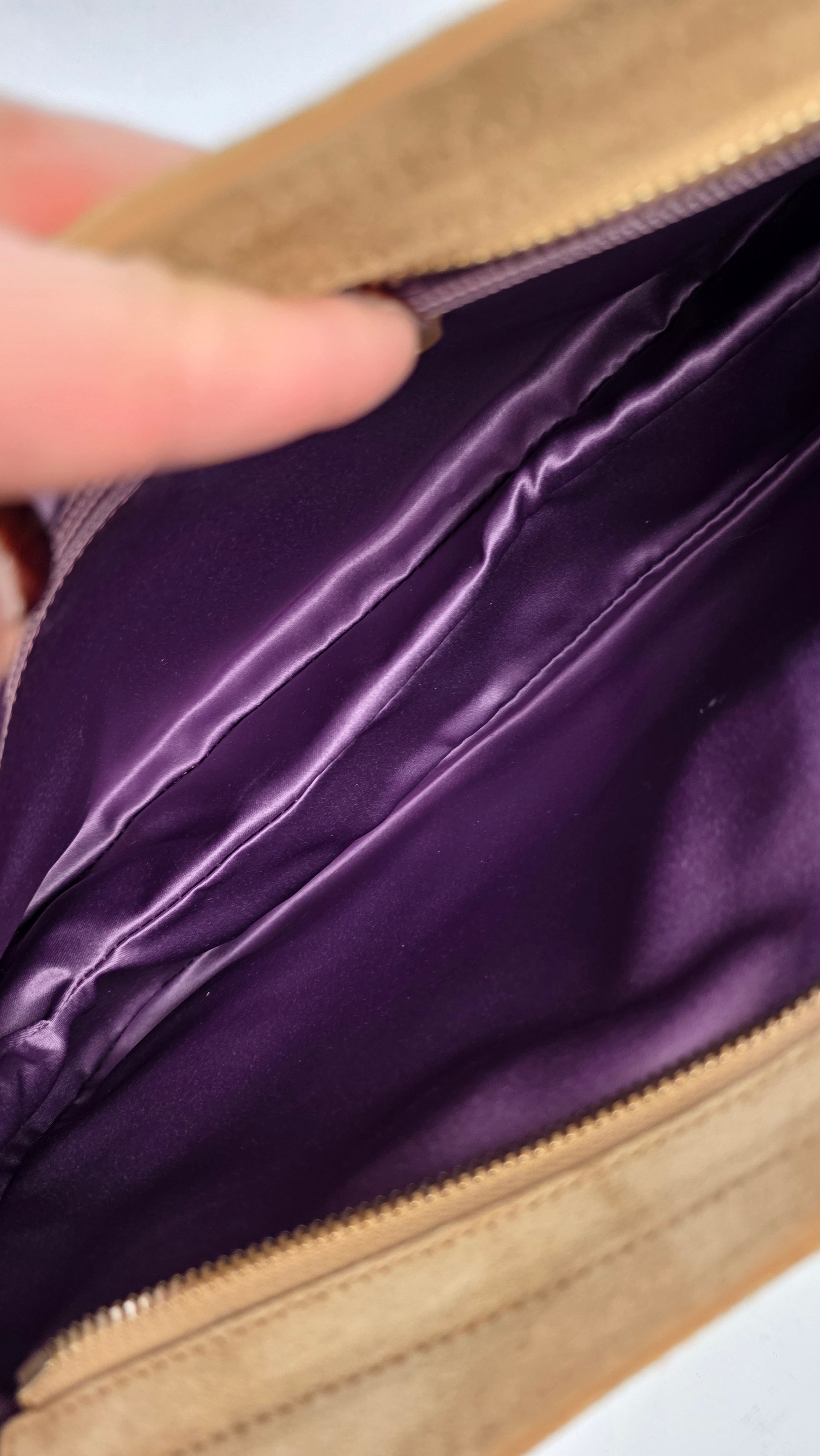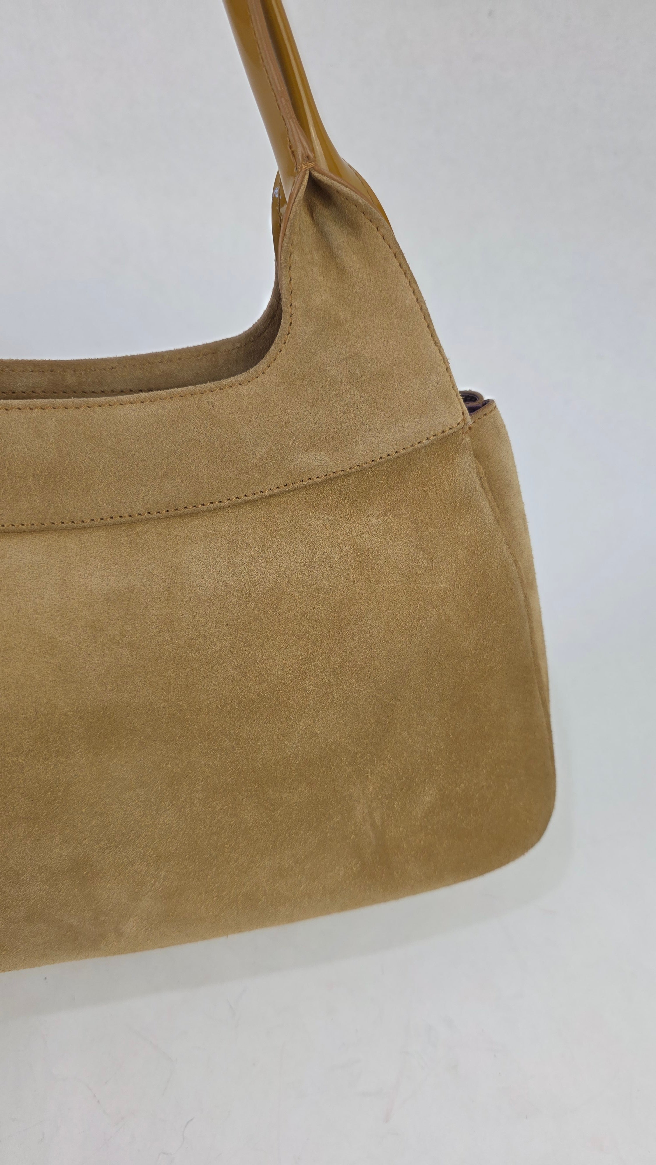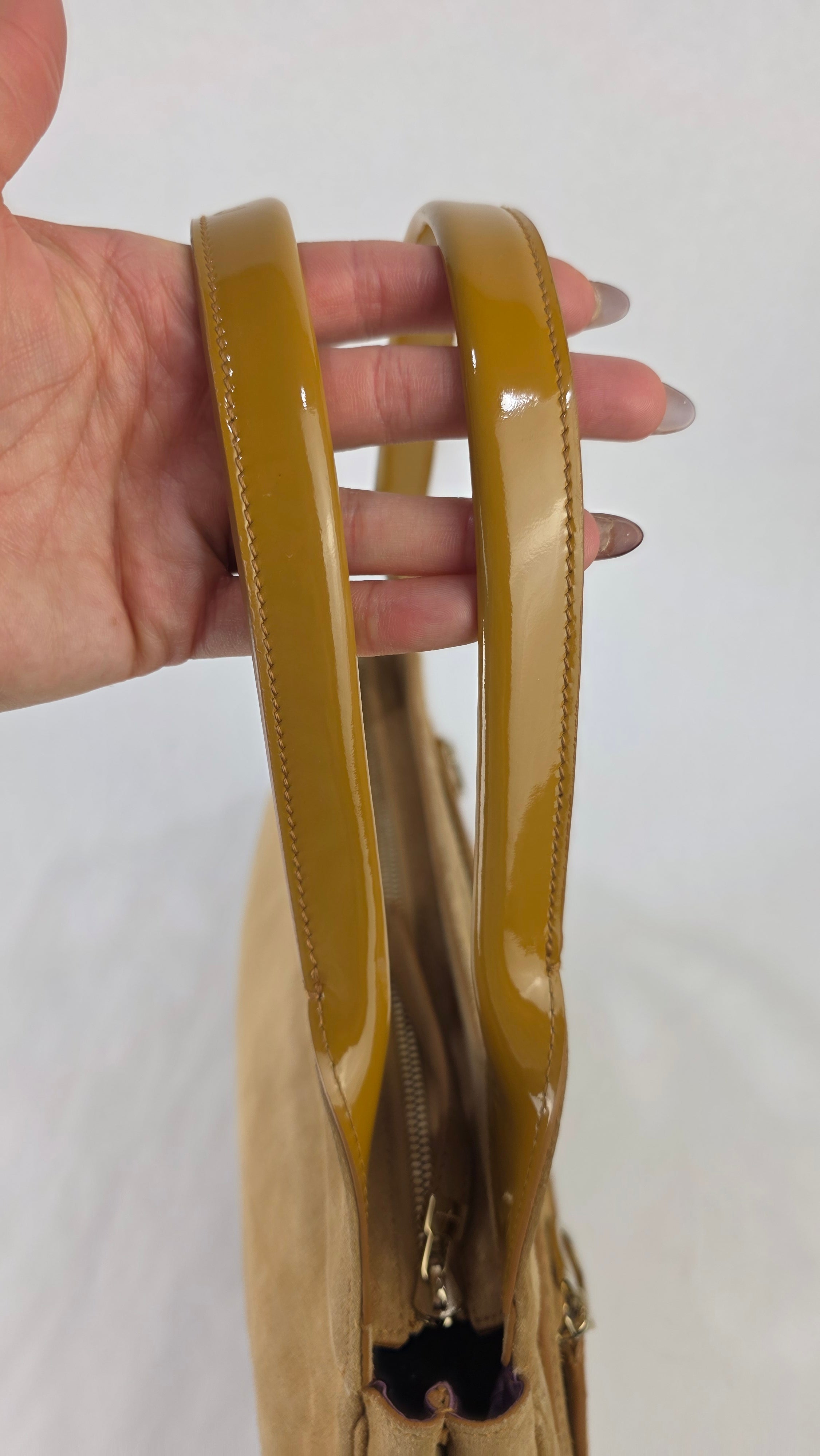 Condition details: In great condition; outside suede is in great condition with some signs of wear. Corners and edges are in great condition with some signs of wear. Patent leather double handles are in great condition with some signs of wear and a marks on the patent leather there is also a tiny piece that has been repaired. Gold tone hardware has some signs of wear and rubbing, but overall great condition; zippers work well. Inside purple sating fabric is clean, slight storage smell, no foul smell.