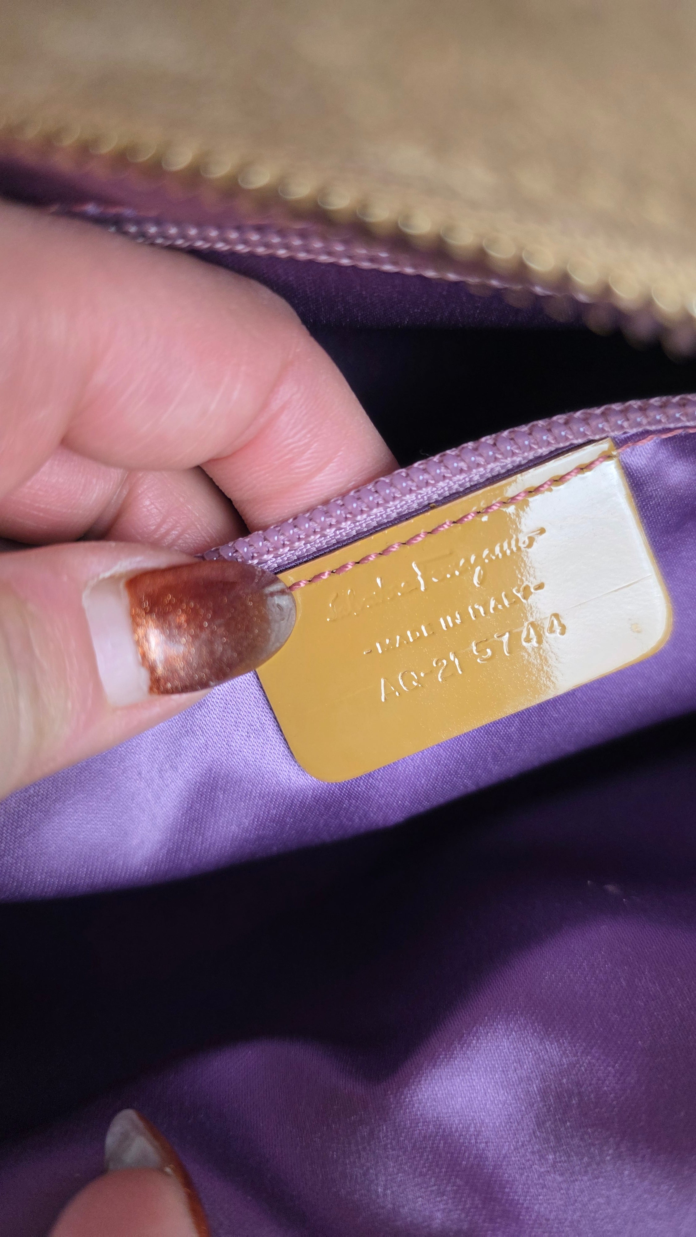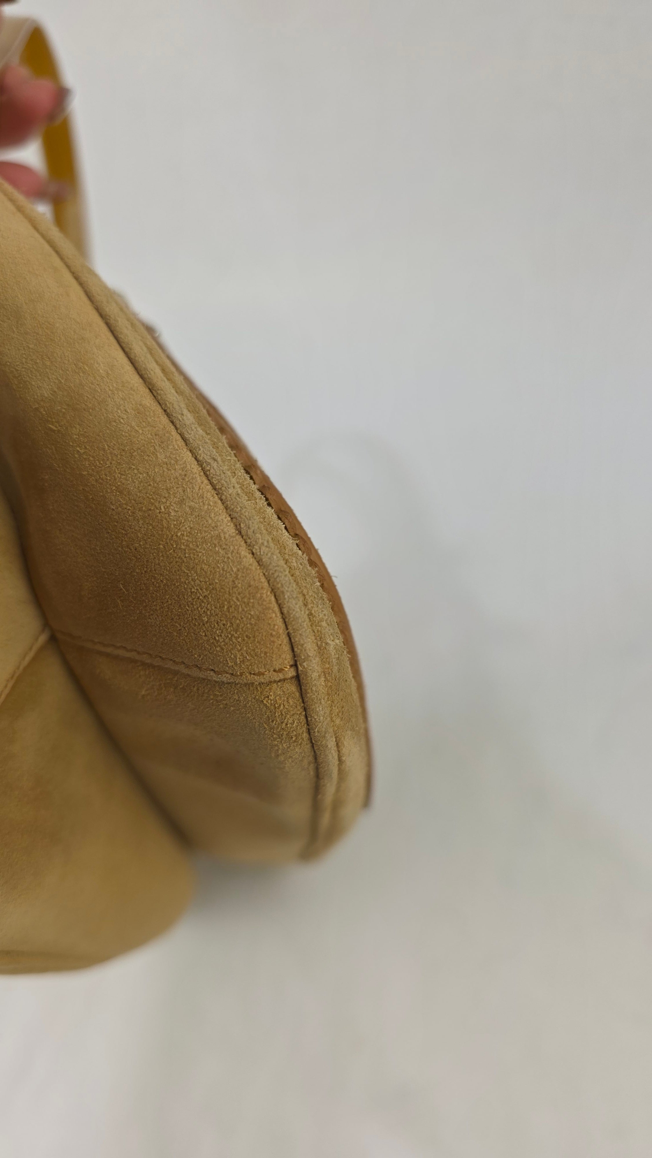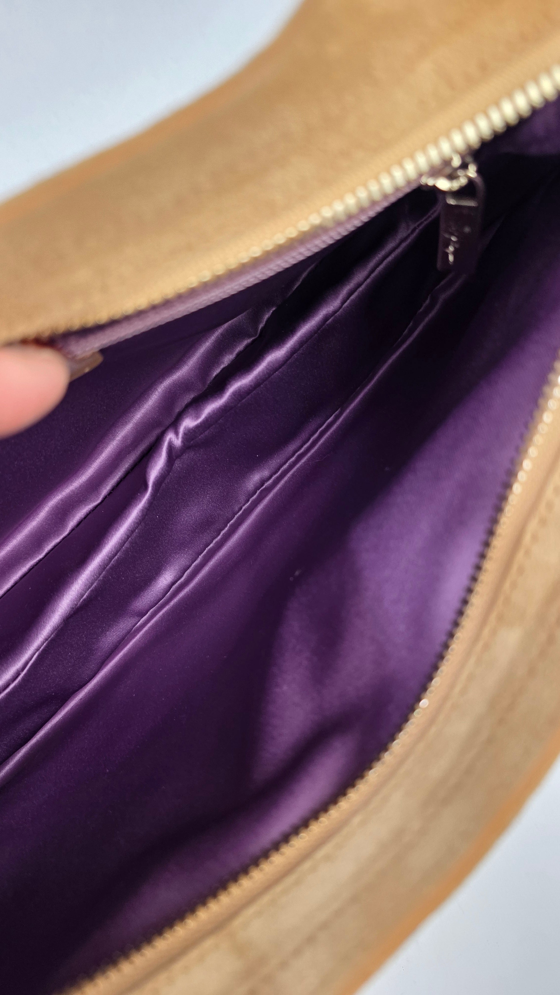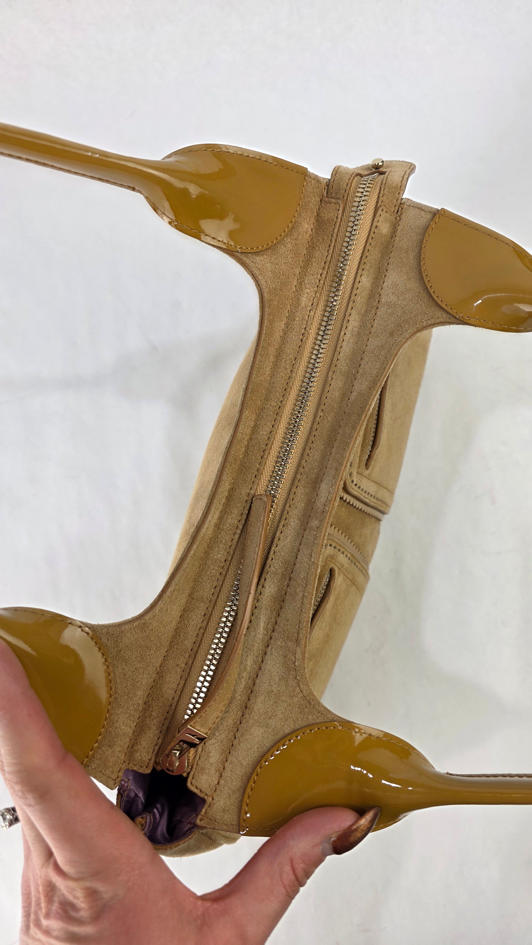 Condition details: In great condition; outside suede is in great condition with some signs of wear. Corners and edges are in great condition with some signs of wear. Patent leather double handles are in great condition with some signs of wear and a marks on the patent leather there is also a tiny piece that has been repaired. Gold tone hardware has some signs of wear and rubbing, but overall great condition; zippers work well. Inside purple sating fabric is clean, slight storage smell, no foul smell.