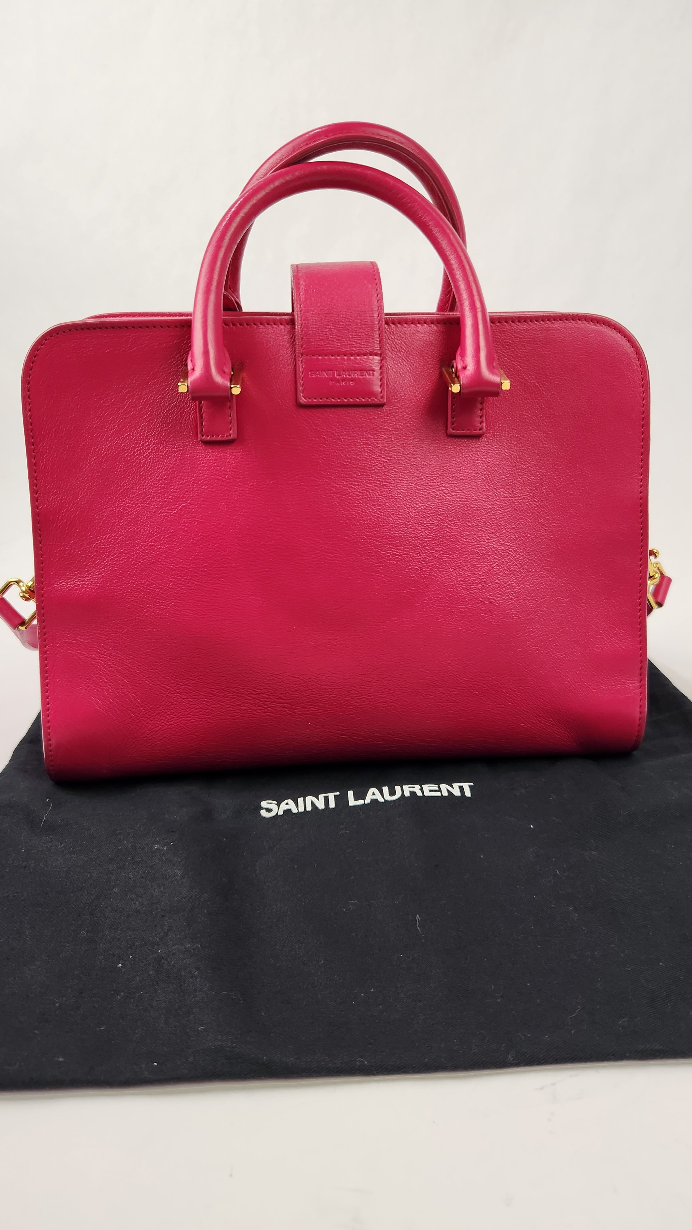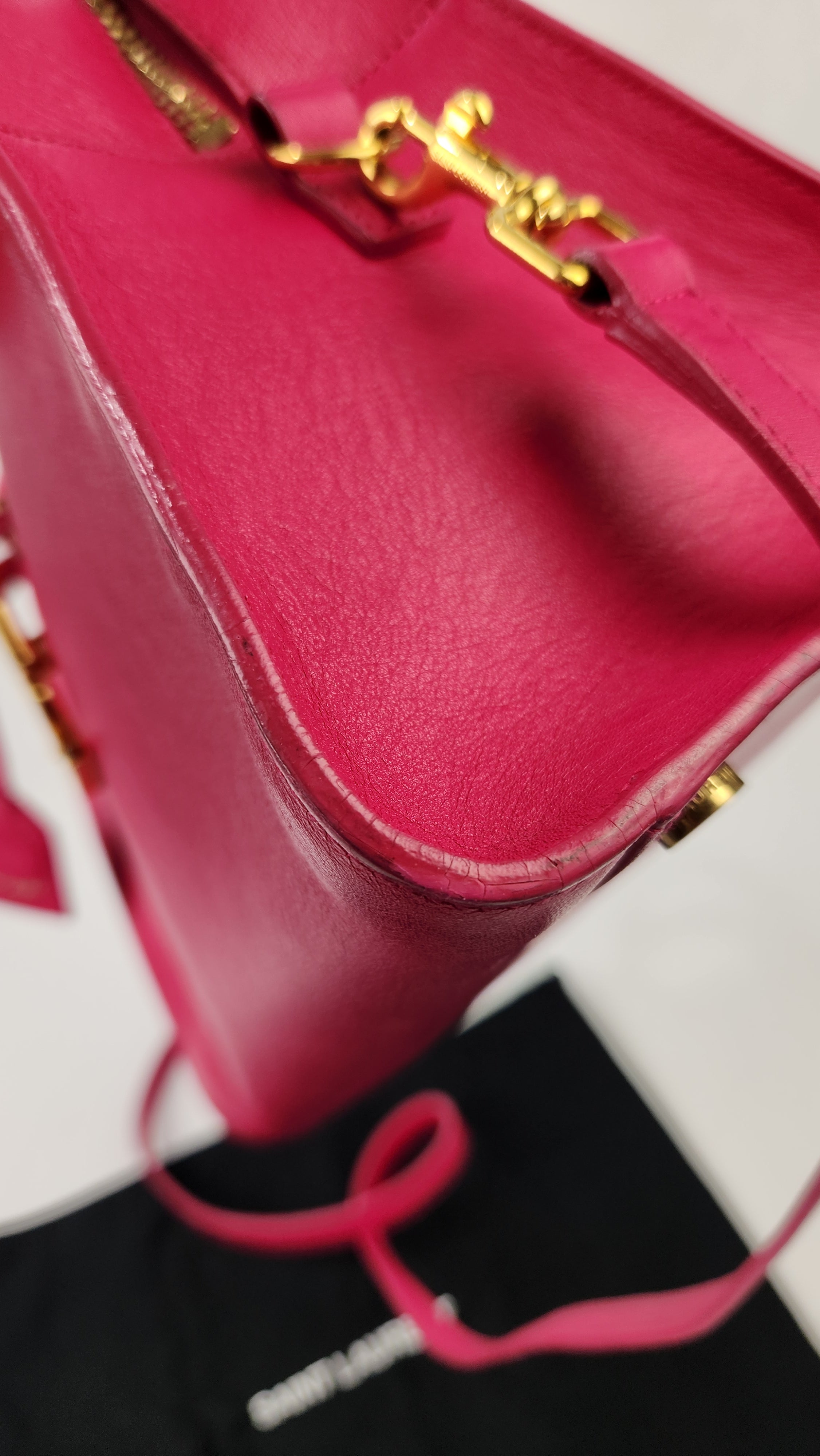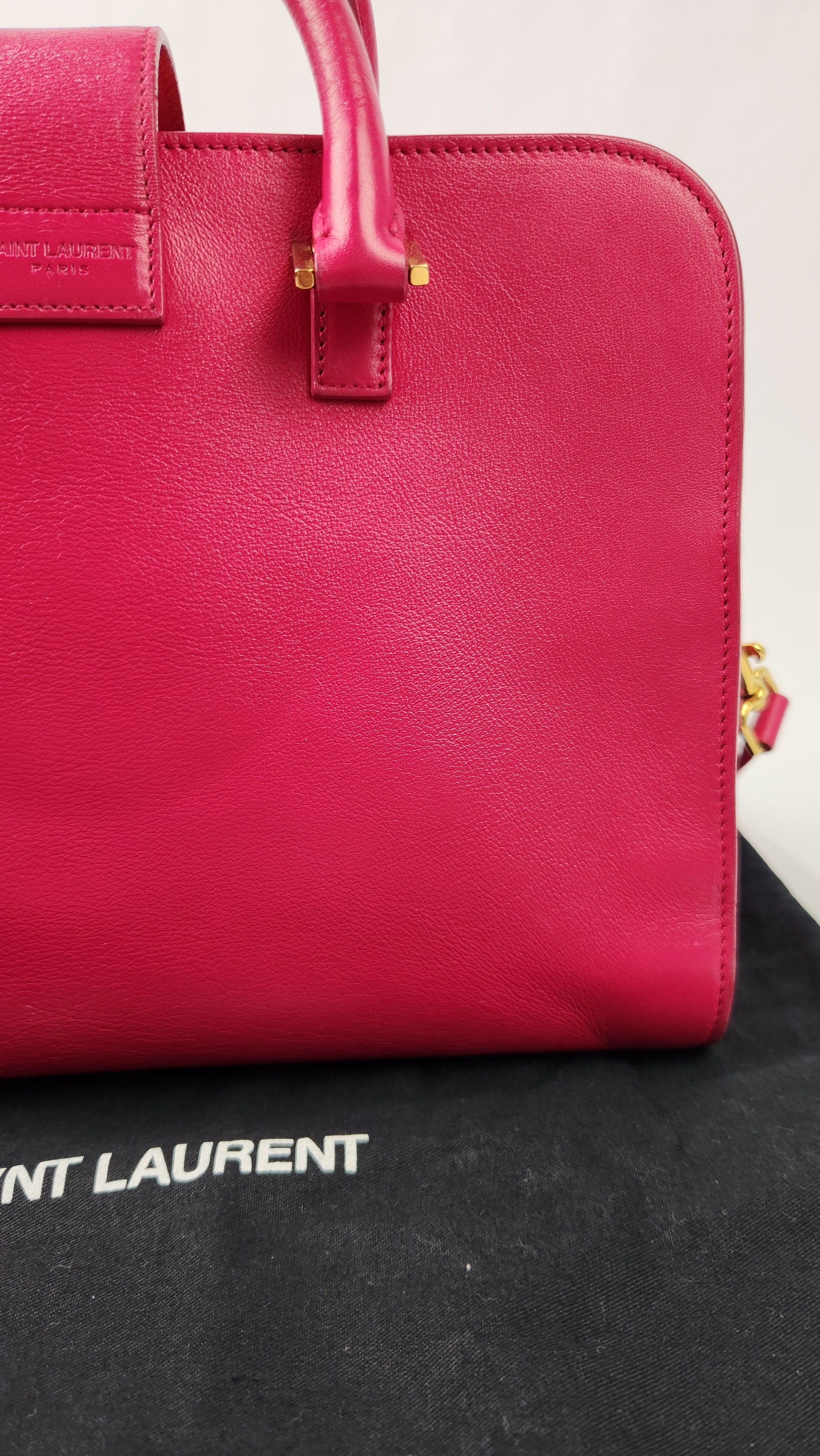 Condition details: In great condition; outside leather is in great condition with some signs of wear and rubbing, there is an indentation mark on the front leather from the metal YSL. Corners and edges are in great condition with some signs of wear and some creasing and cracking to glazing in some areas. Double handles are in great condition with some signs of wear; removable leather shoulder strap is in great condition with some signs of wear. Gold tone hardware is in great condition with some signs of wear, magnetic closure and zipper work well. Inside is clean with some signs of wear, no foul smell. Comes with a YSL dustbag.